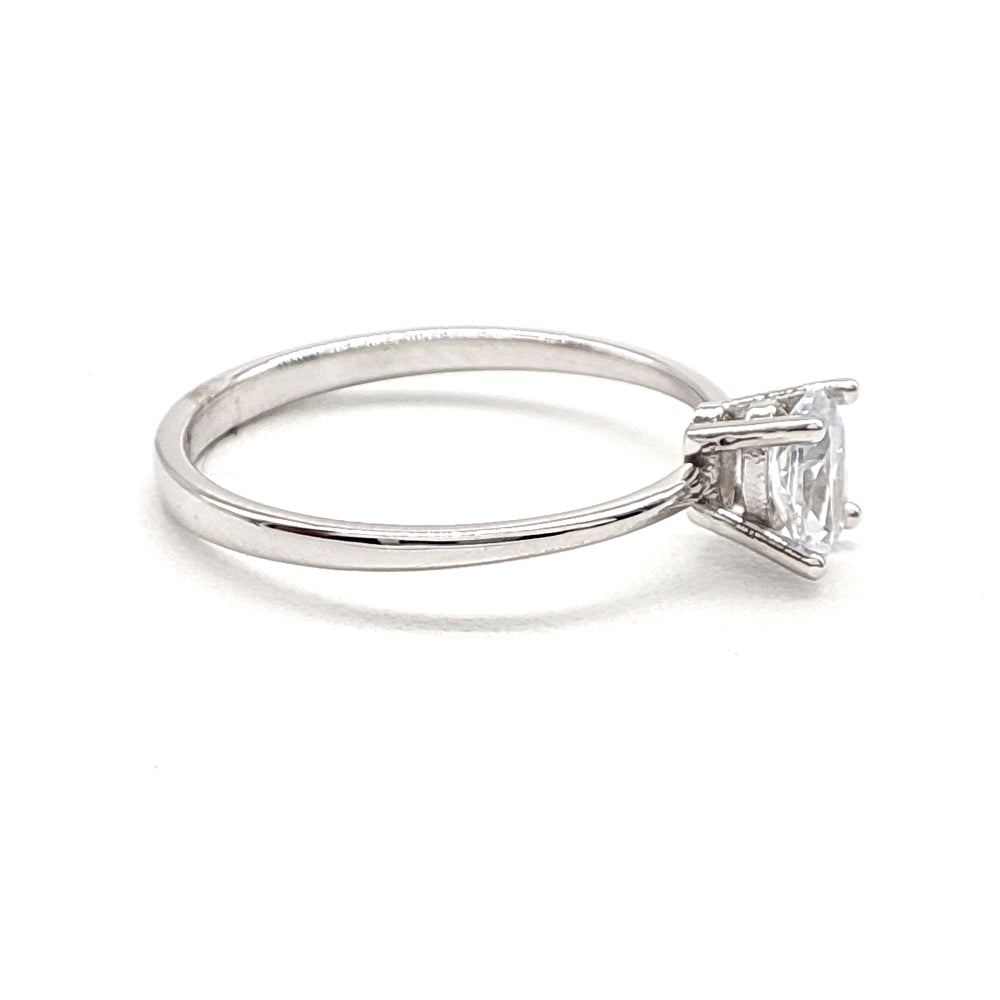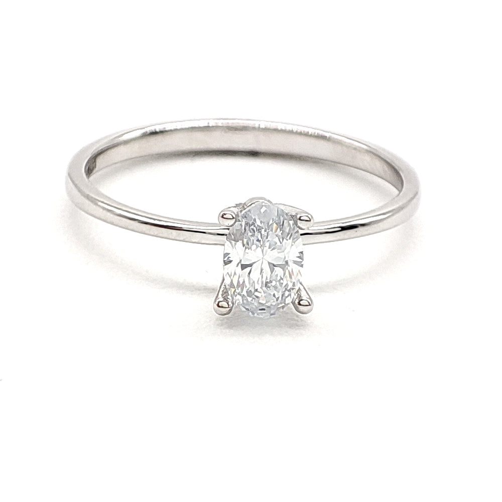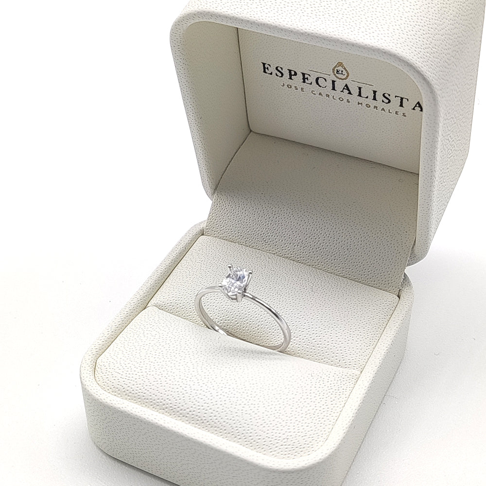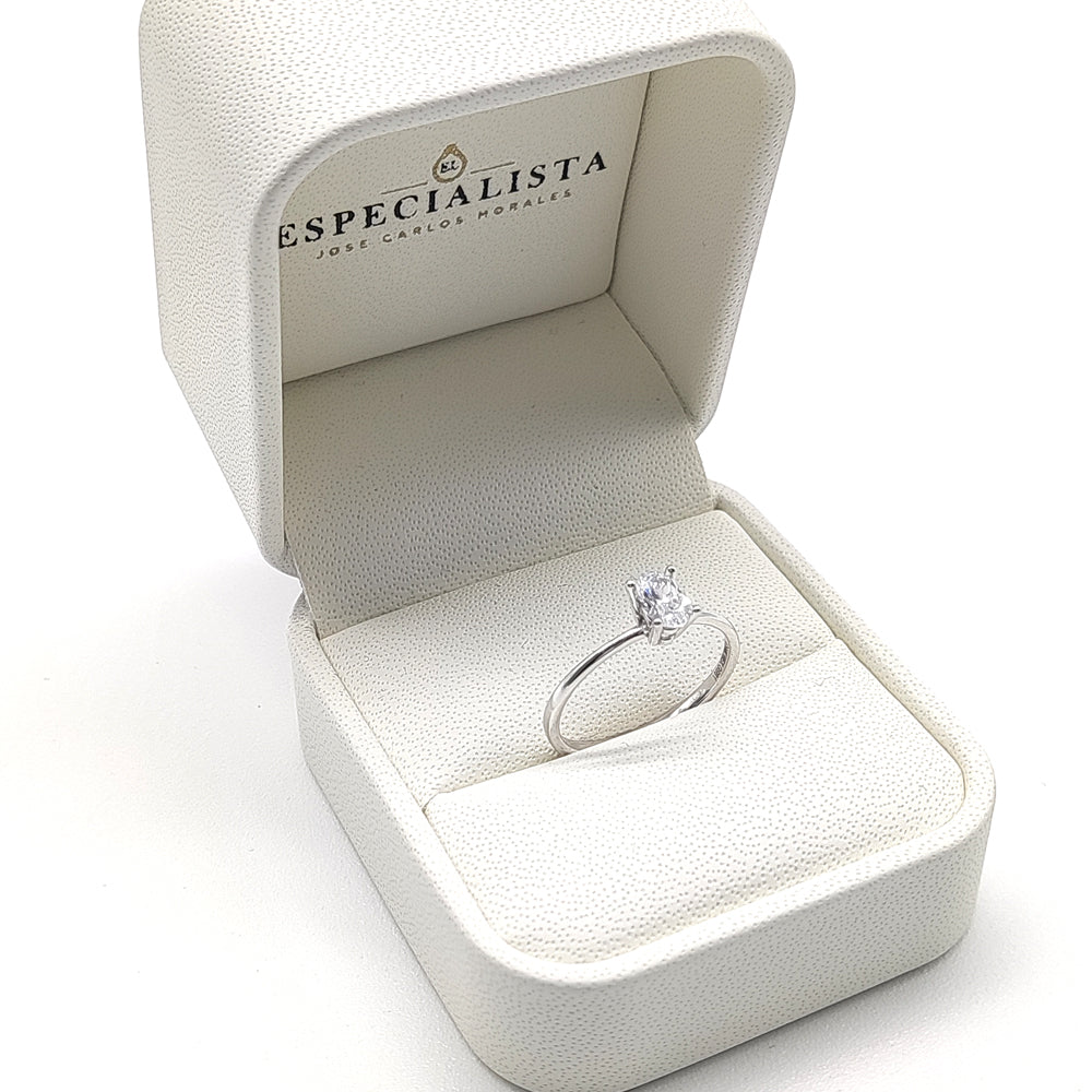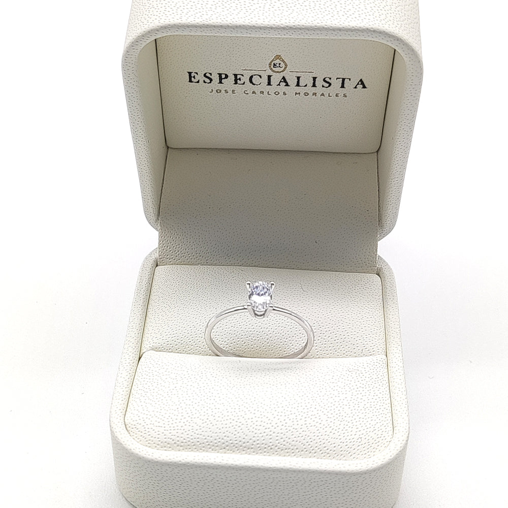 Anillo de compromiso en oro blanco de 14 kilates con piedra oval.