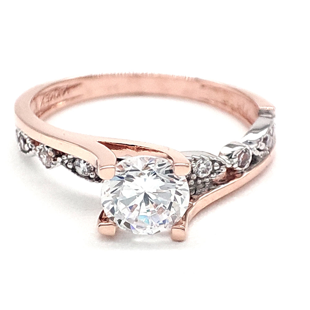 Anillo de compromiso en oro rosa con detalles blancos de 14 kilates.