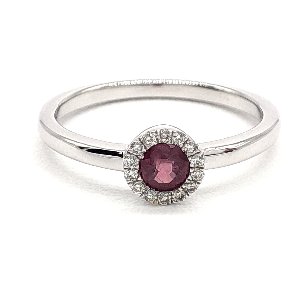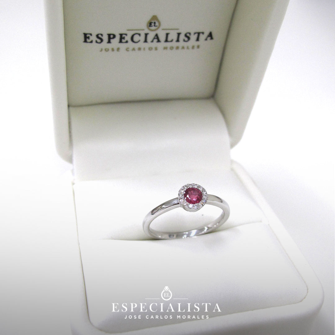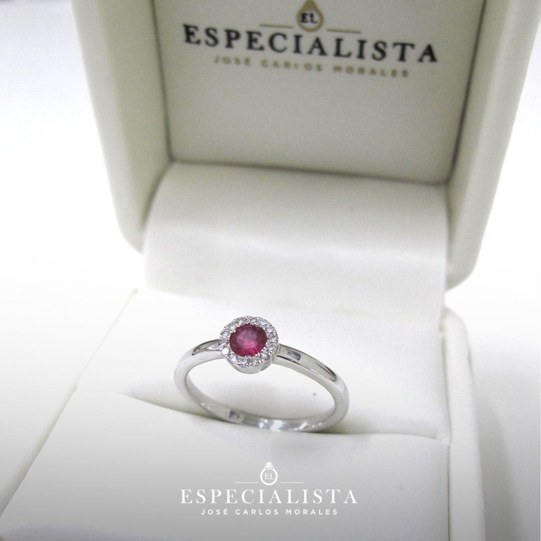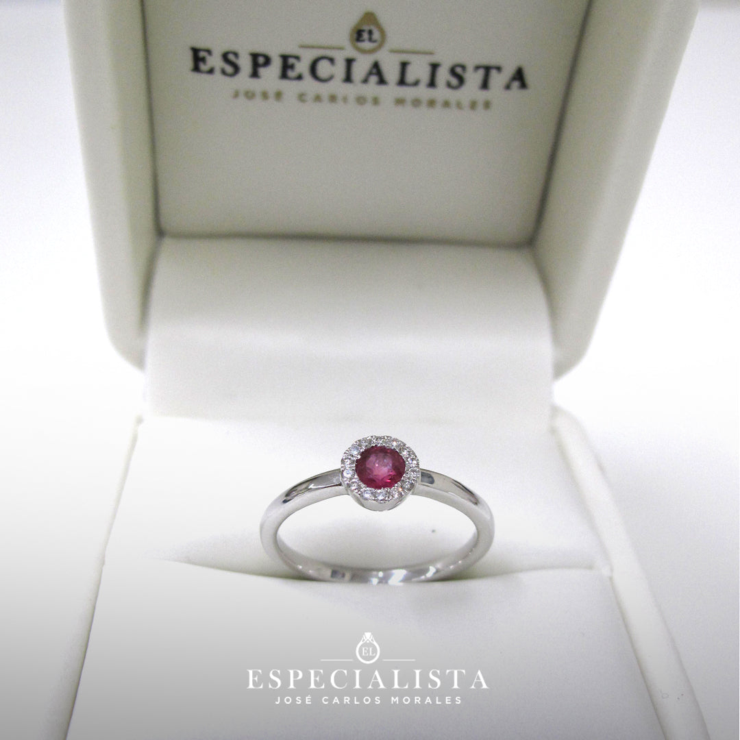 Anillo de Compromiso en oro blanco de 14 Kilates con Rubí y Diamantes.