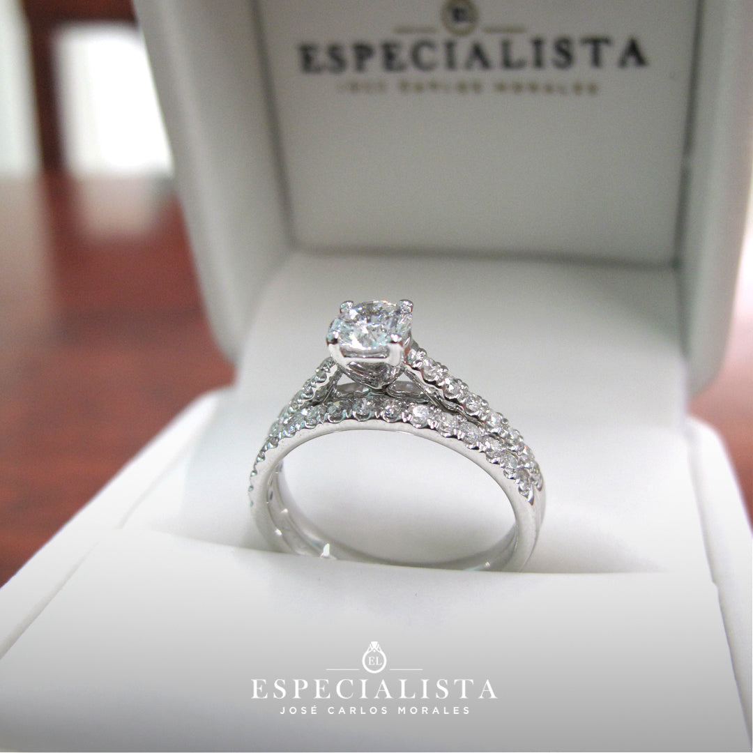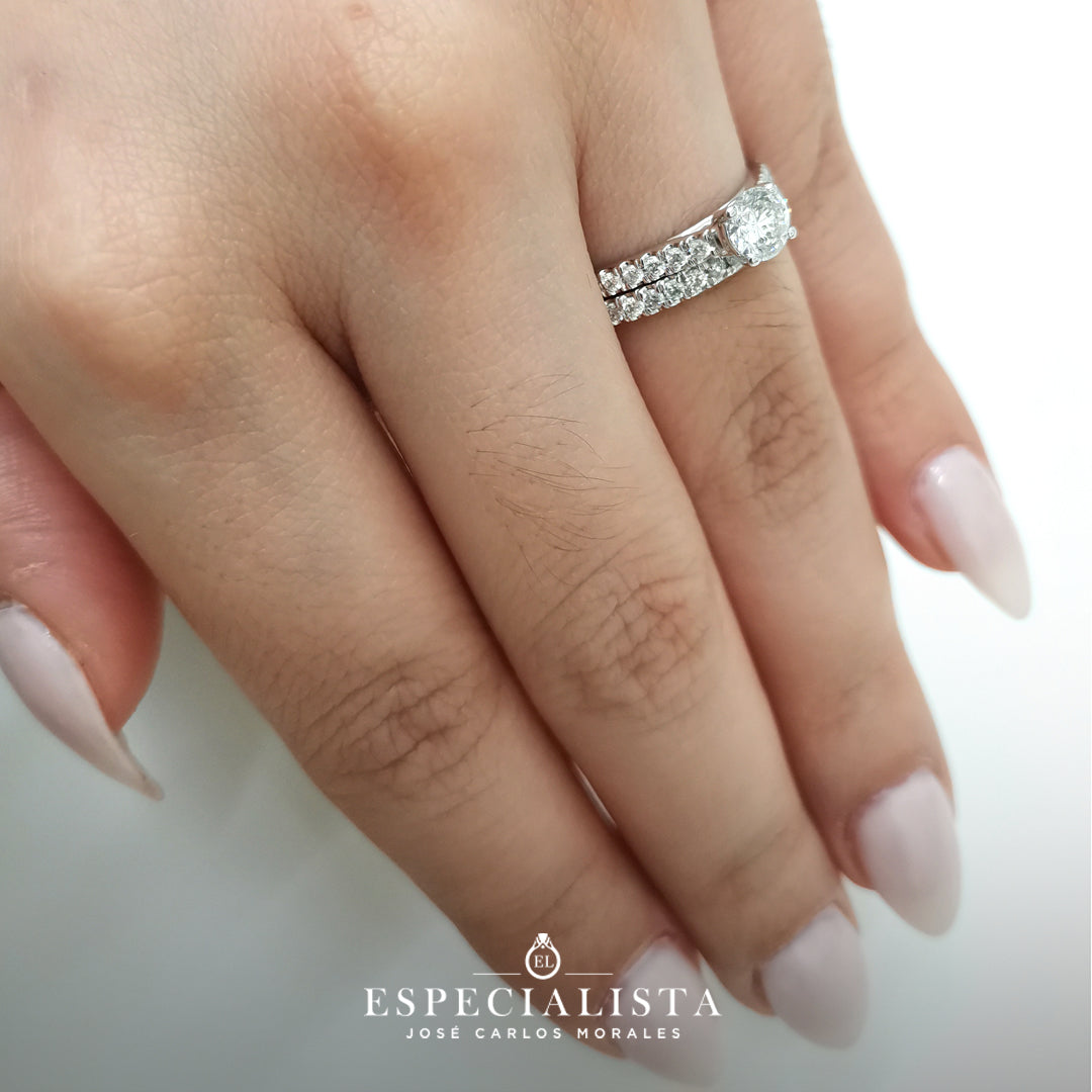 Anillo de compromiso con churumbela, montado en oro blanco de 14 Kilates con diamantes naturales.