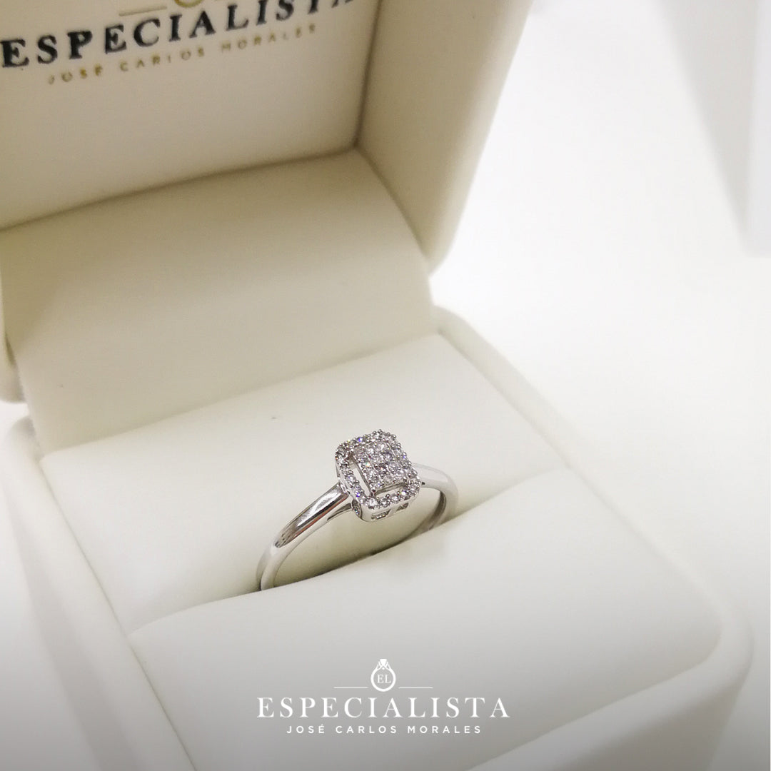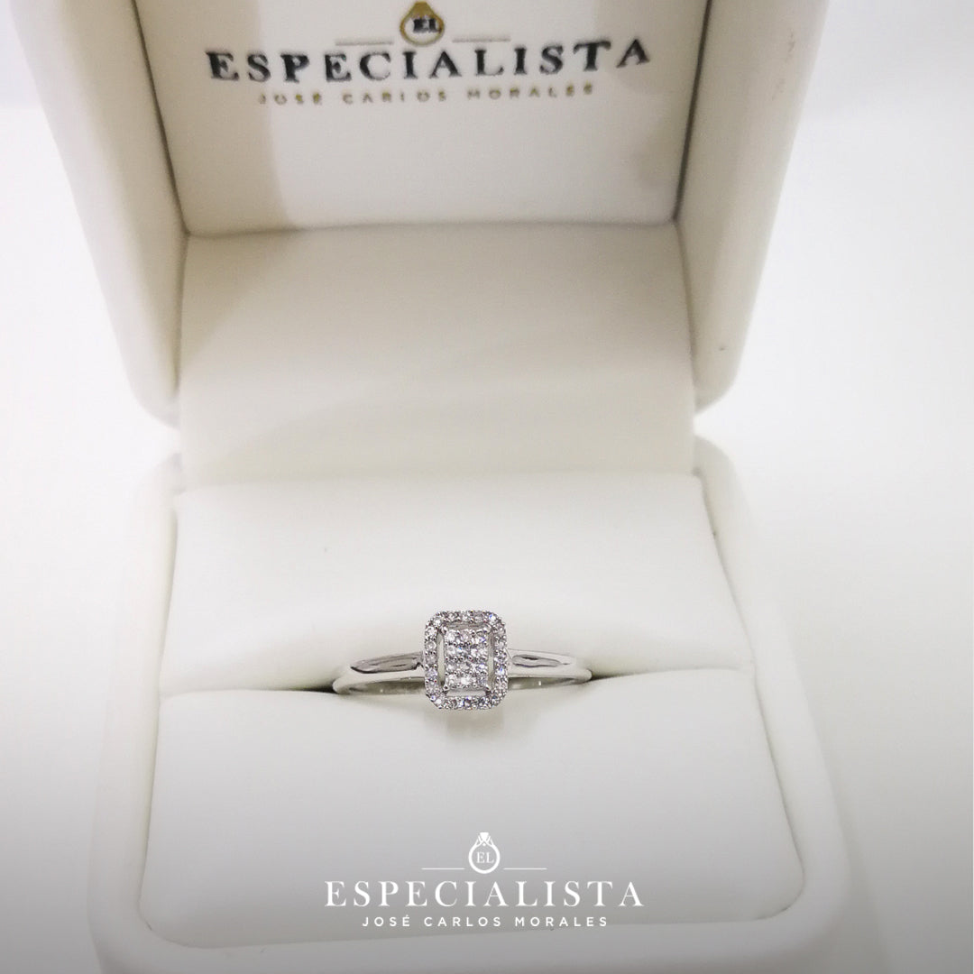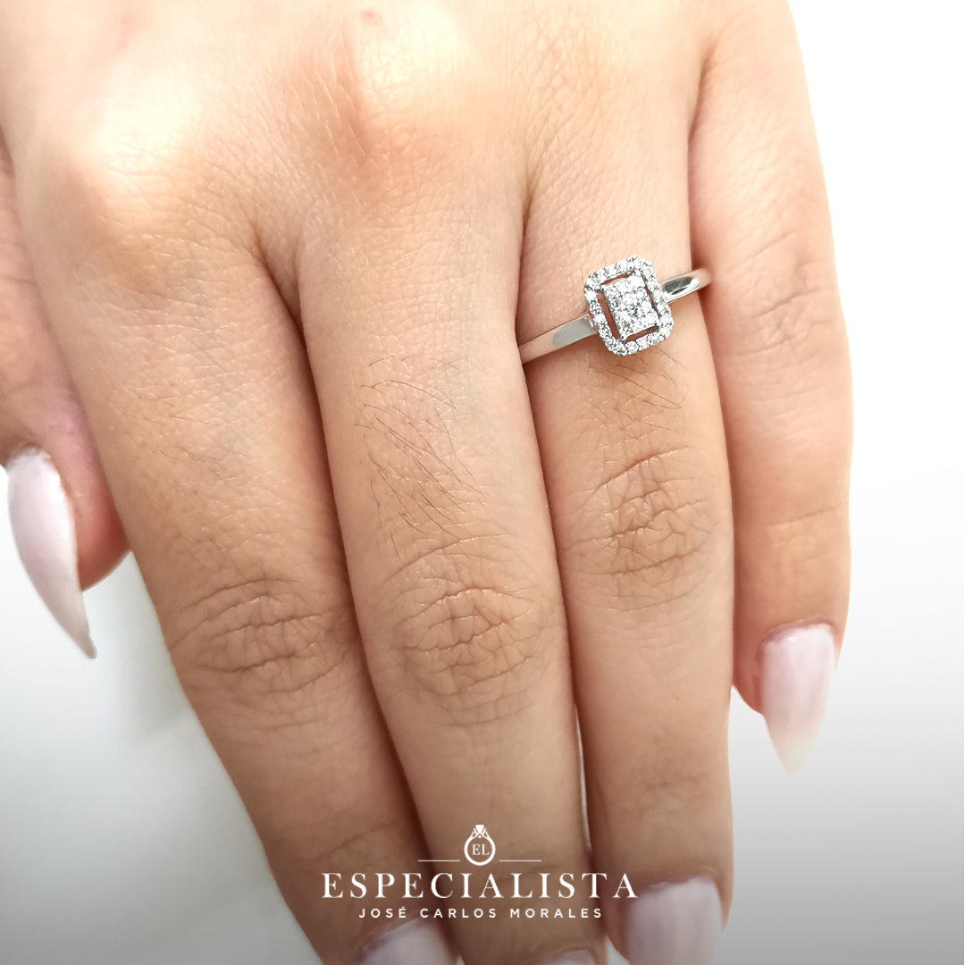 Anillo de compromiso en oro blanco con Diamantes naturales diseño cuadrado con piedra en corte redondo.