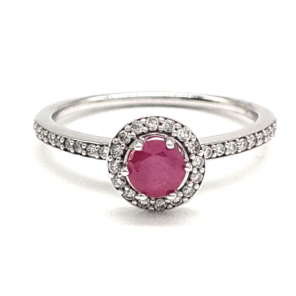 Anillo de Compromiso en oro blanco de 14 Kilates, montado con Rubi central y Diamantes naturales a los costados.