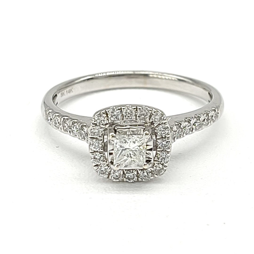 Anillo de Compromiso en oro blanco de 14 Kilates, montado con diamantes naturales.