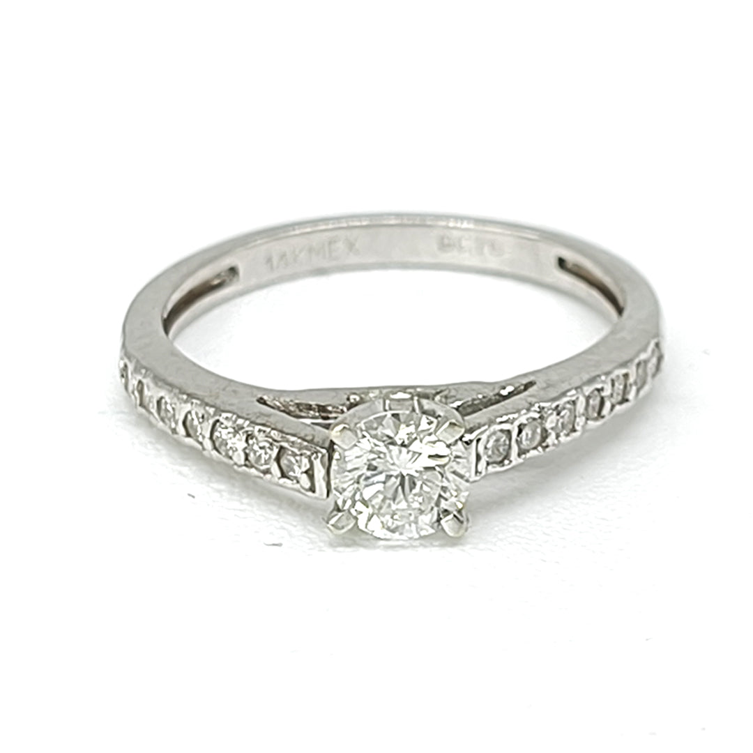 Anillo de compromiso en oro blanco de 14 Kilates con Diamantes naturales en corte en piedra redondo.