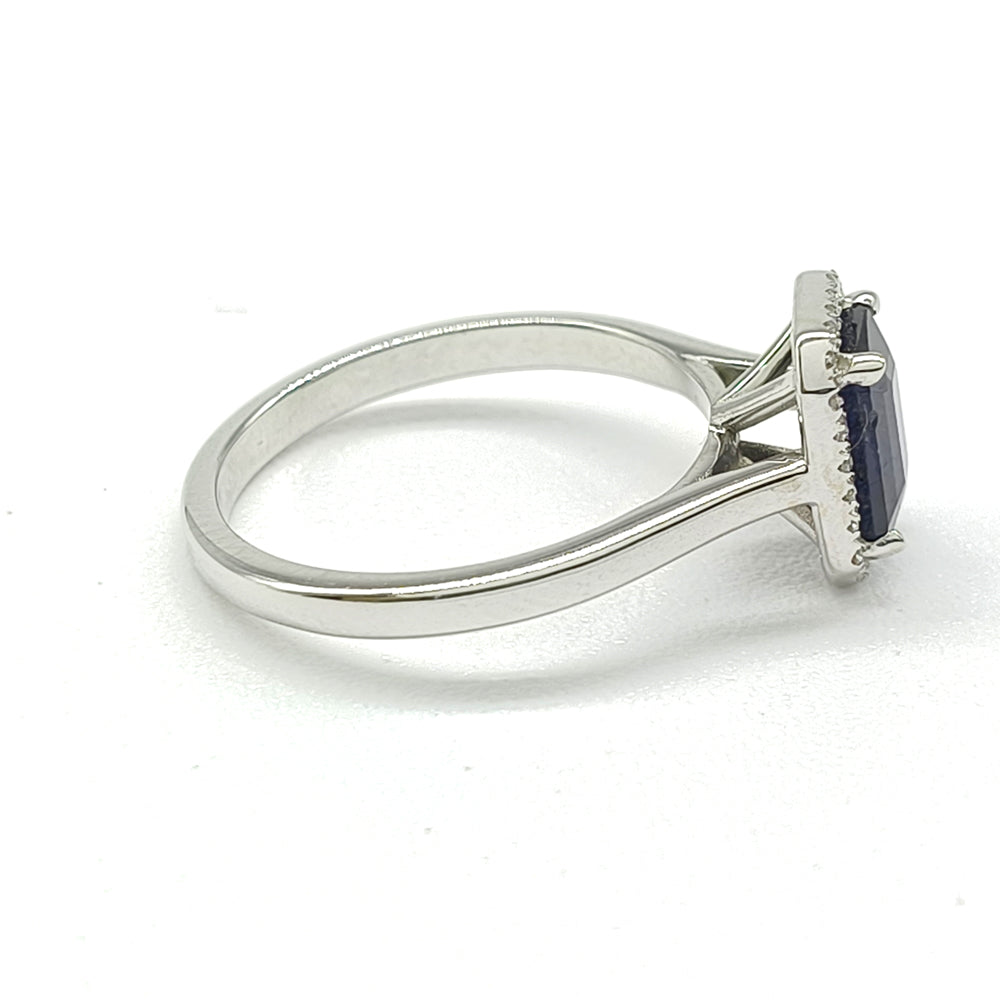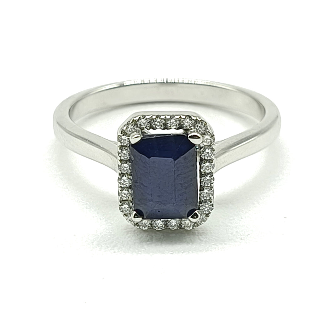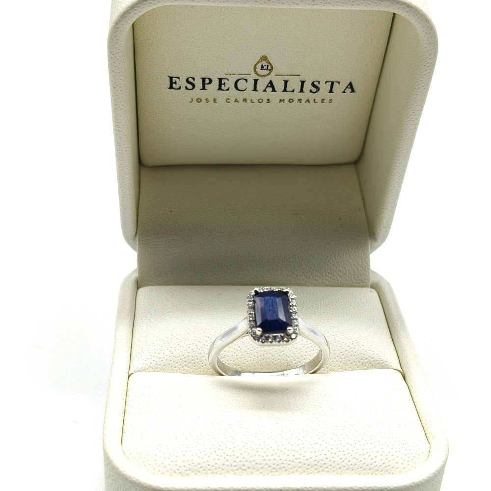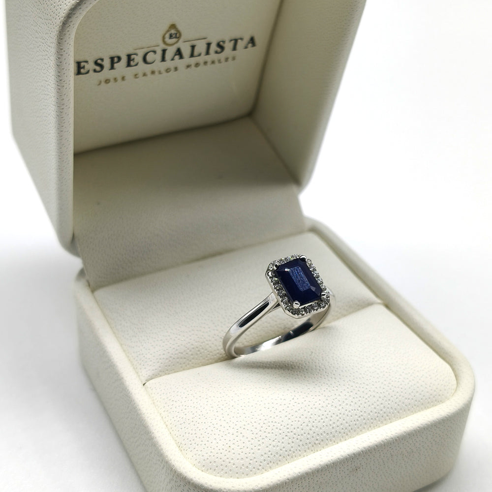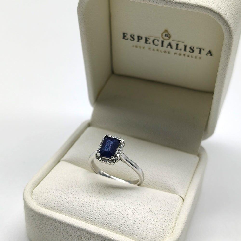Anillo de compromiso en oro blanco de 14 Kilates con diamantes naturales y un Zafiro central en corte Esmeralda.