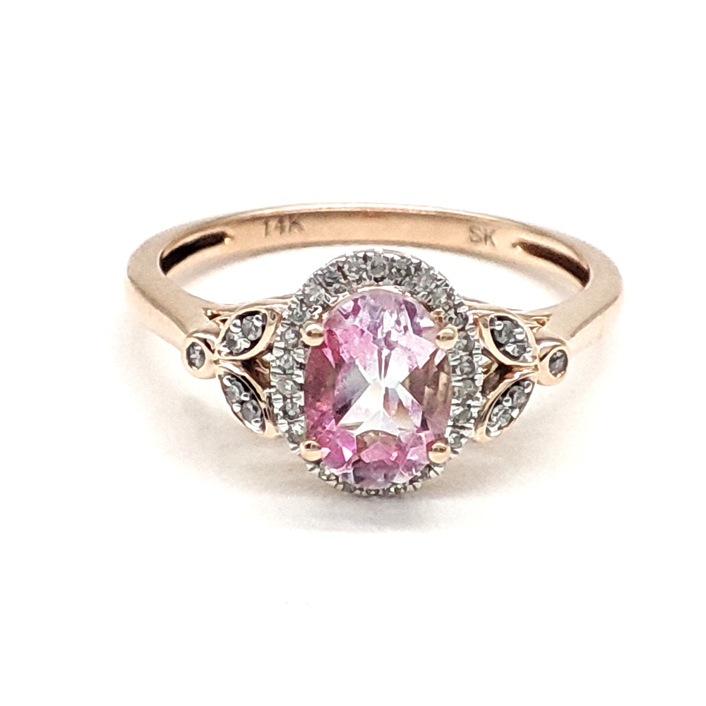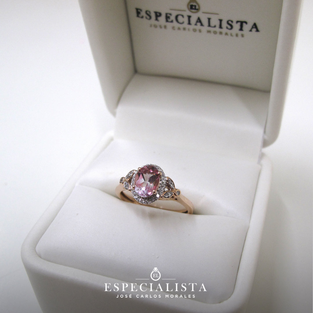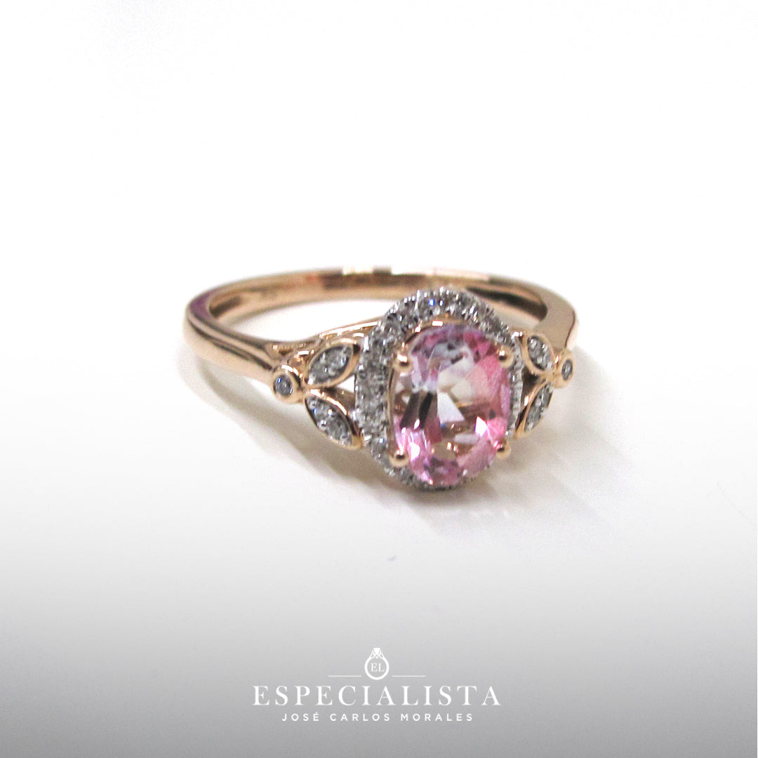 Anillo de Compromiso en oro rosa de 14 Kilates, con Diamantes naturales y piedra semipreciosa.