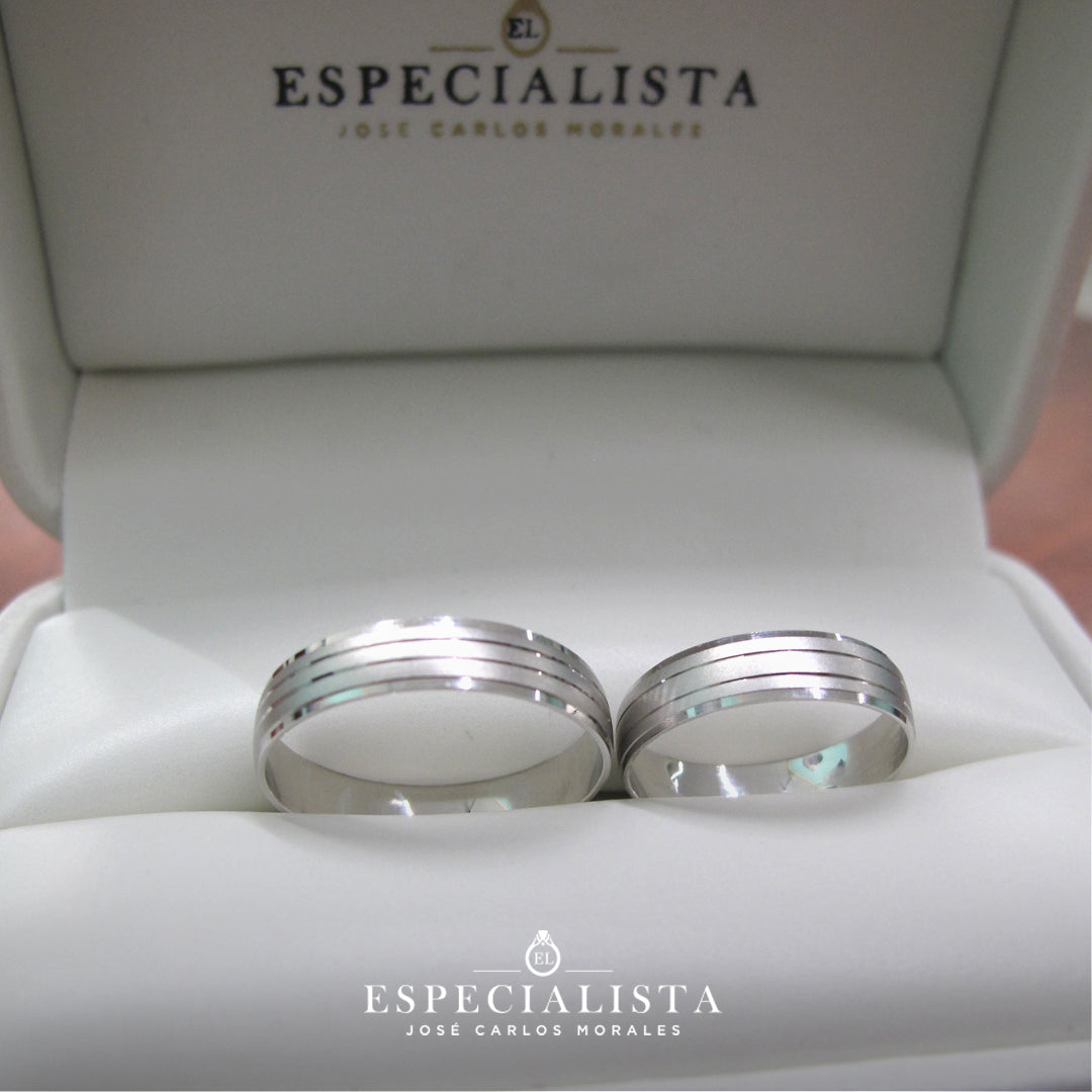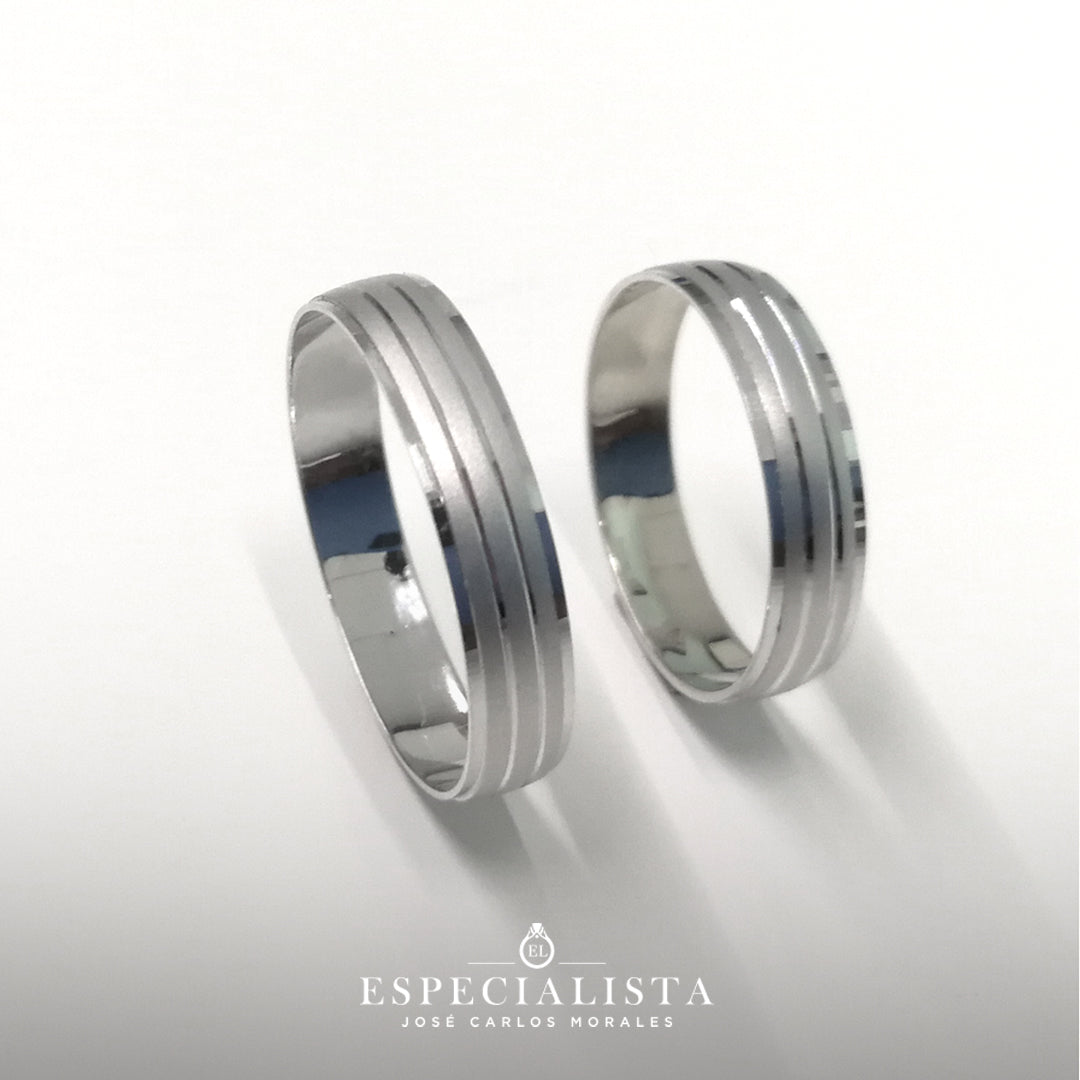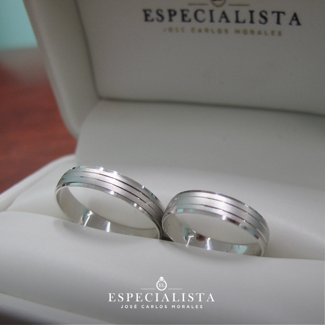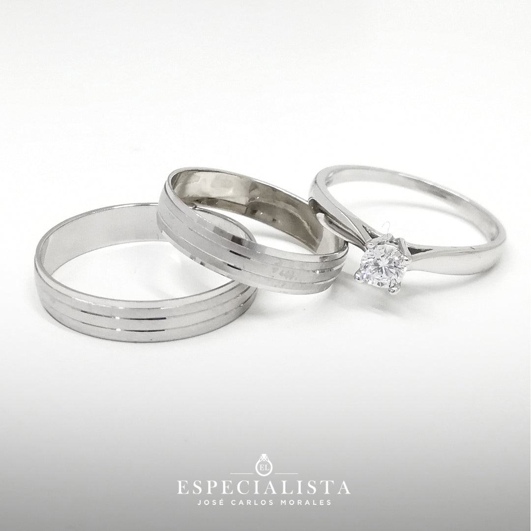 Argollas de matrimonio en oro blanco de 10 kilates en 4 mm y anillo de compromiso en oro blanco de 14 kilates con circonia importada de alta calidad.