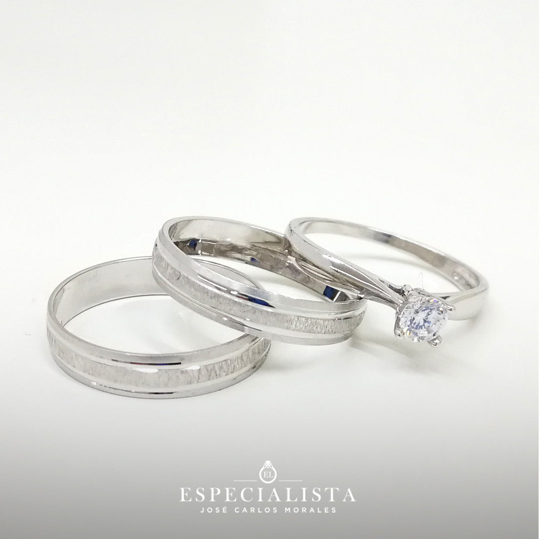 Argollas de matrimonio en oro blanco de 10 kilates en 4 mm y anillo de compromiso en oro blanco de 14 kilates con circonia importada de alta calidad.