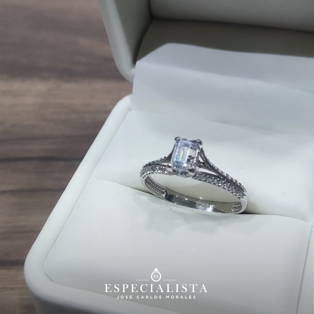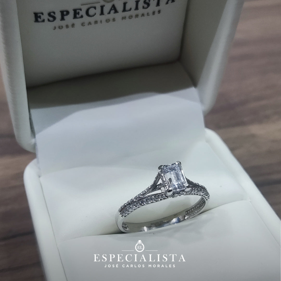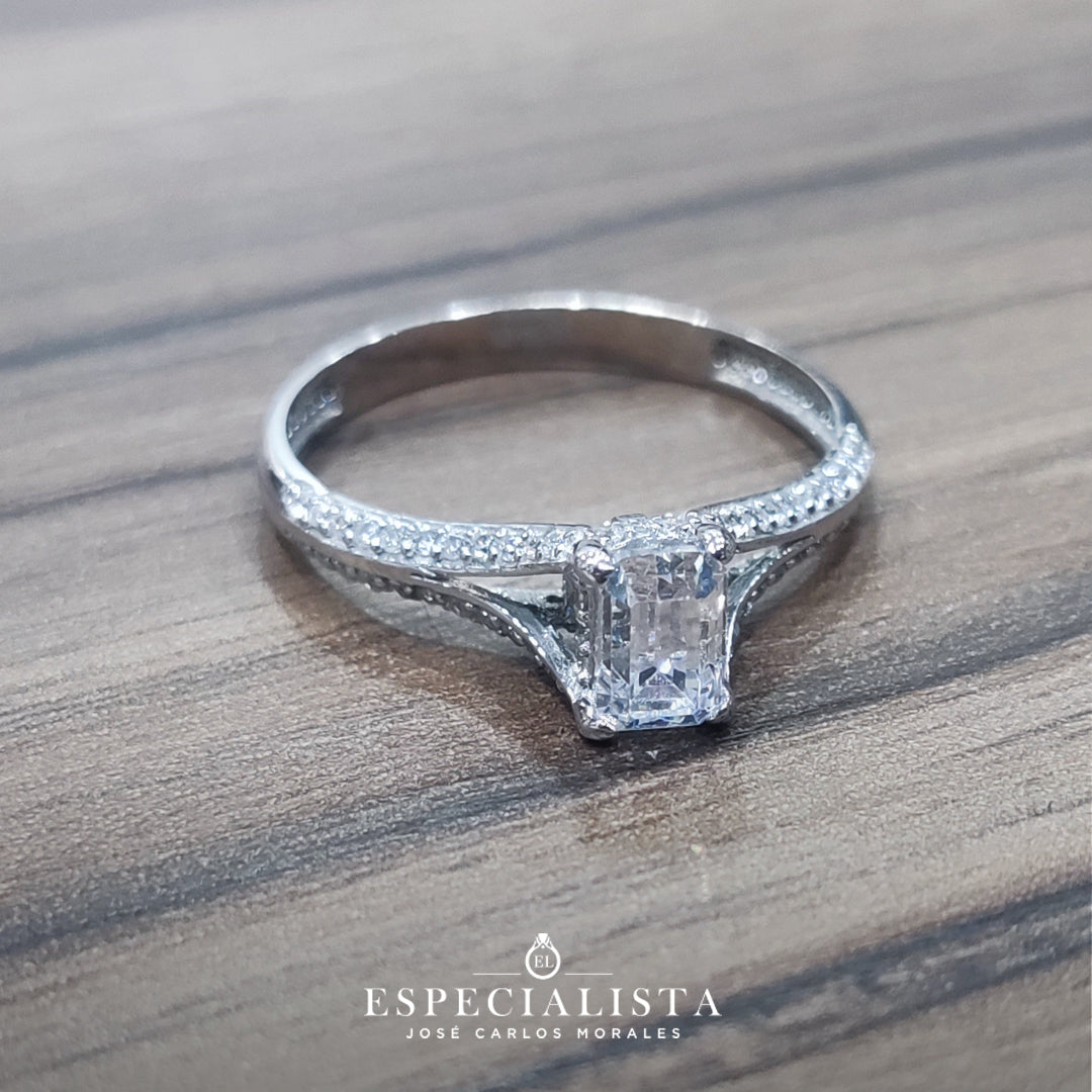 Anillo de compromiso en oro blanco de 10 Kilates montado con circonias importadas de alta calidad.