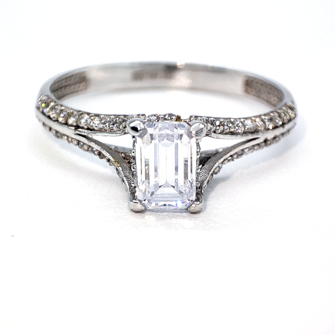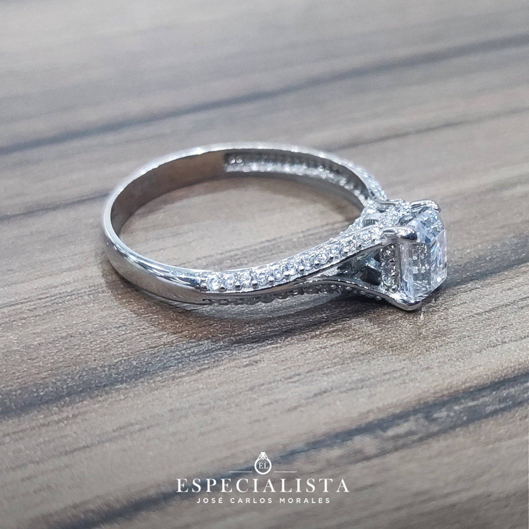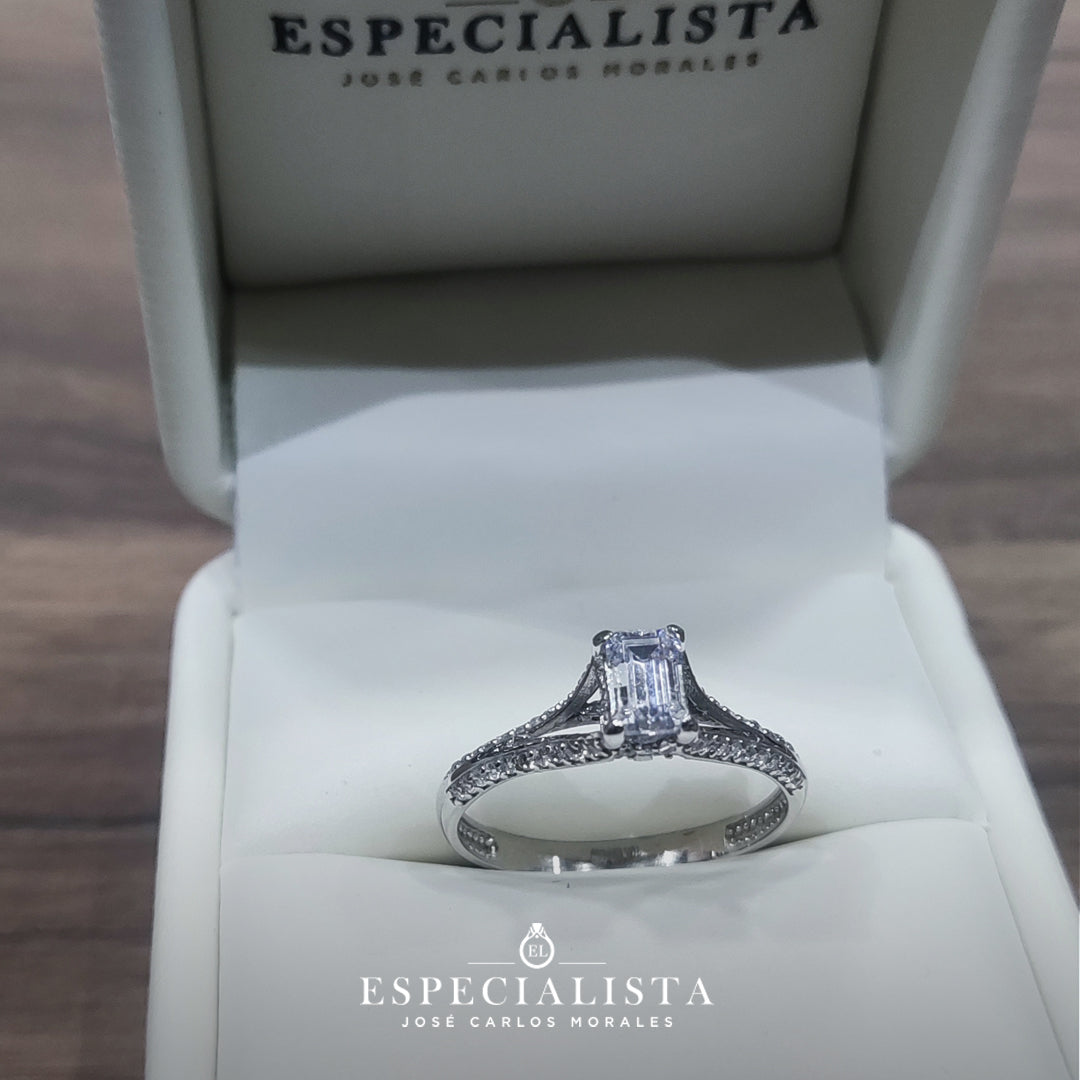 Anillo de compromiso en oro blanco de 10 Kilates montado con circonias importadas de alta calidad.