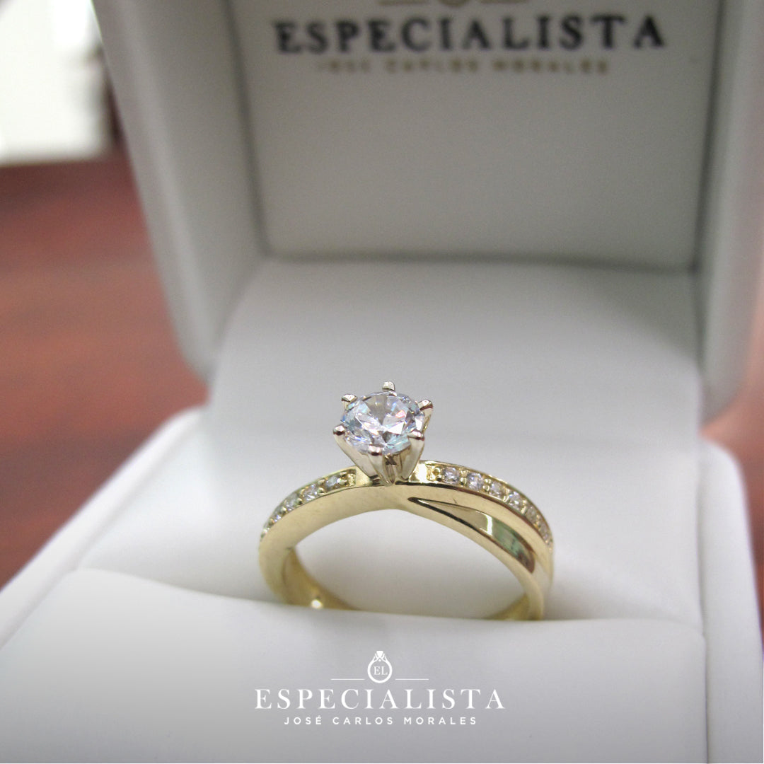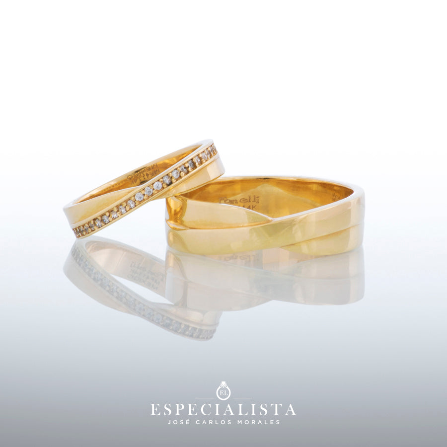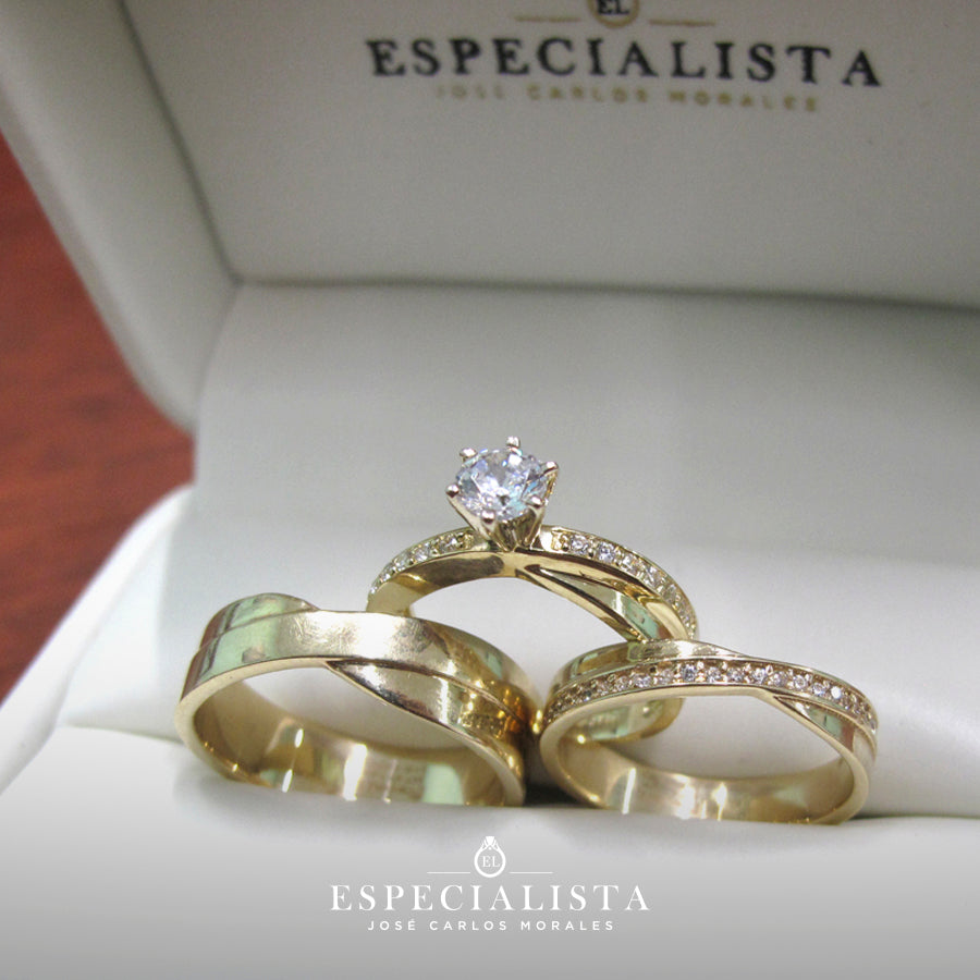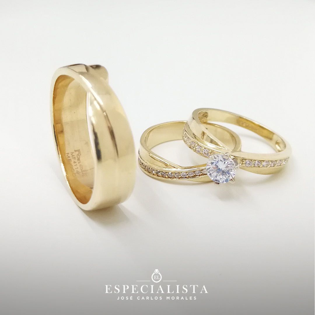 Argolla de matrimonio en oro amarillo de 14 kilates, churumbela con piedras circonias y anillo de compromiso en oro amarillo de 14 kilates con circonias importada de alta calidad.