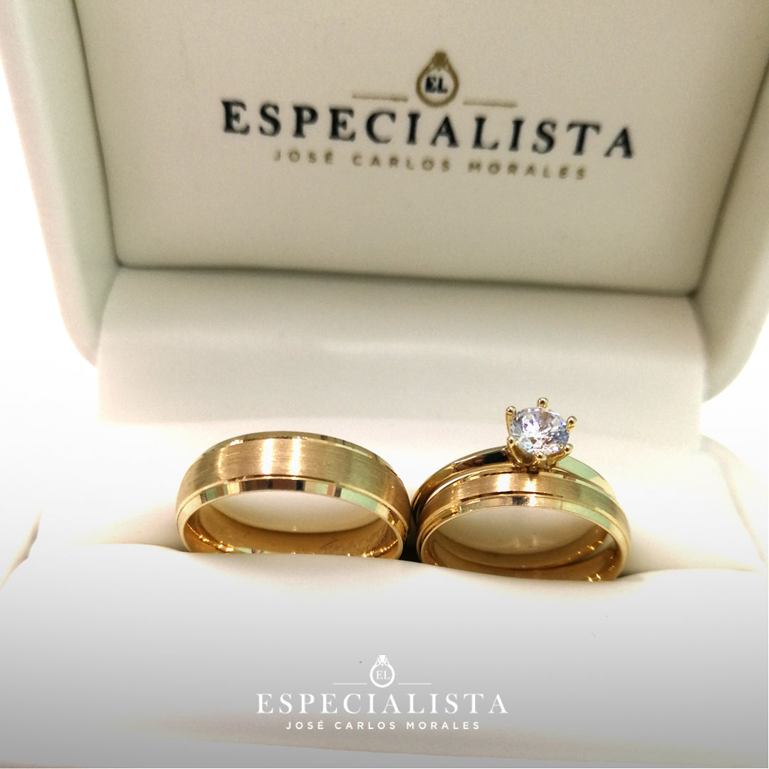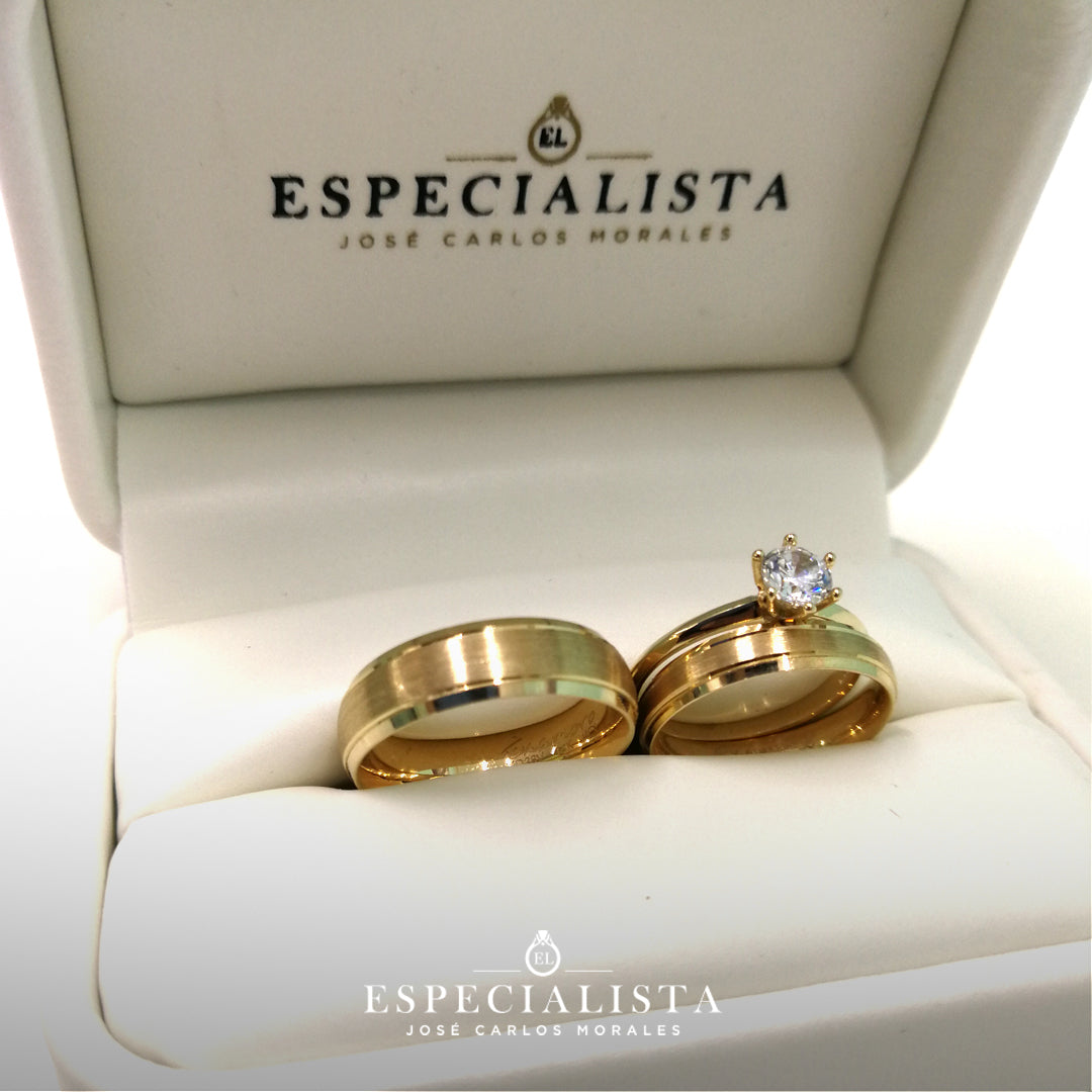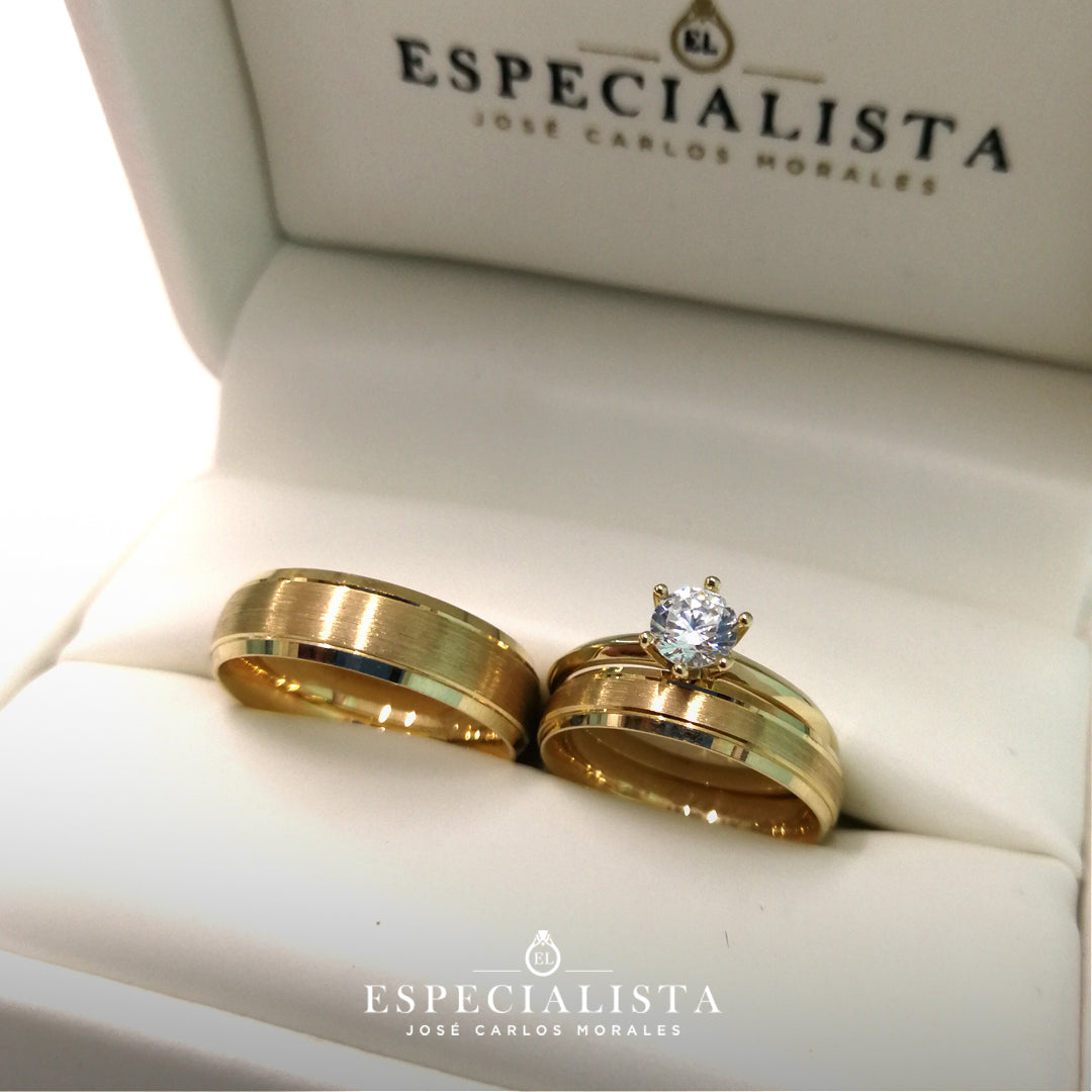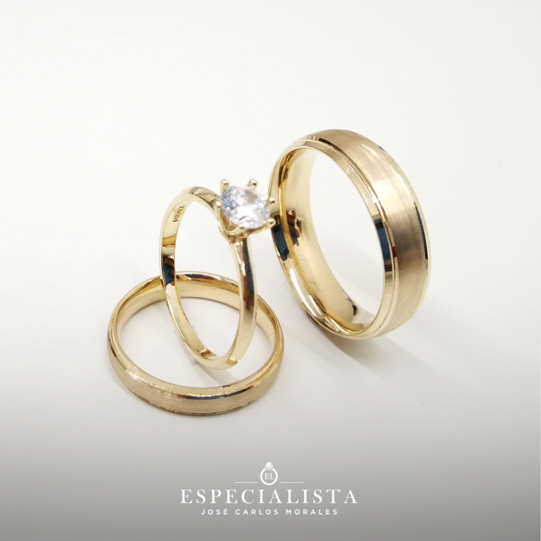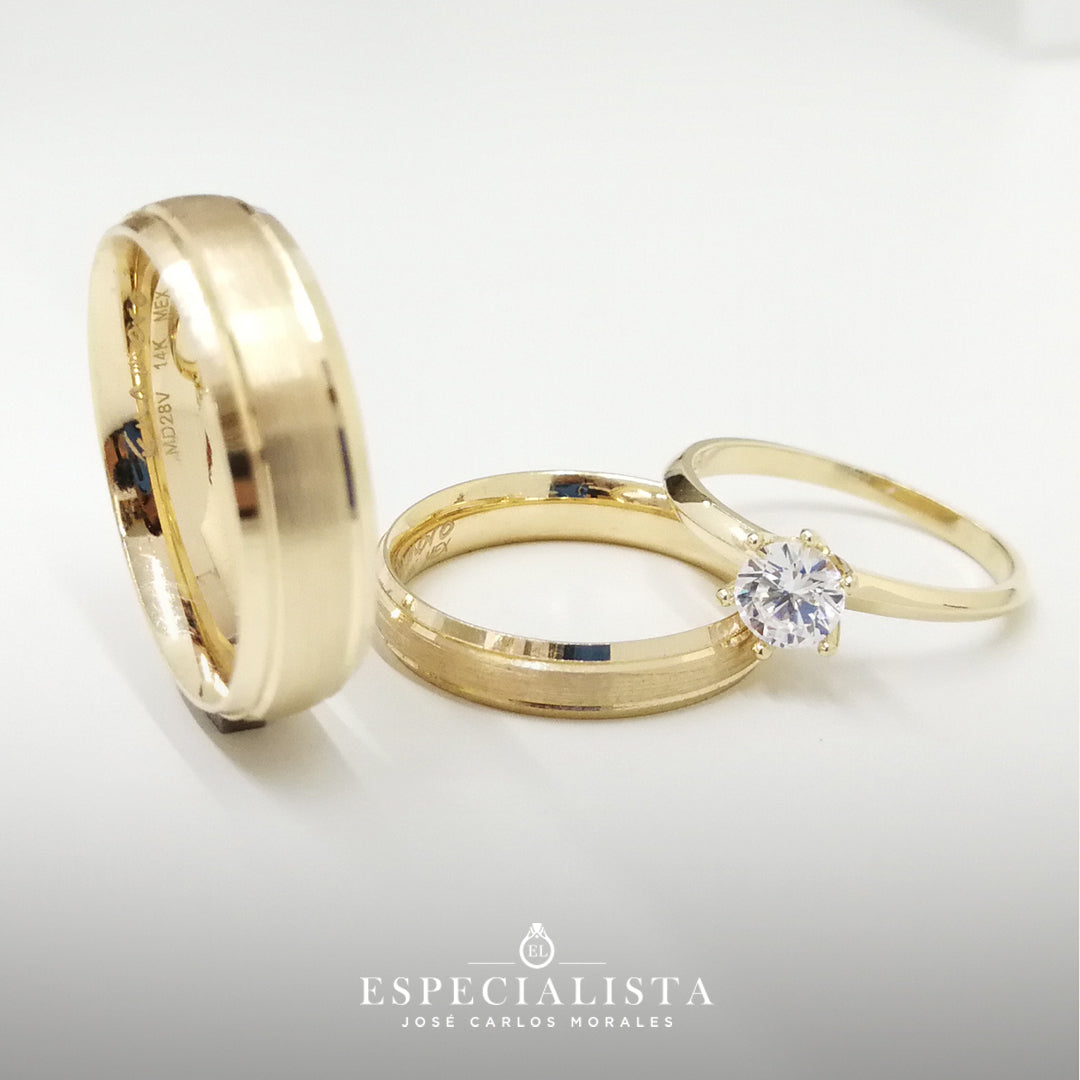Par de Argollas de Matrimonio tradicionales en oro amarillo de 14 kilates y anillo de compromiso en oro de 14 kilates con circonia importada.