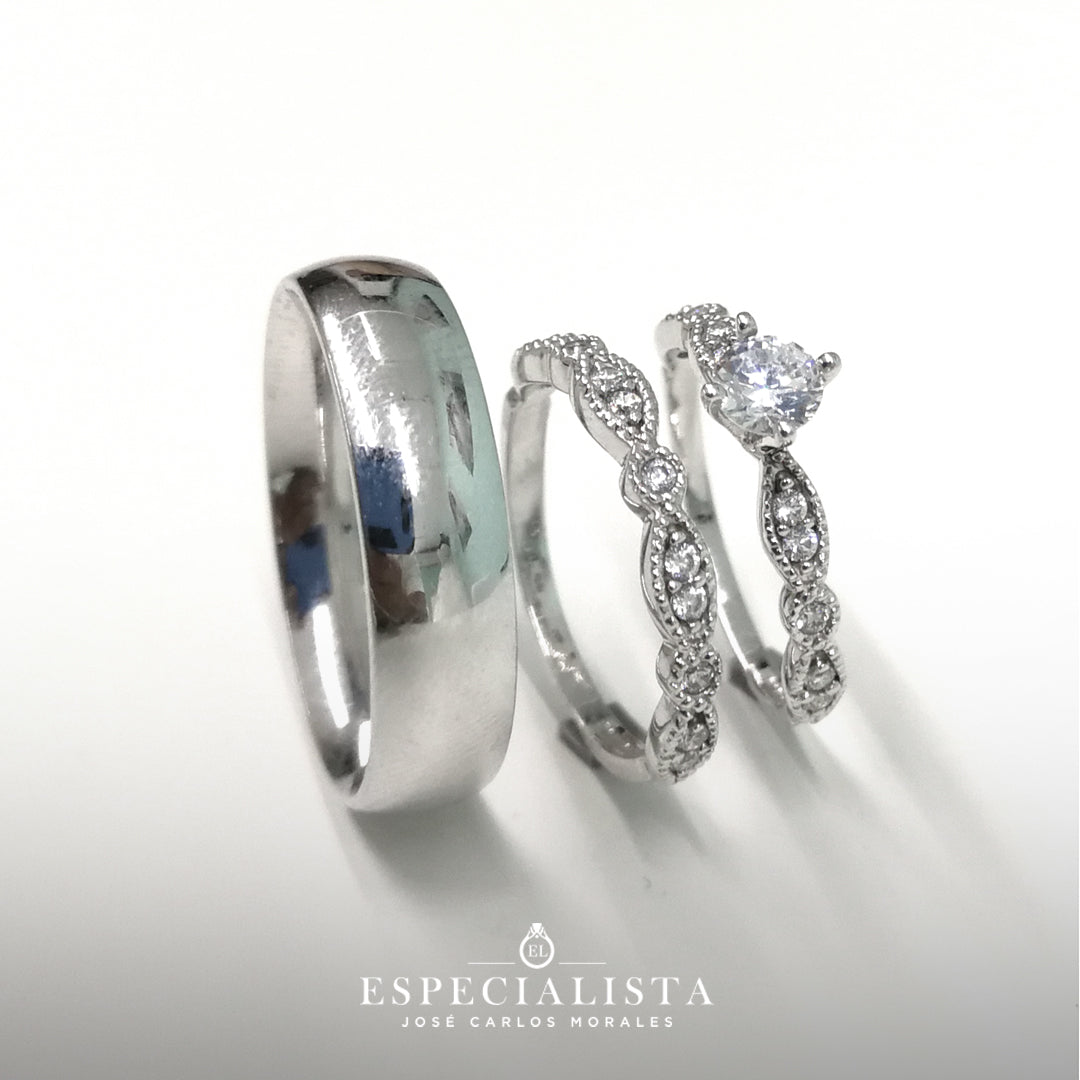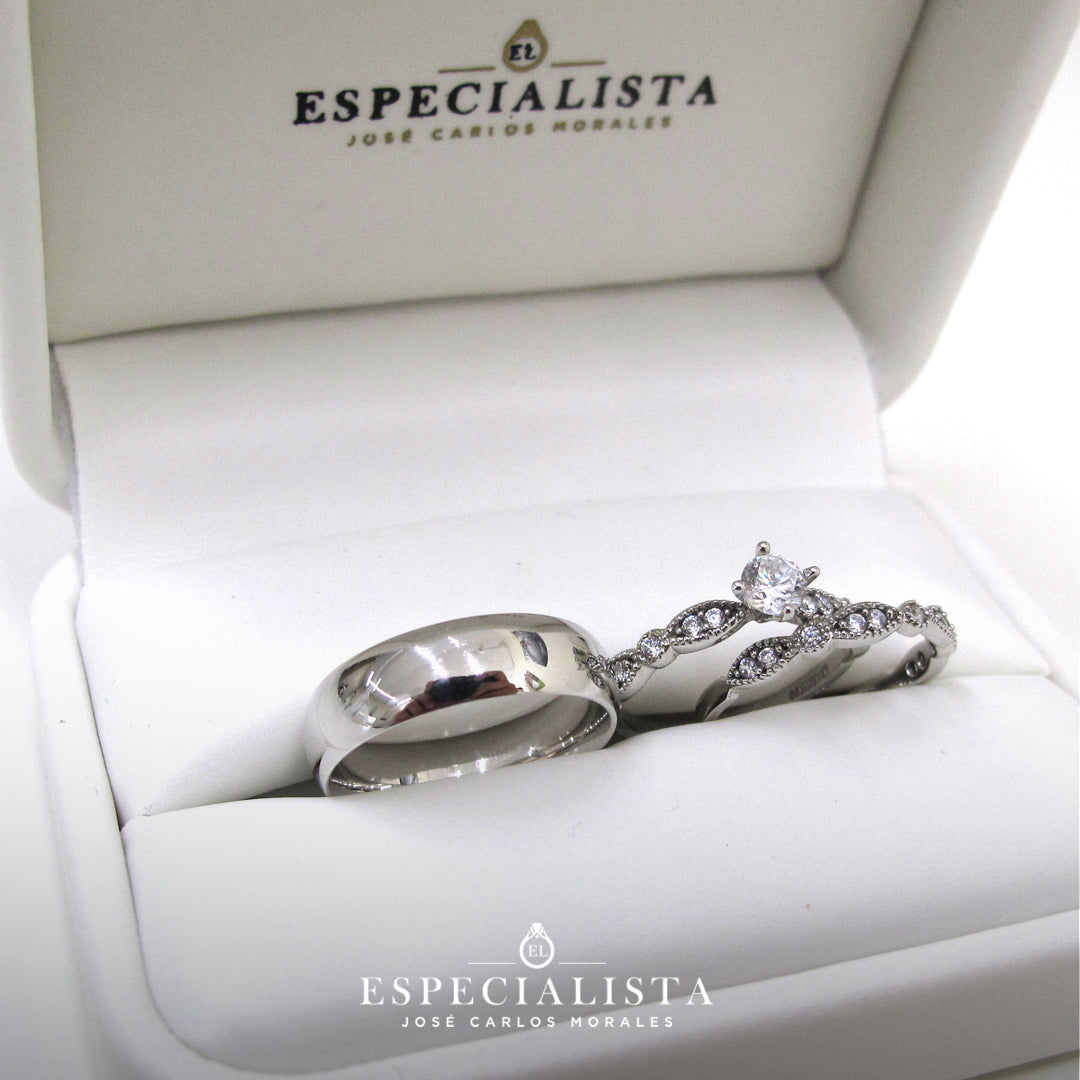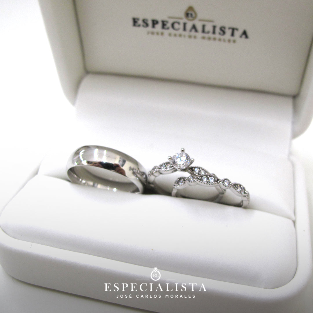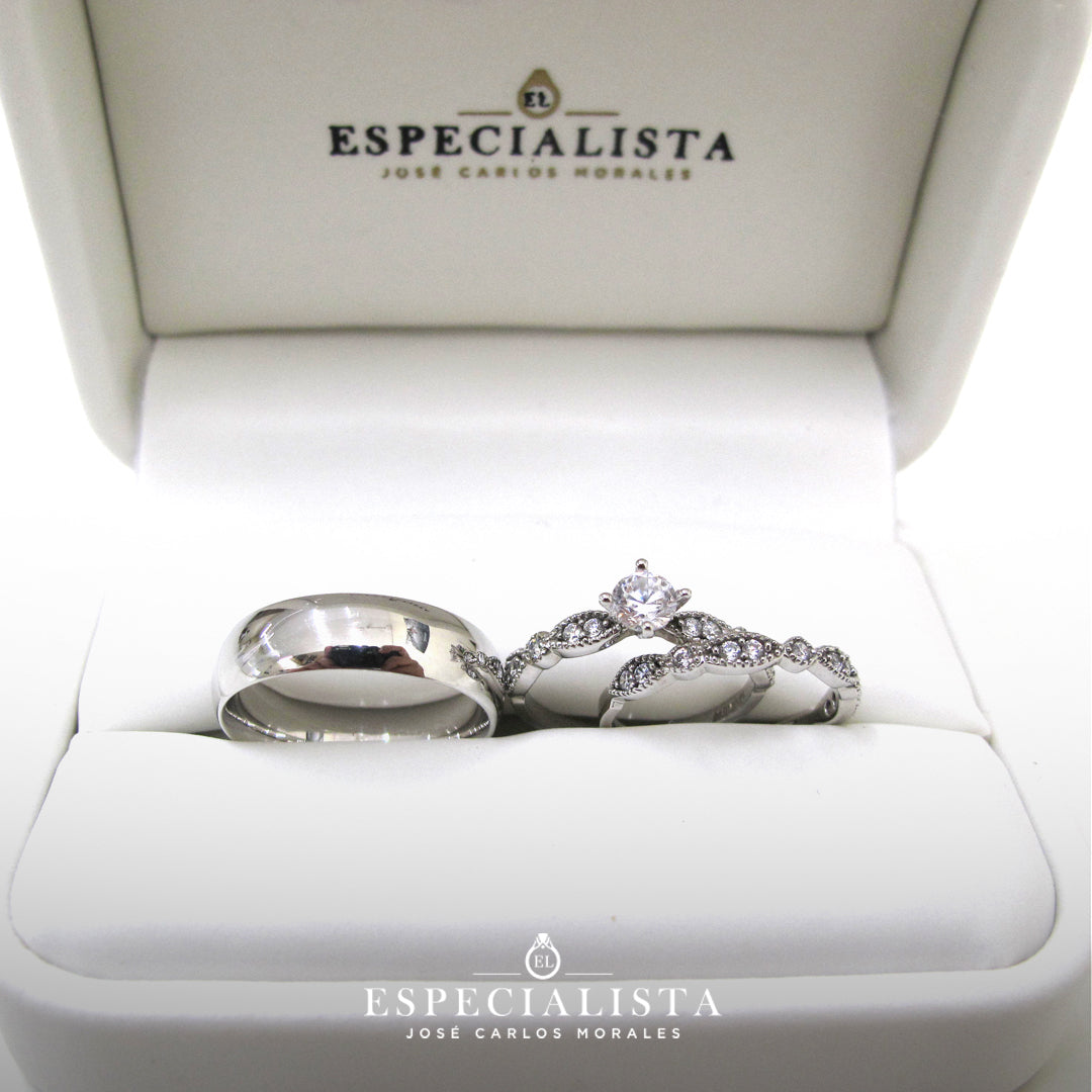 El precio marcado, incluye una argolla, un anillo de compromiso y una churumbela, con la descripción arriba mencionada, certificado, hecho en la medida que se solicite en un elegante estuche de vinipiel blanco.