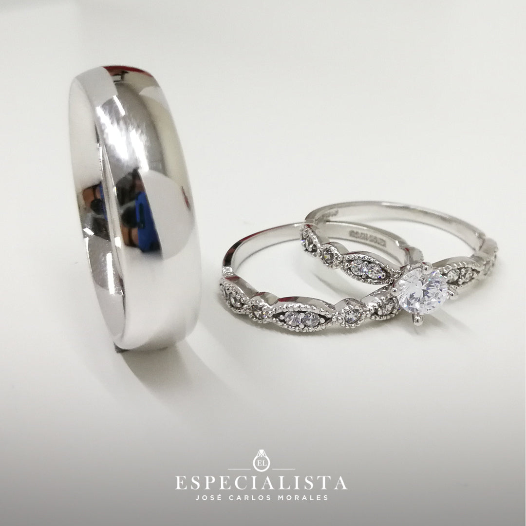 Argolla de matrimonio en oro blanco de 14 kilates, churumbela con piedras circonias y anillo de compromiso en oro blanco de 14 kilates con circonias importadas de alta calidad.