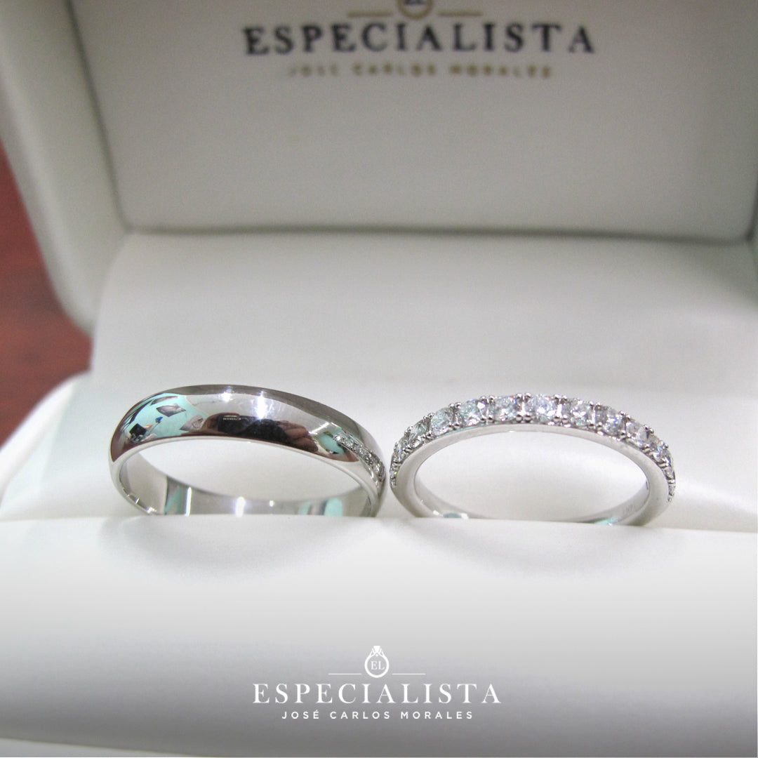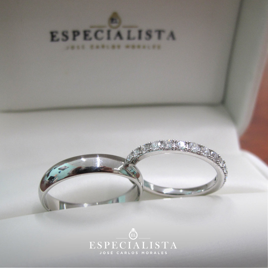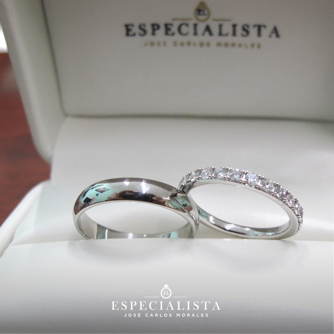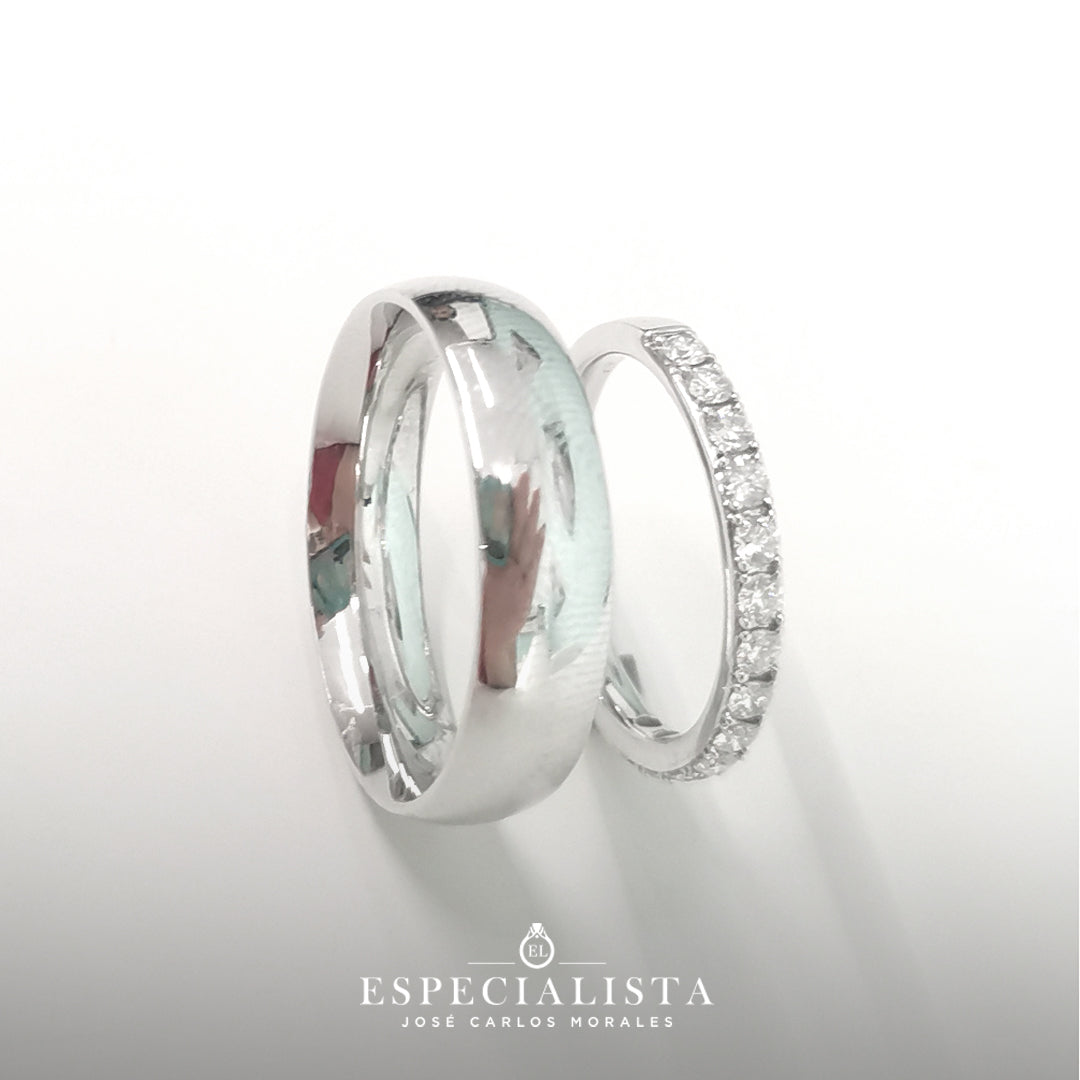 Argolla de matrimonio en oro blanco en 4 ó 6mm de ancho y churumbela en oro blanco de 14 Kilates con 50 puntos de diamantes naturales.
