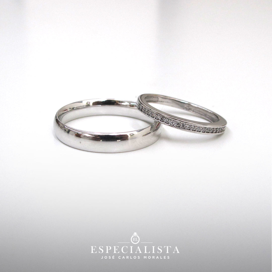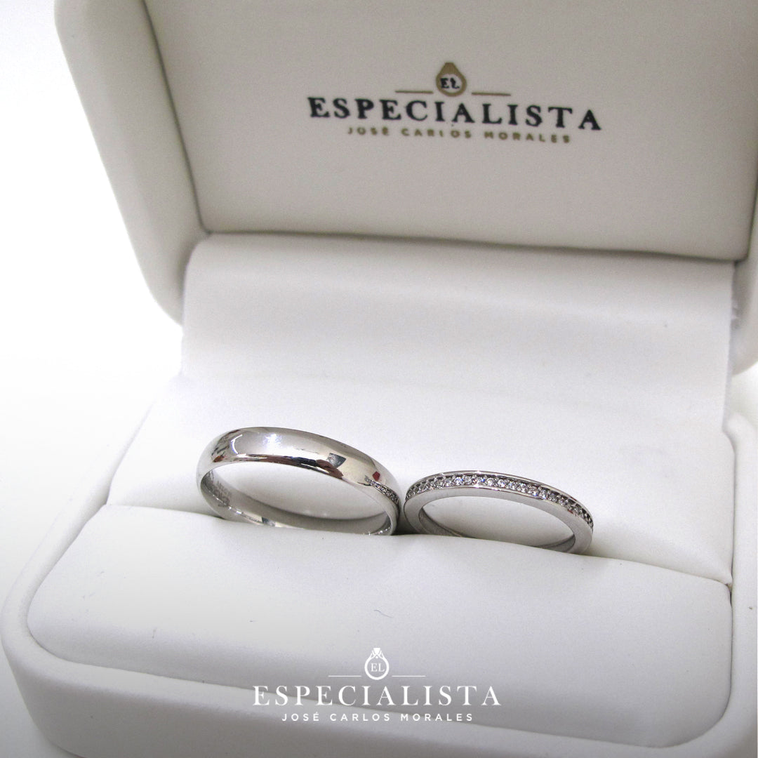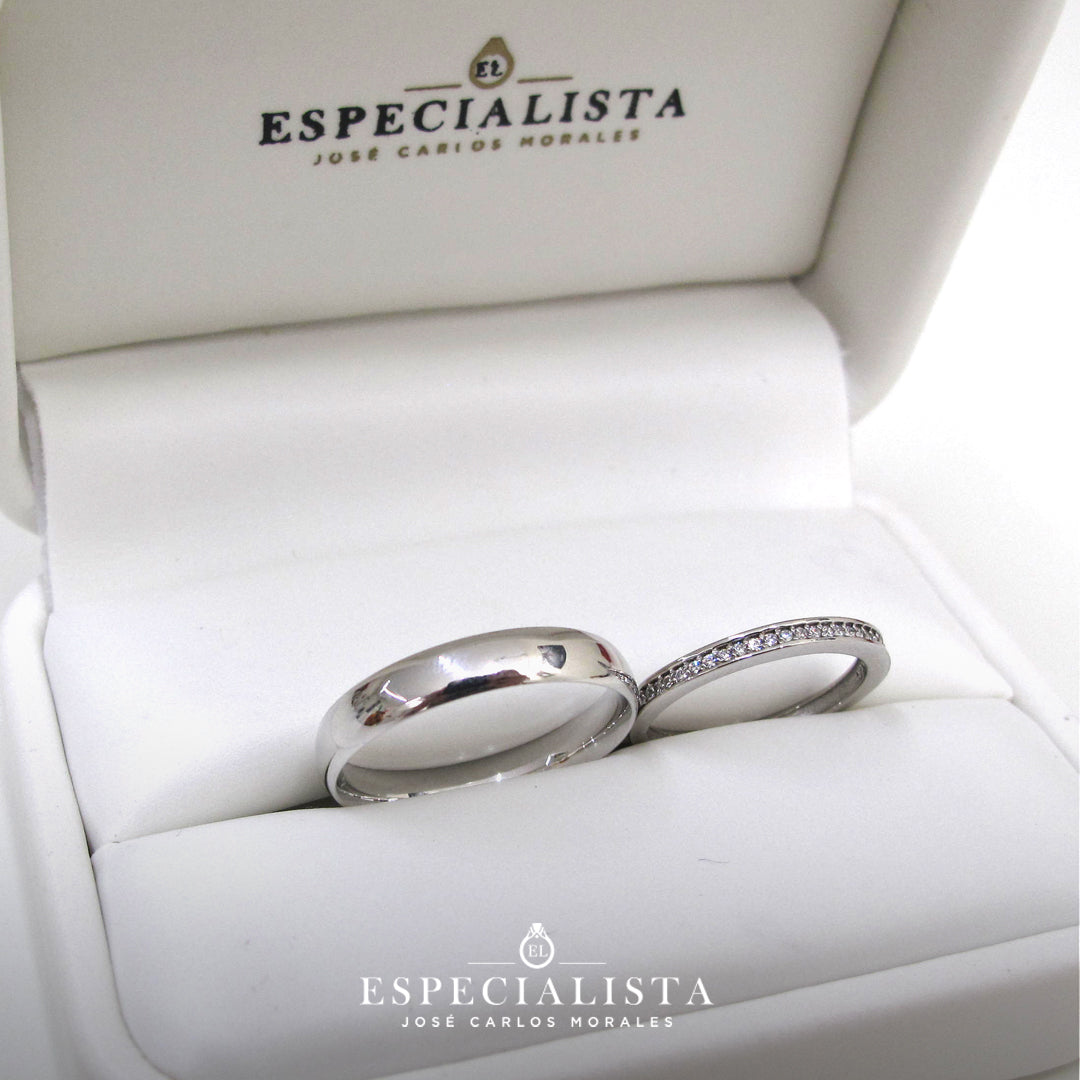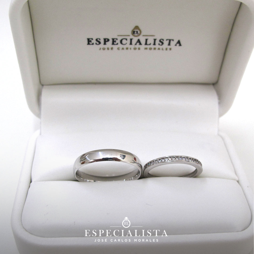 Argolla de matrimonio tradicional en 4mm, junto con una hermosa y delicada churumbela en oro blanco con detalles blancos en la zona montada de circonias importadas de alta calidad.