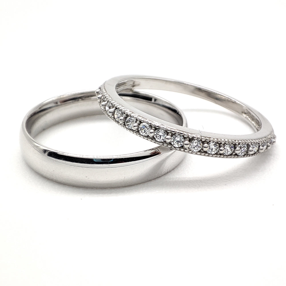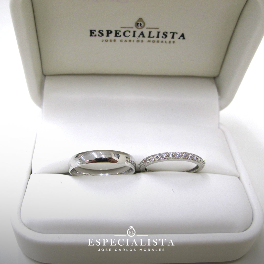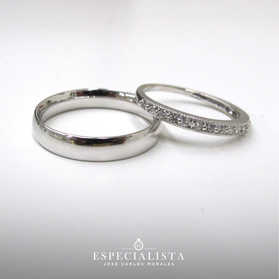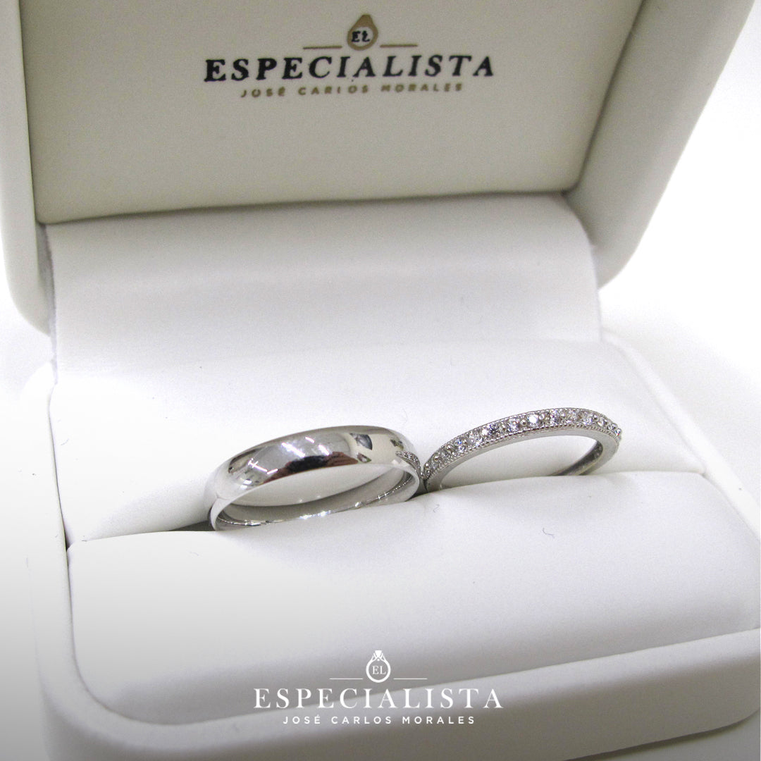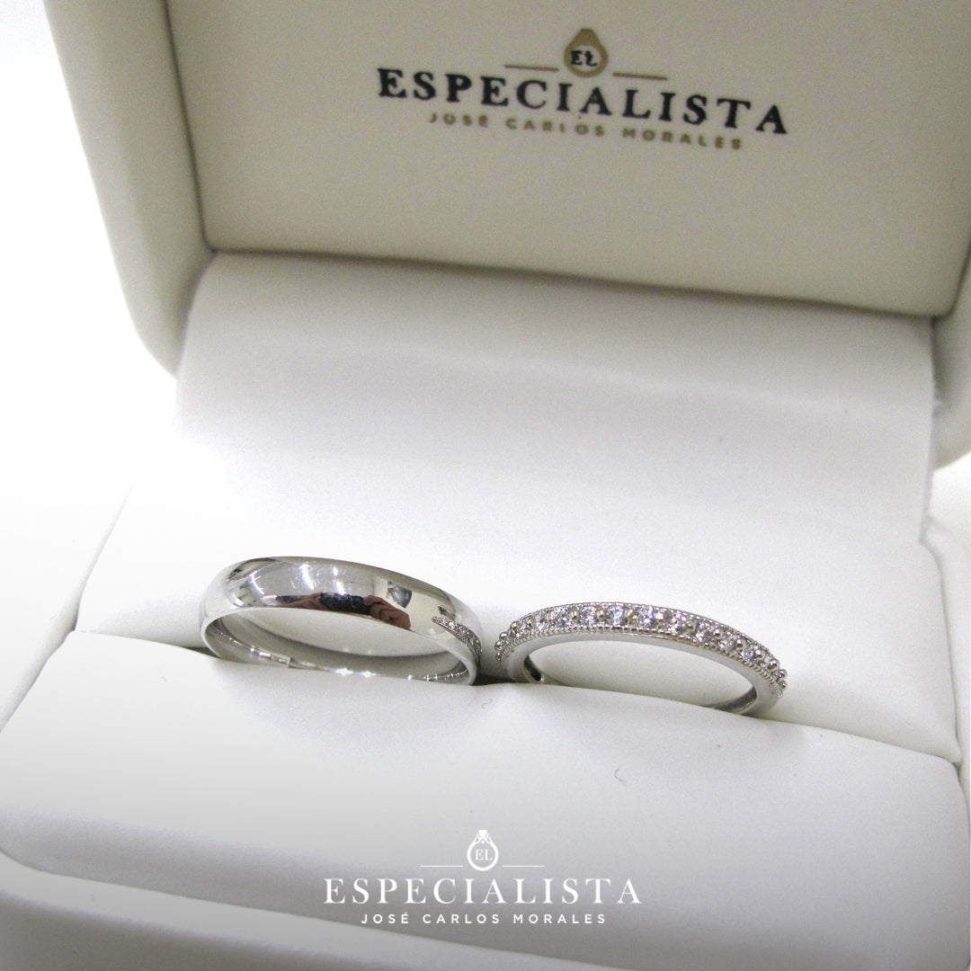 Argolla de matrimonio tradicional en 4mm, junto con una hermosa y delicada churumbela en oro blanco  con detalles blancos en la zona montada de circonias importadas de alta calidad.