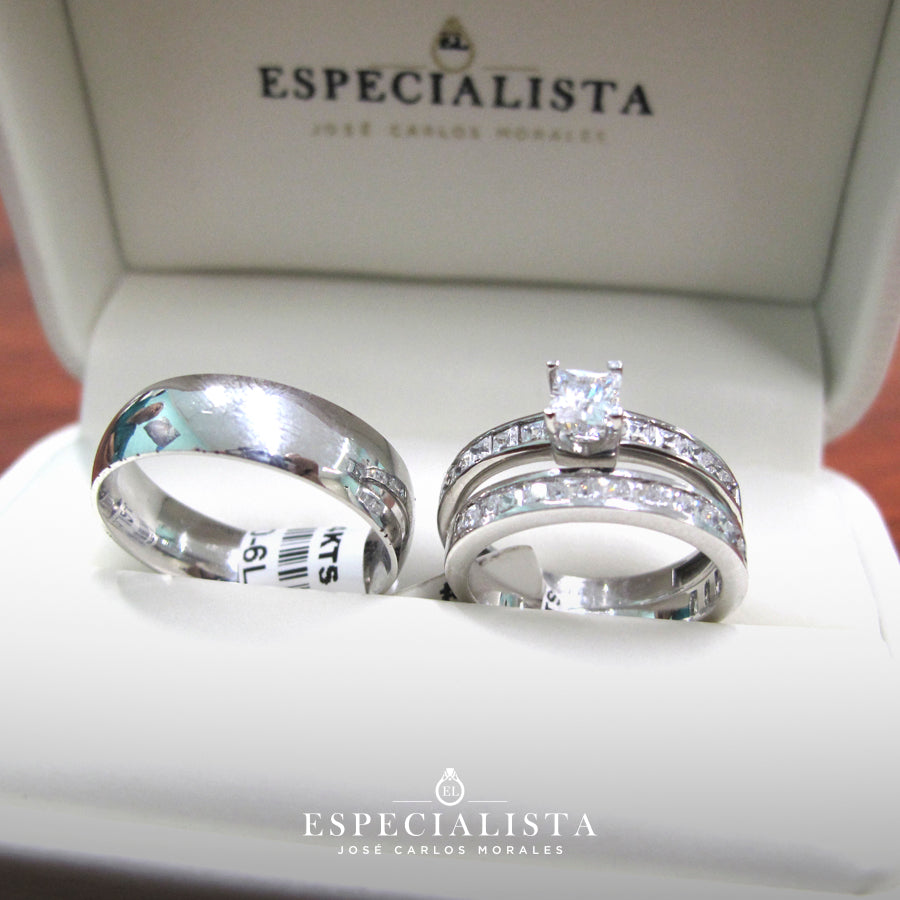 Argolla de matrimonio en oro Blanco, churumbela con piedras cuadradas y anillo de compromiso en oro blanco.