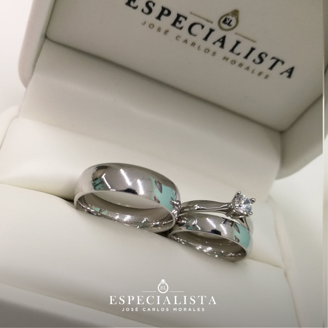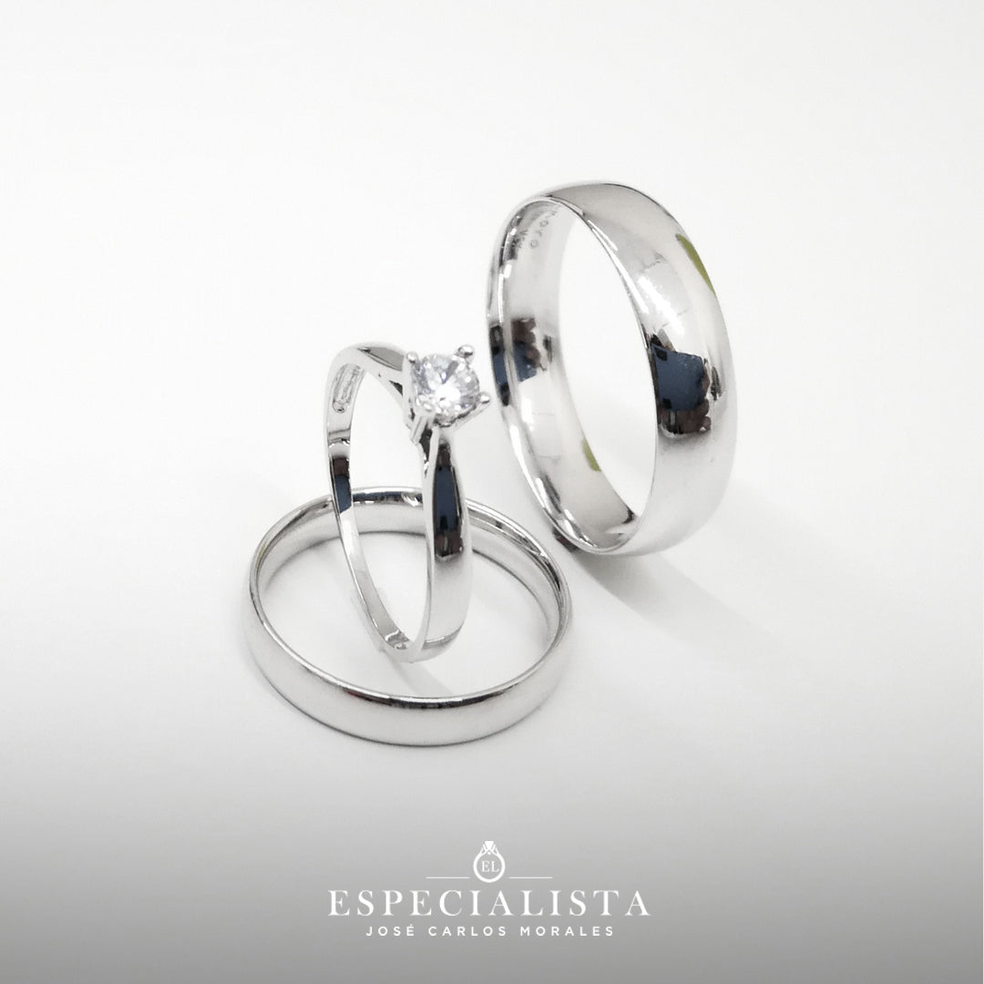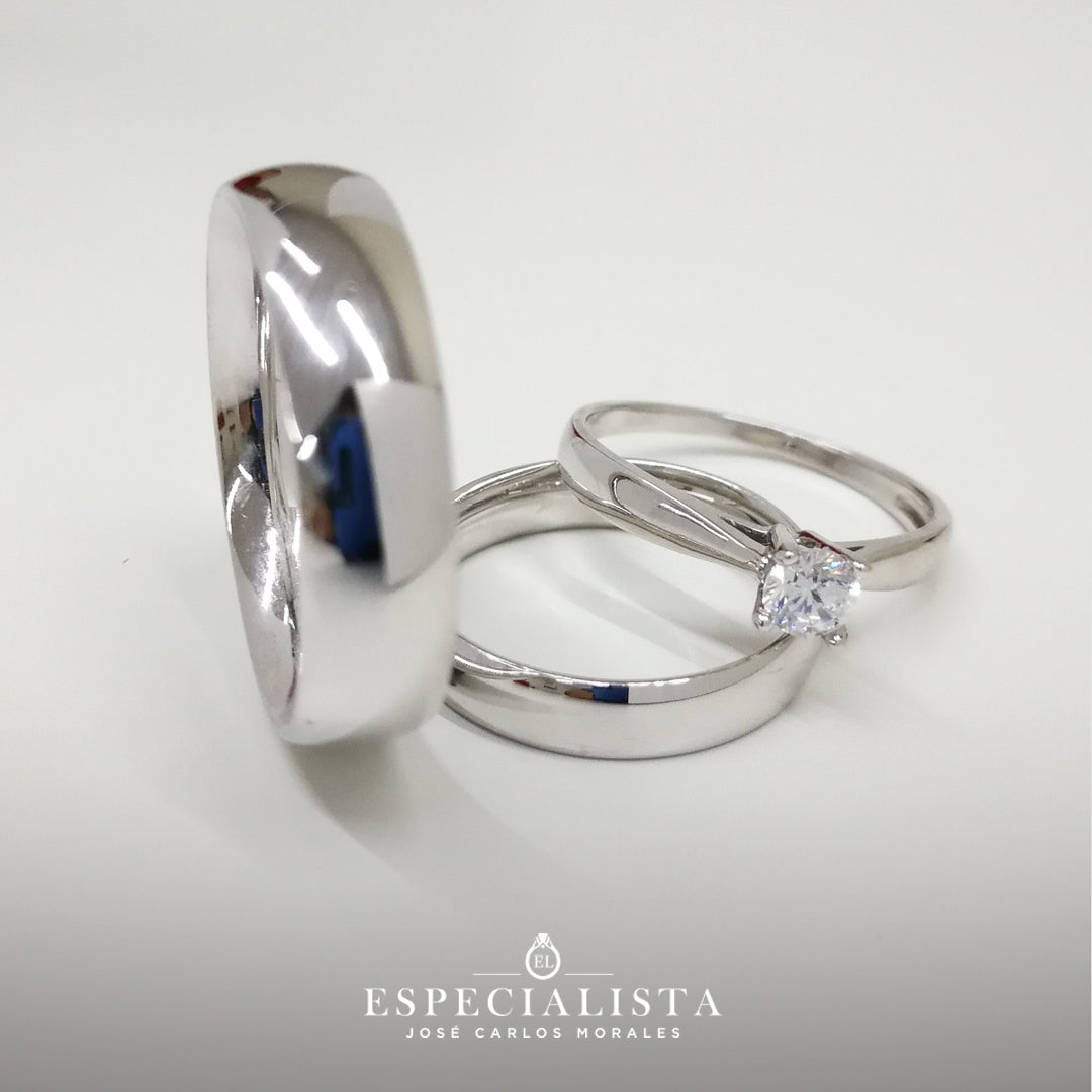 Par de Argollas de Matrimonio tradicionales en oro Blanco y anillo de compromiso en oro blanco con circonia importada.