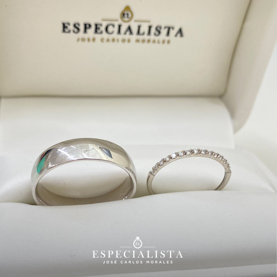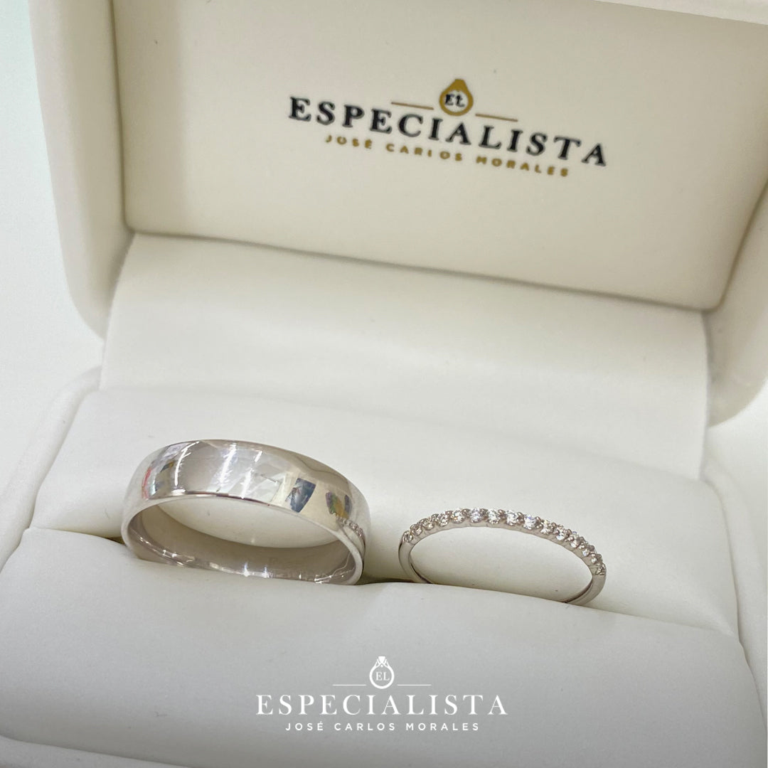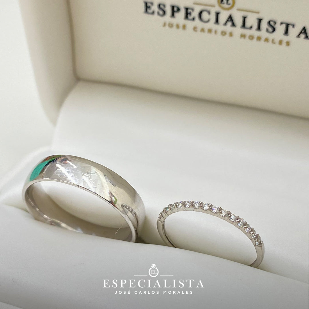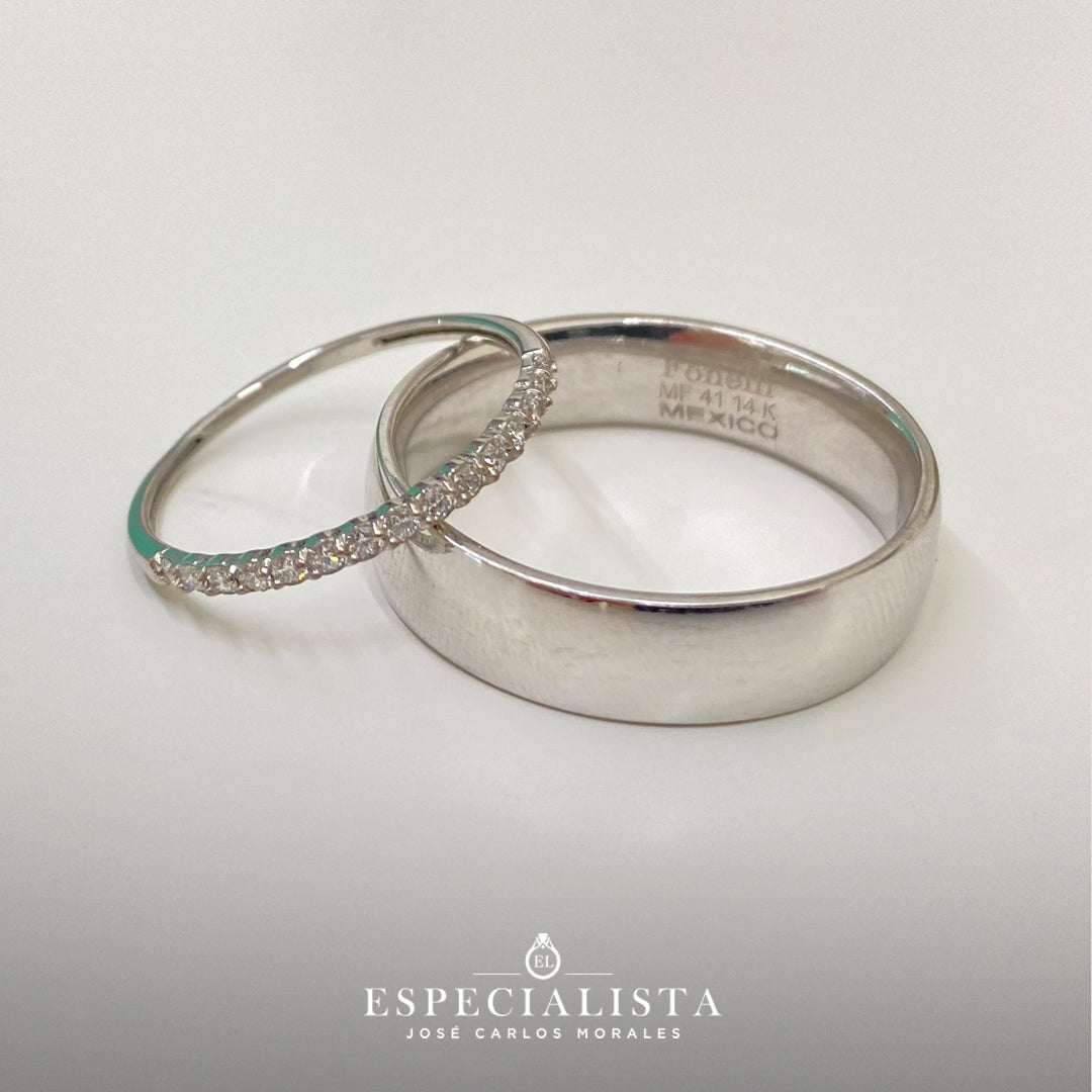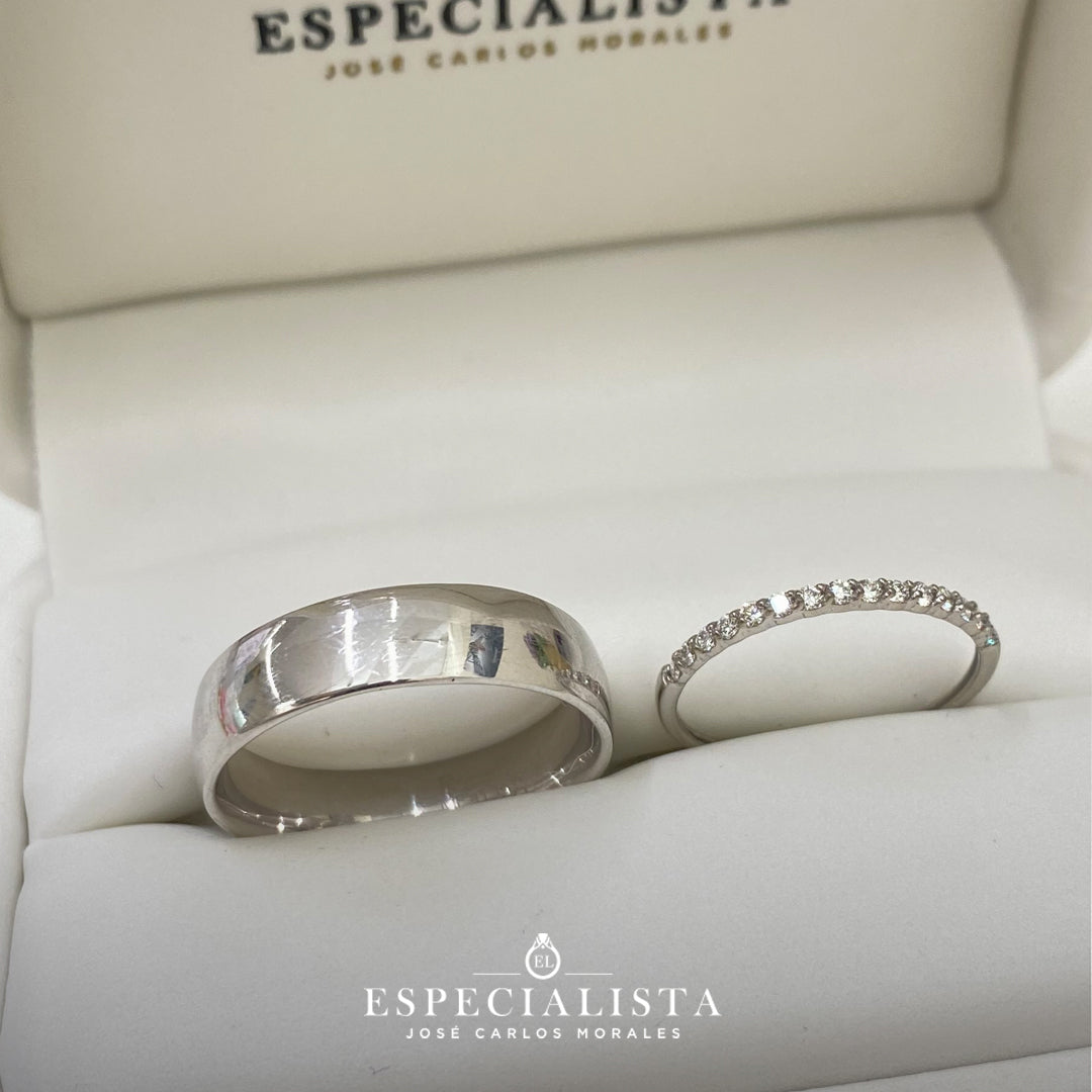 Argolla matrimonial en oro blanco de 6 mm de ancho y churumbela en oro blanco de montado con 18.75pts puntos de diamantes naturales