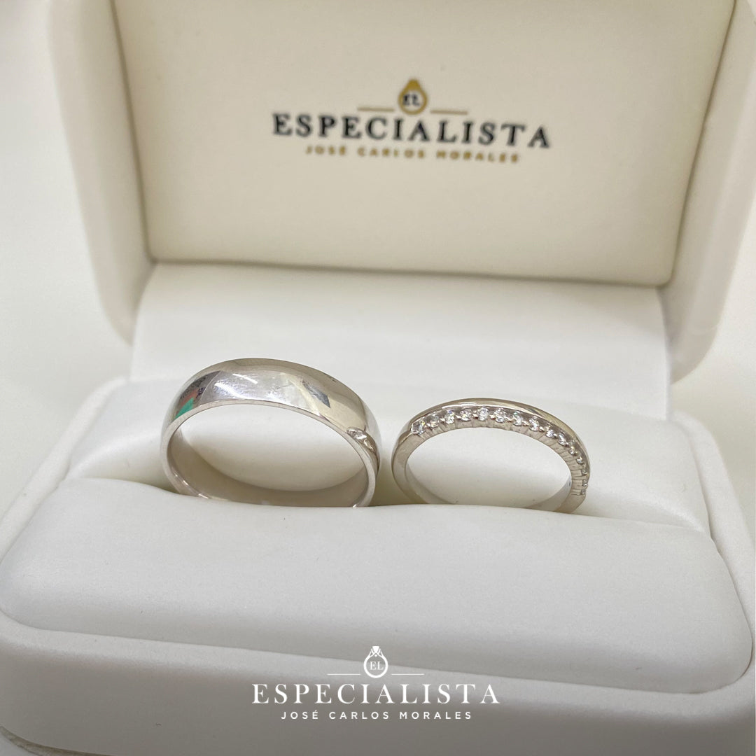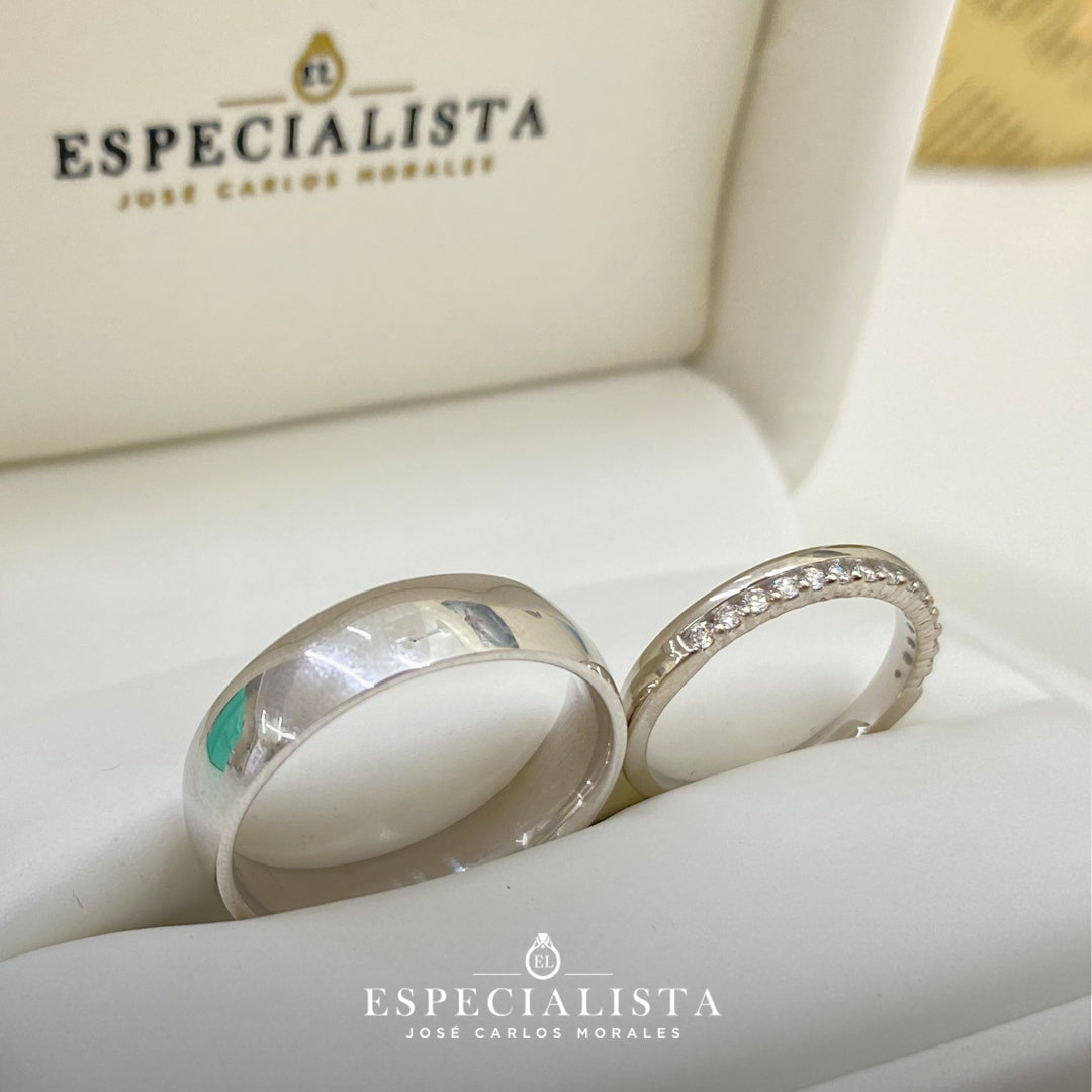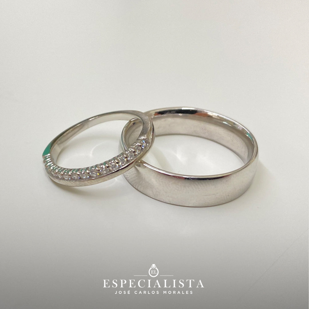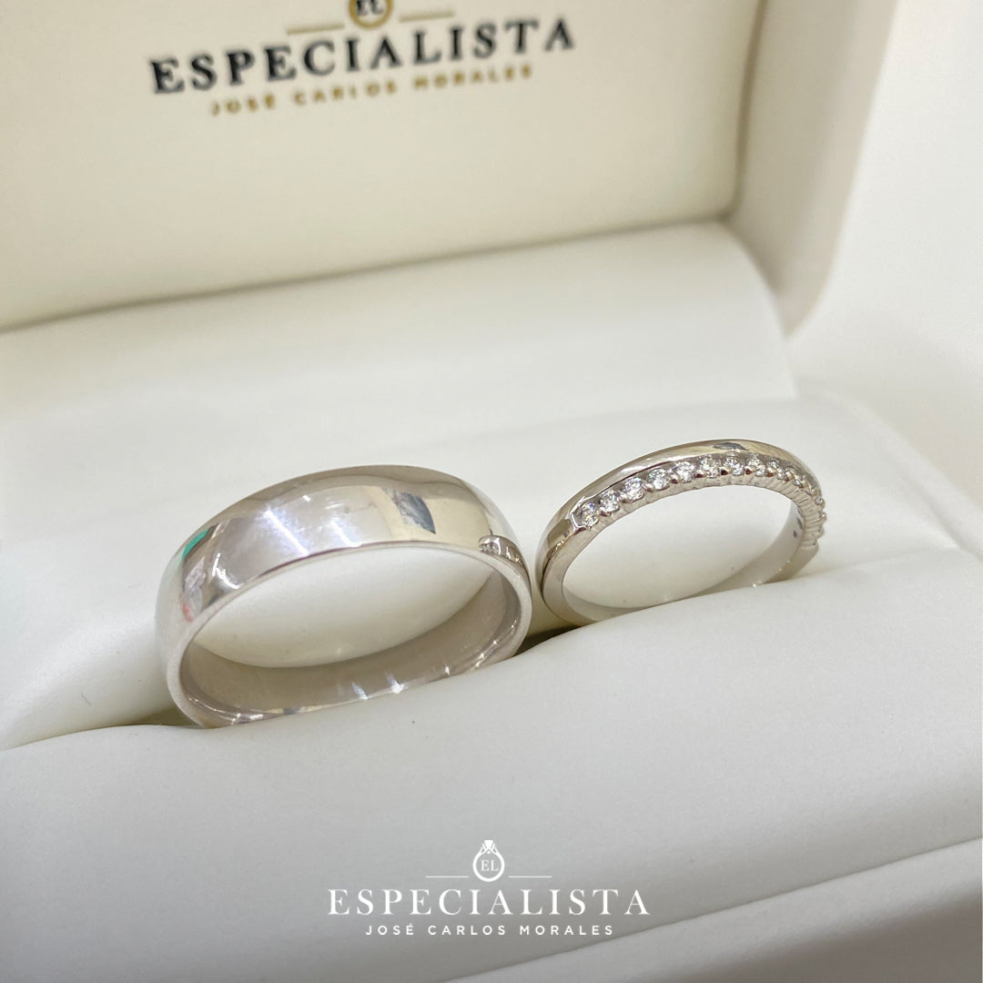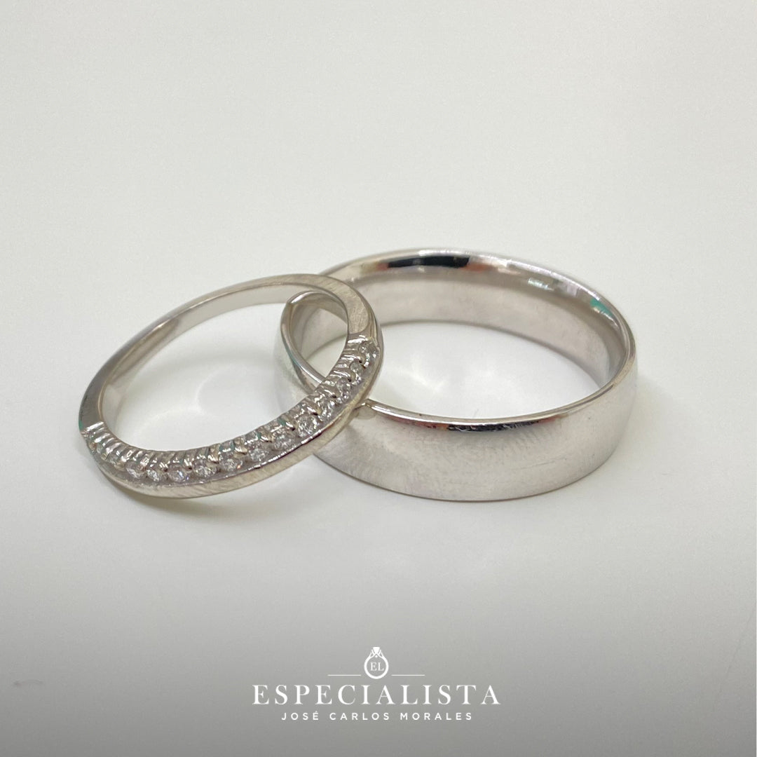 Argolla matrimonial en oro blanco de 6 mm de ancho y churumbela en oro blanco de 14 Kilates montado con 18.75pts de diamantes naturales