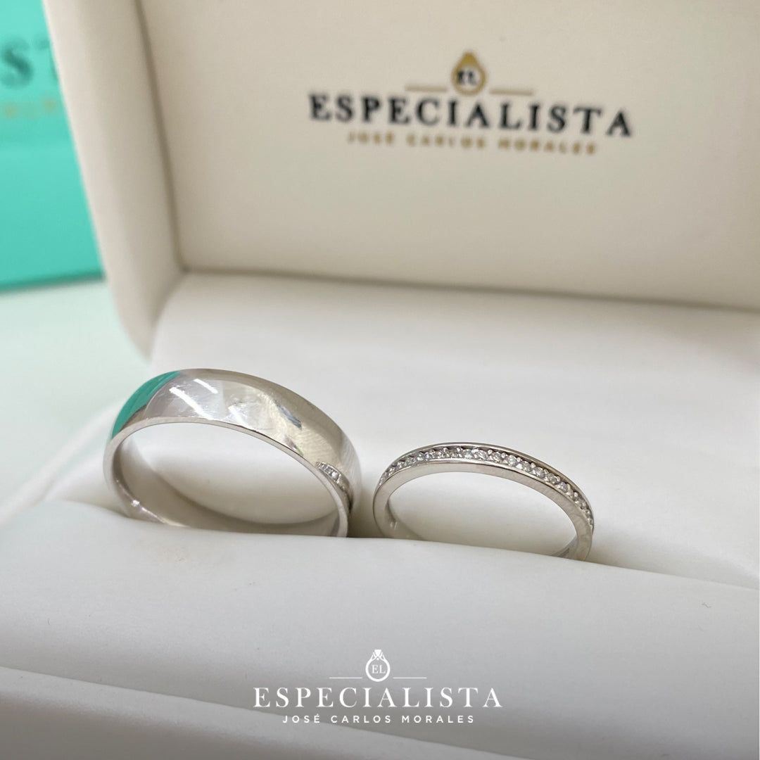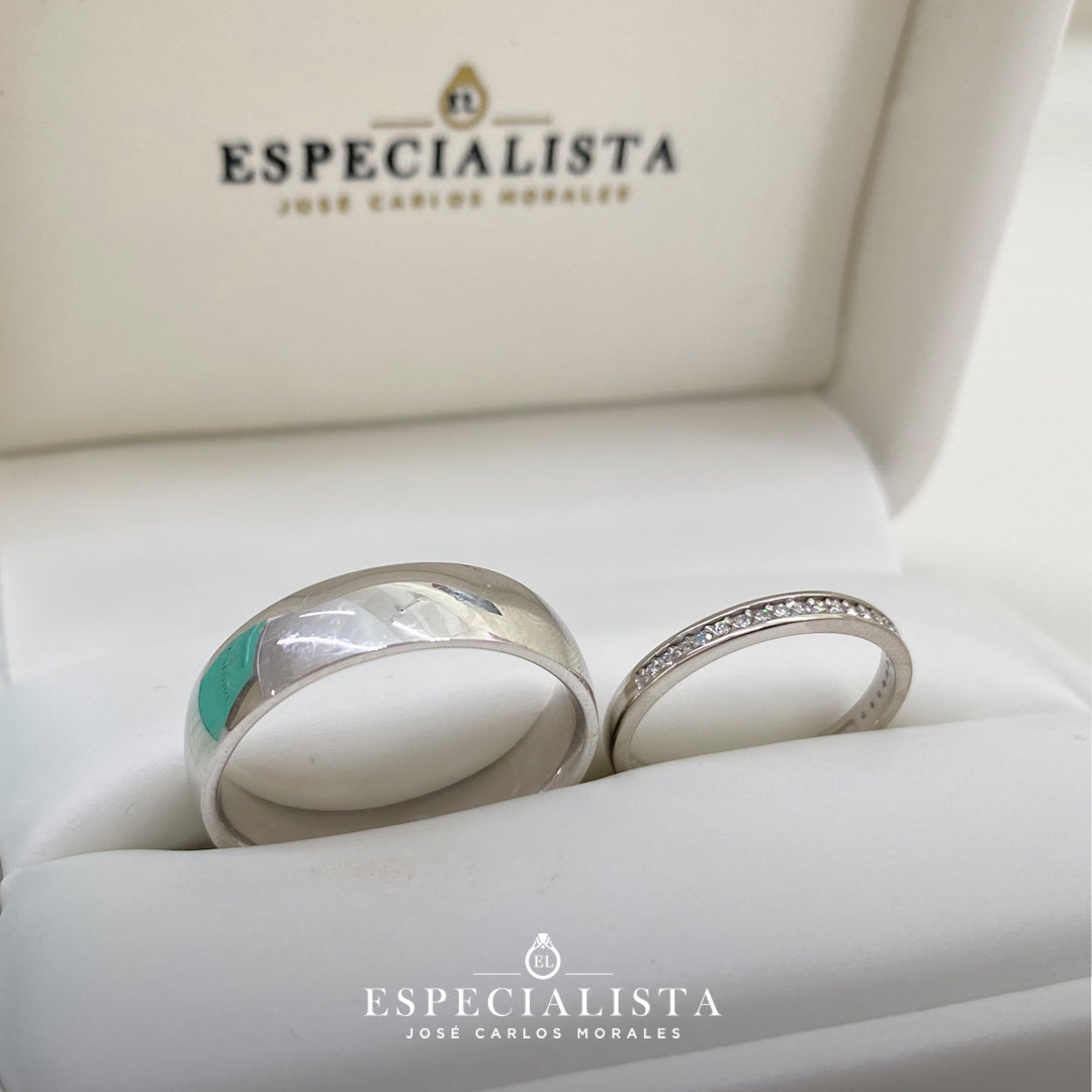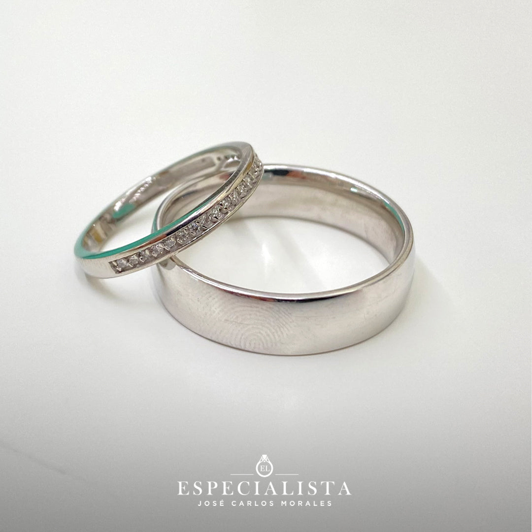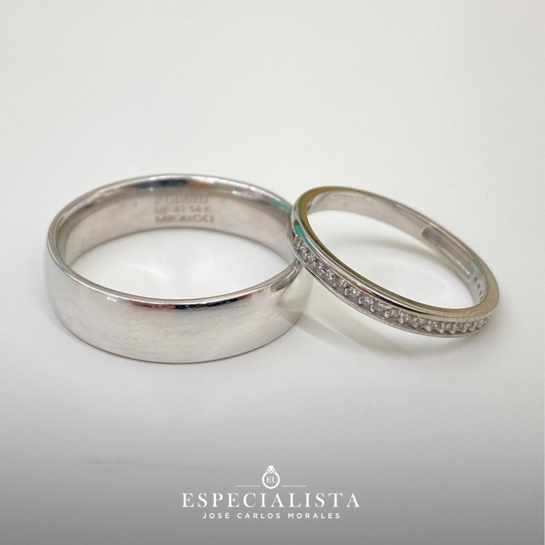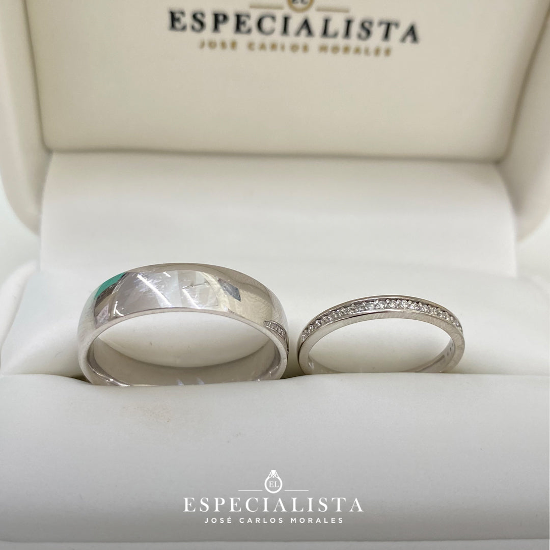 Argolla matrimonial en oro blanco de 6 mm de ancho y churumbela en oro blanco de montado con 18.75pts puntos de diamantes naturales