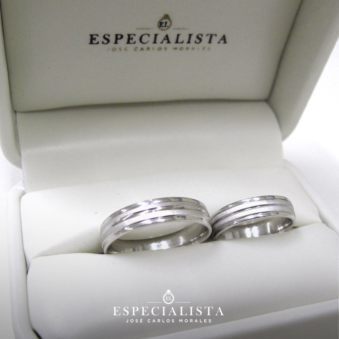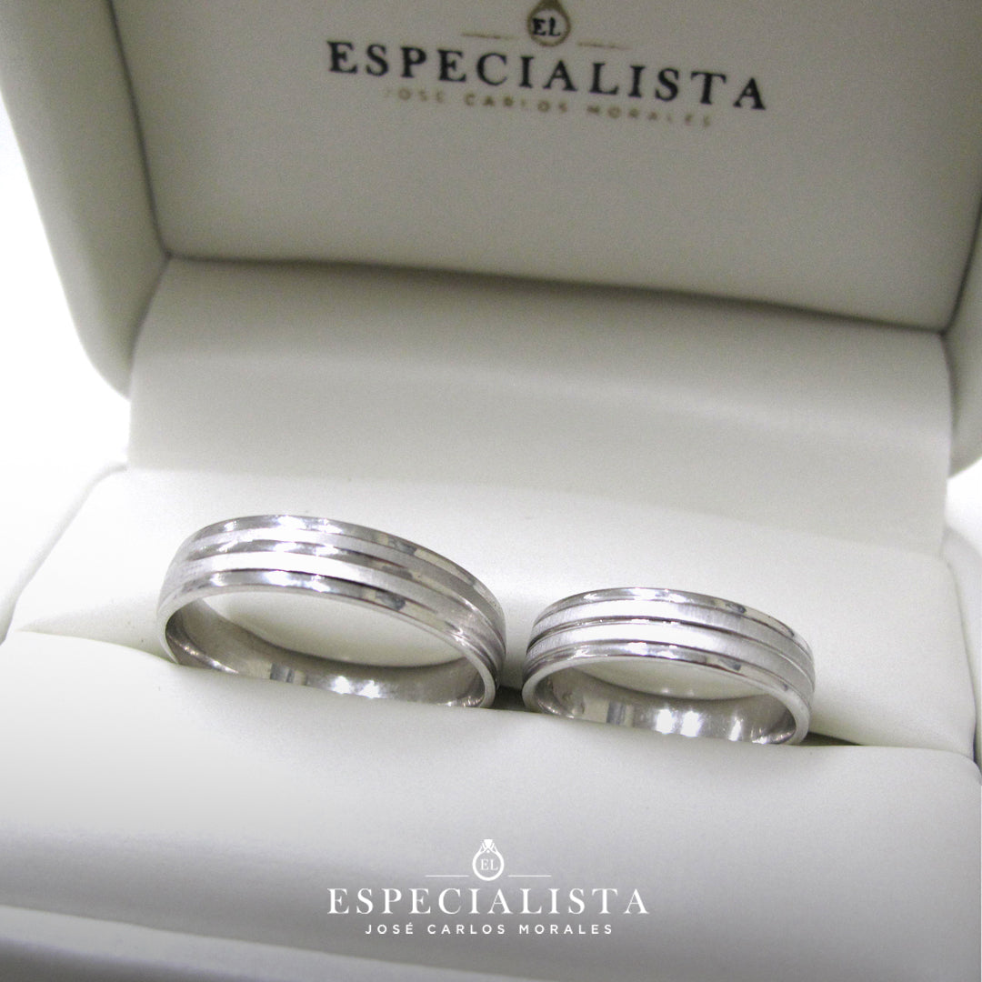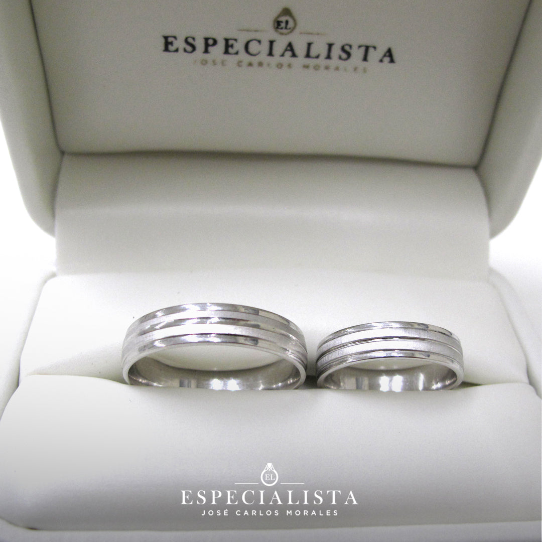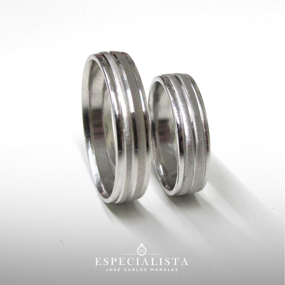 Par de Argollas de Matrimonio en oro blanco con acabado mate y linea al centro.