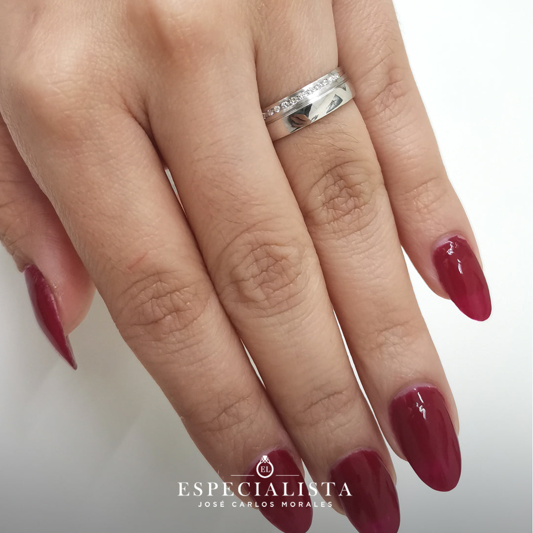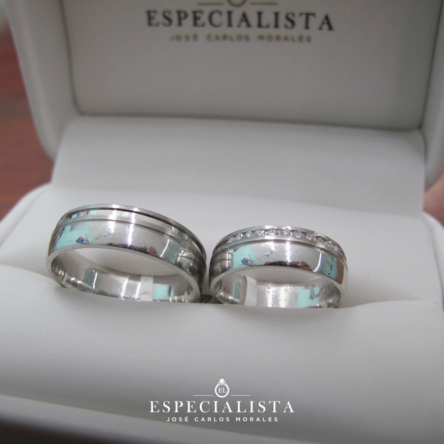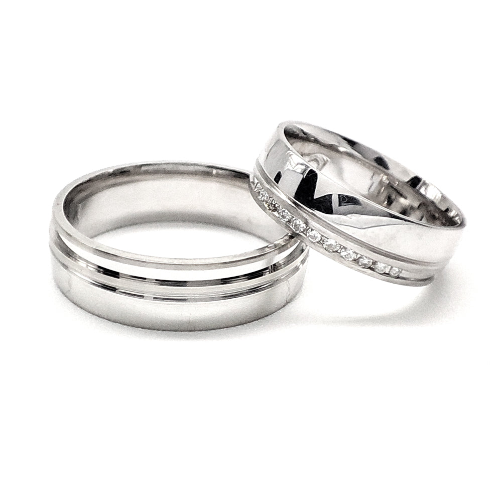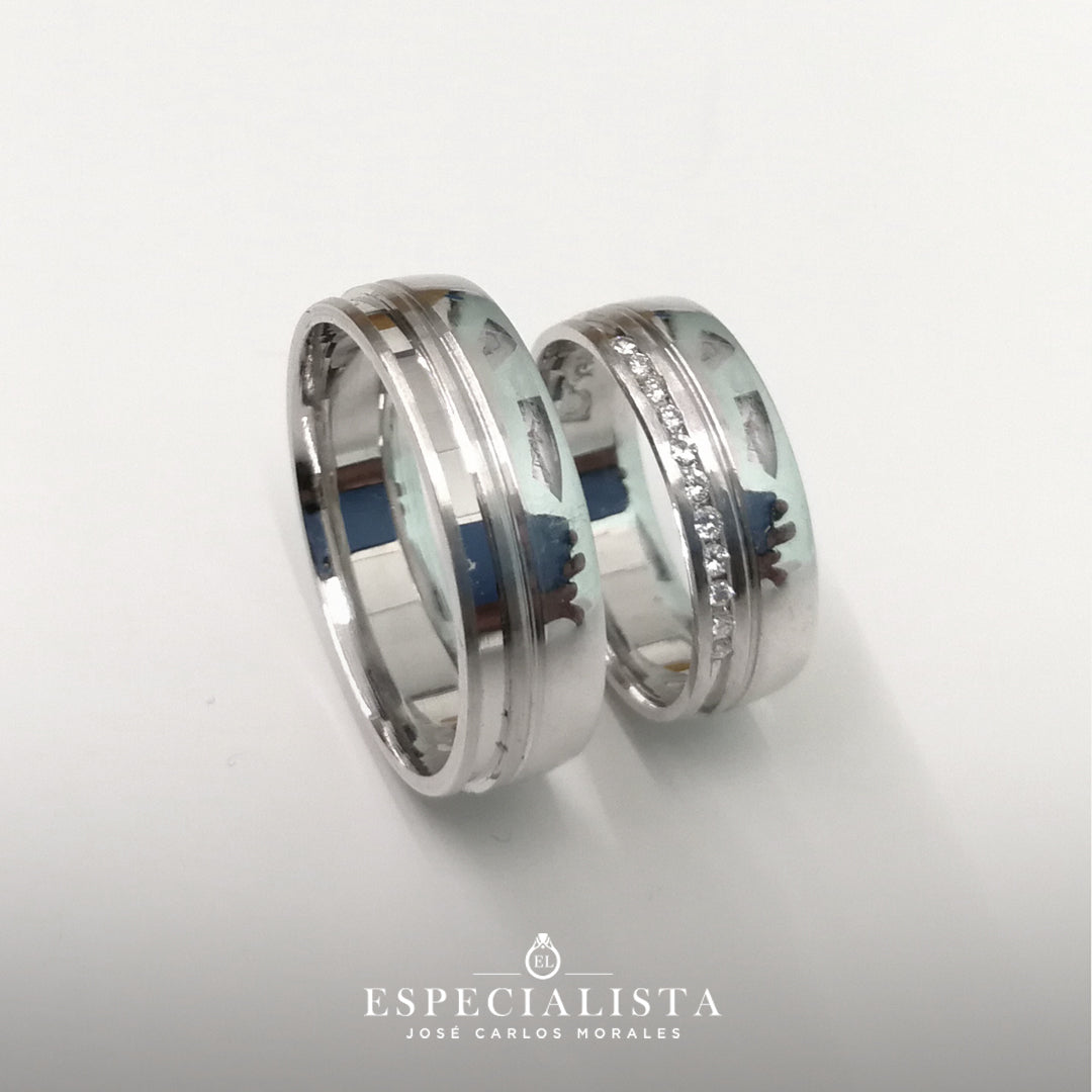 Par de argollas de matrimonio en oro blanco, diseño alrededor de la argolla de caballero 6 mm sin diamantes y 5.5 mm de ancho para dama con 11 diamantes.