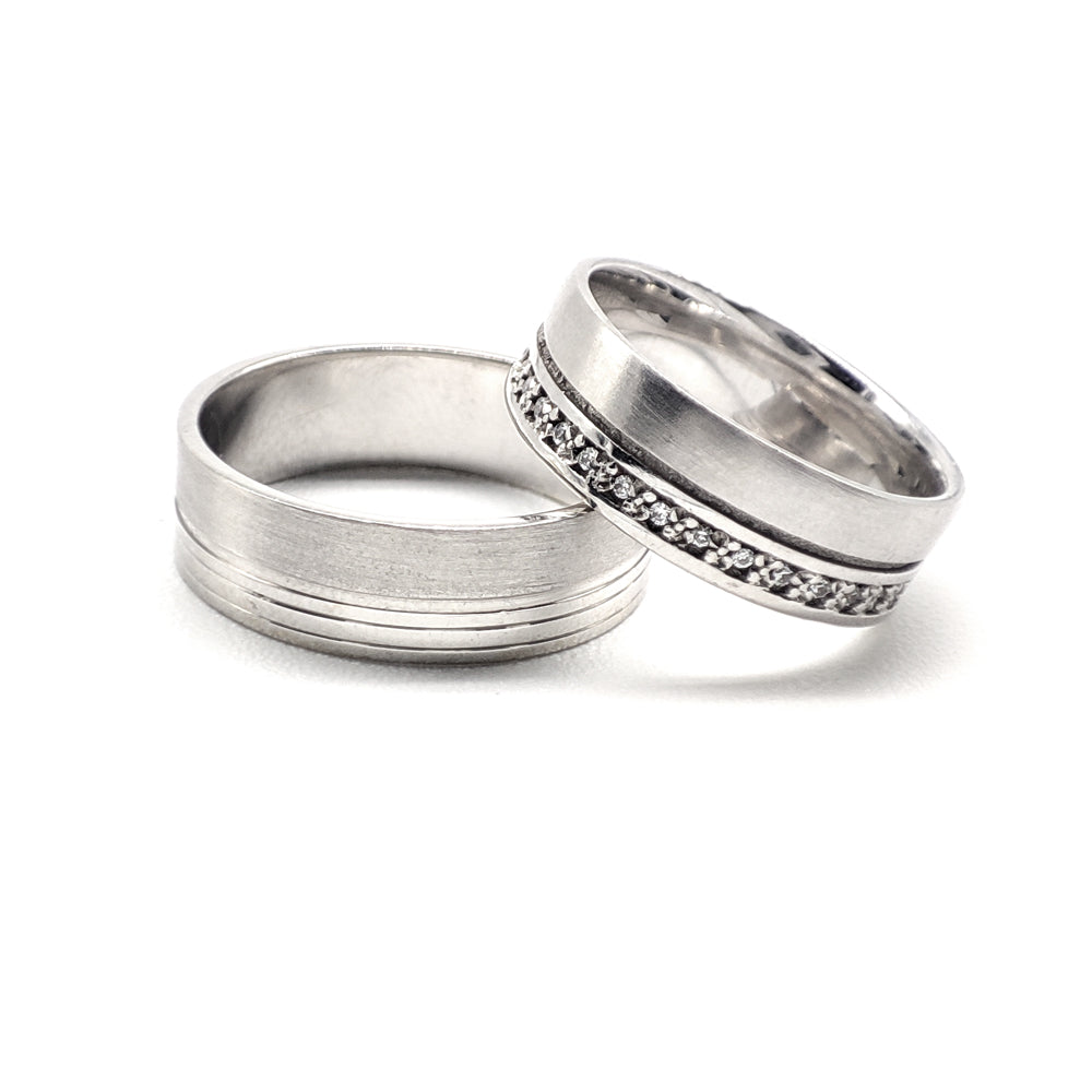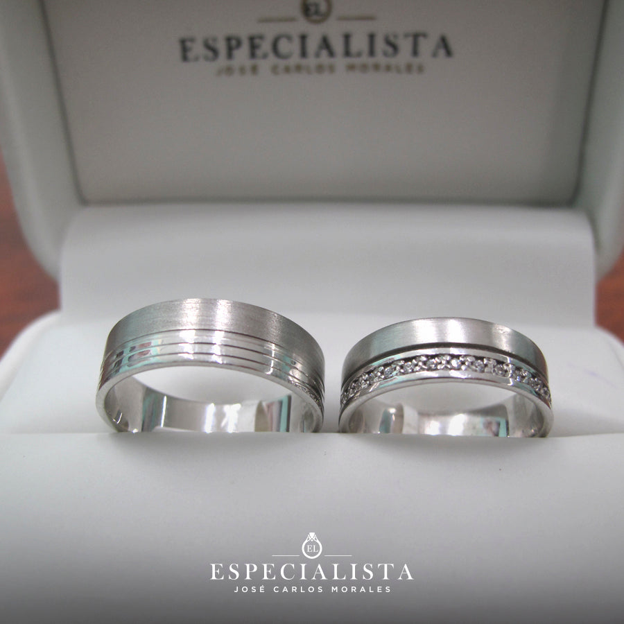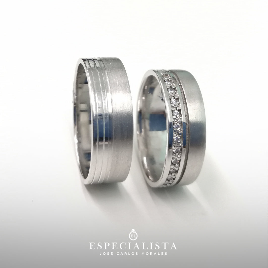 Par de argollas de matrimonio en oro blanco. Una argolla incluye piedras circonias de alta calidad montadas alrededor.