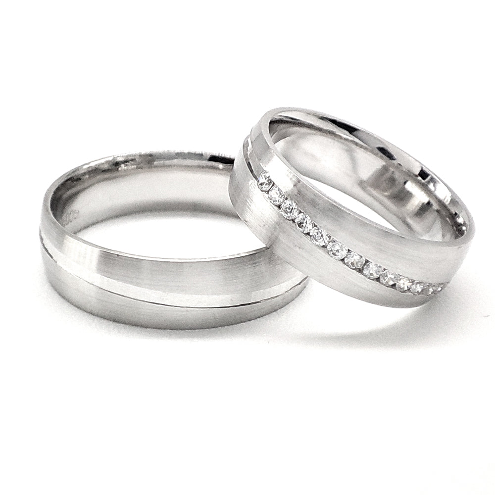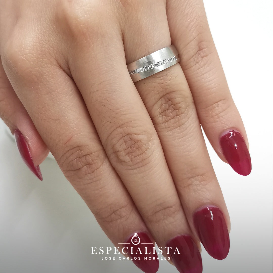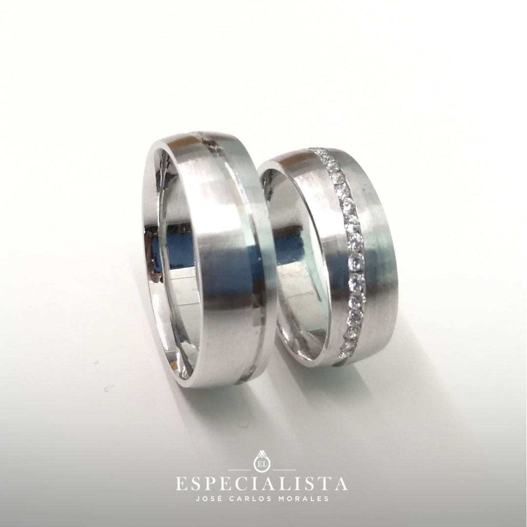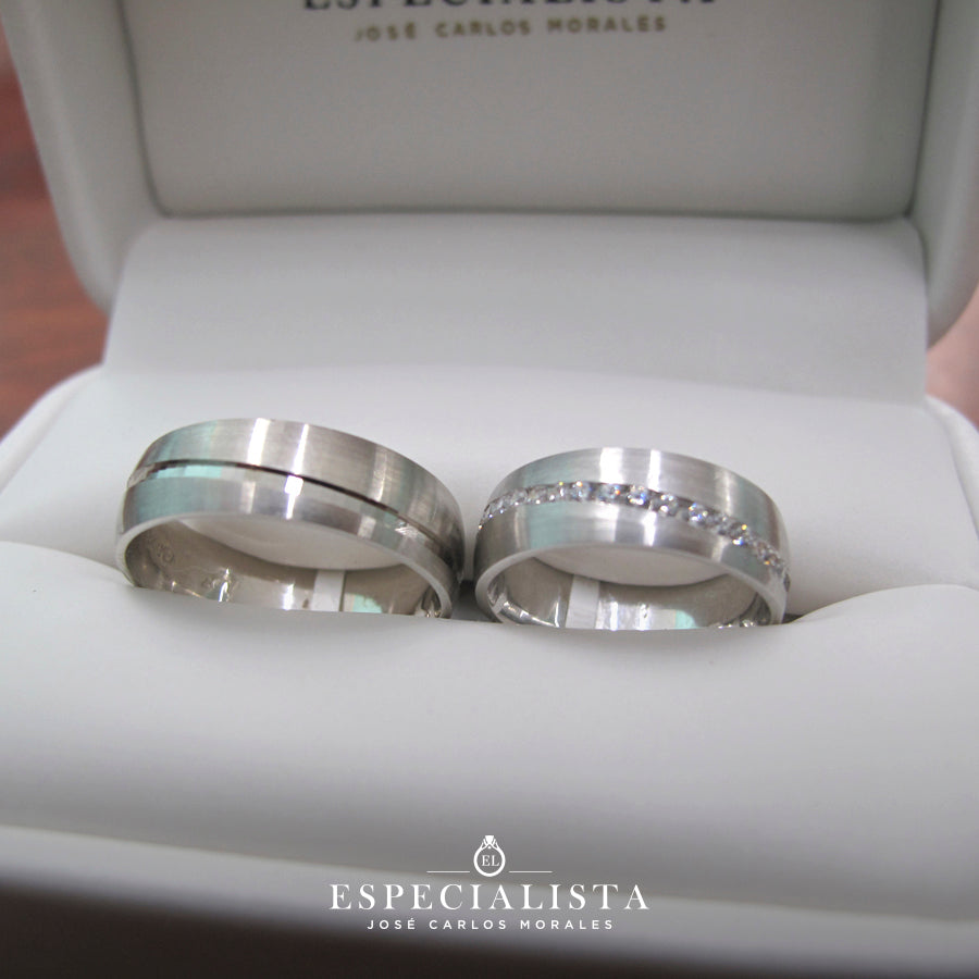 Par de argollas de matrimonio en oro blanco, diseño tradicional y un canal en forma de onda alrededor de las argollas.