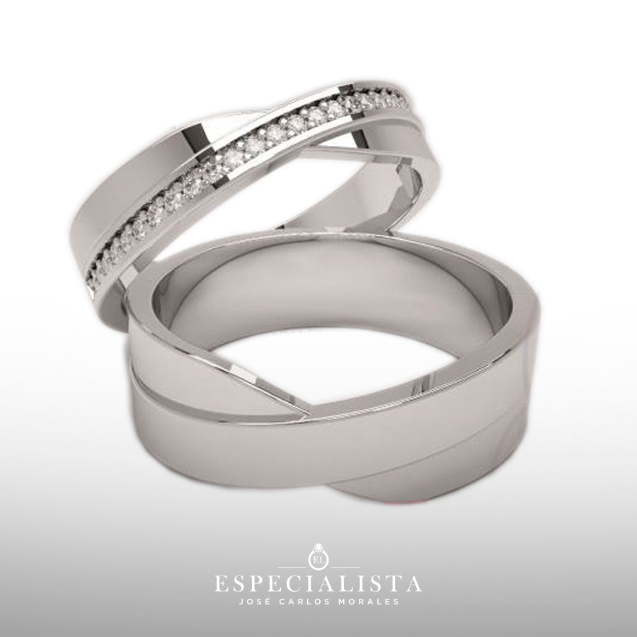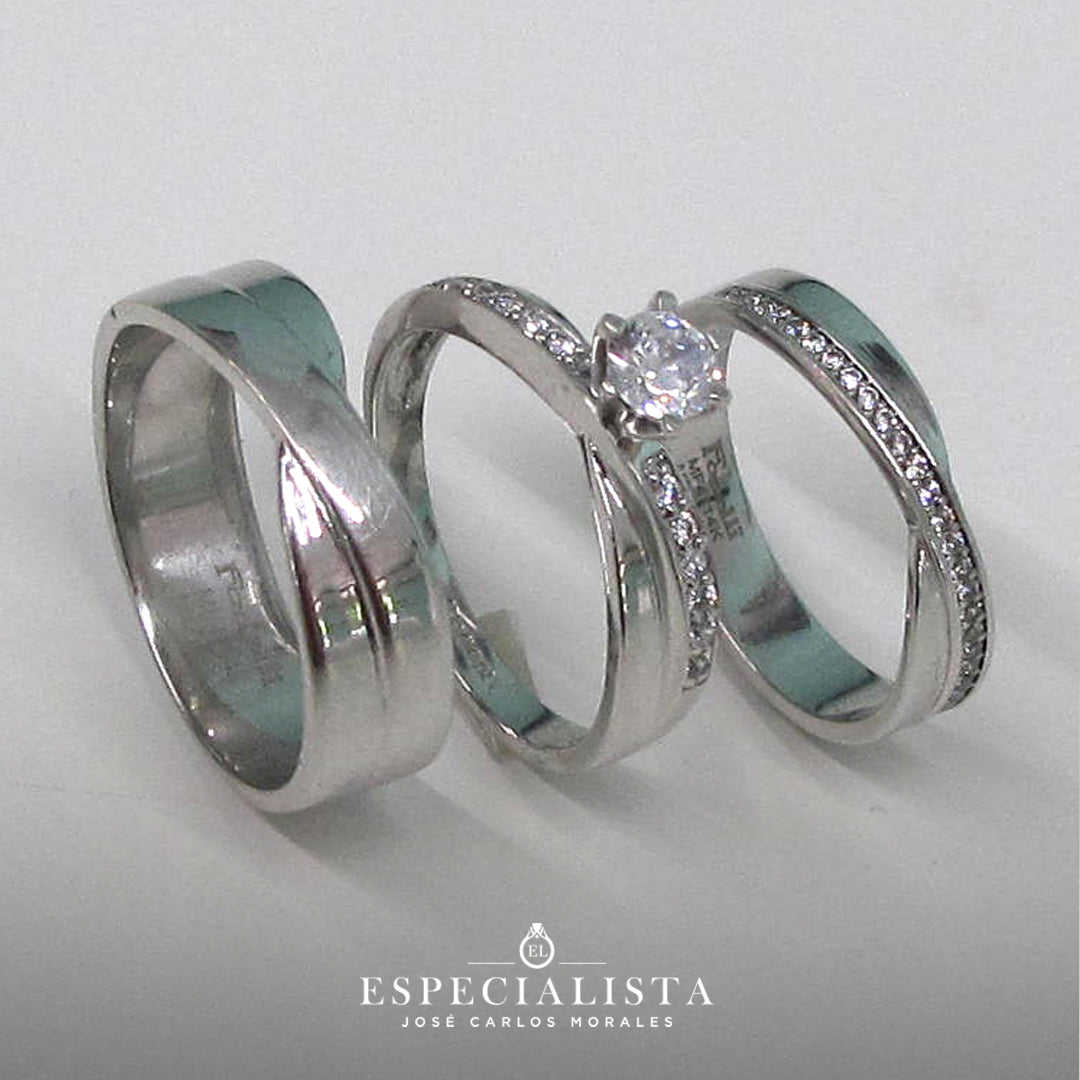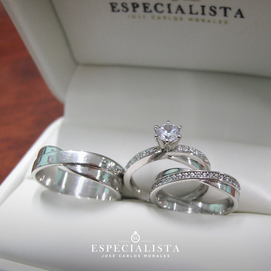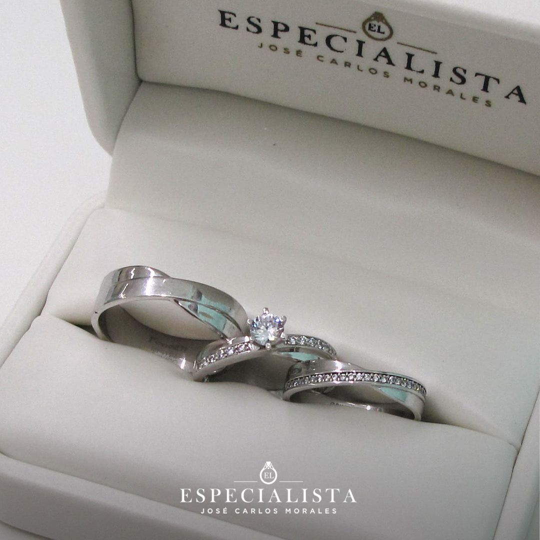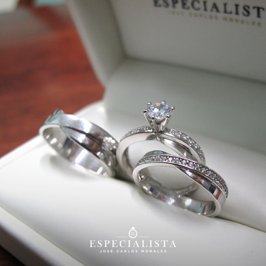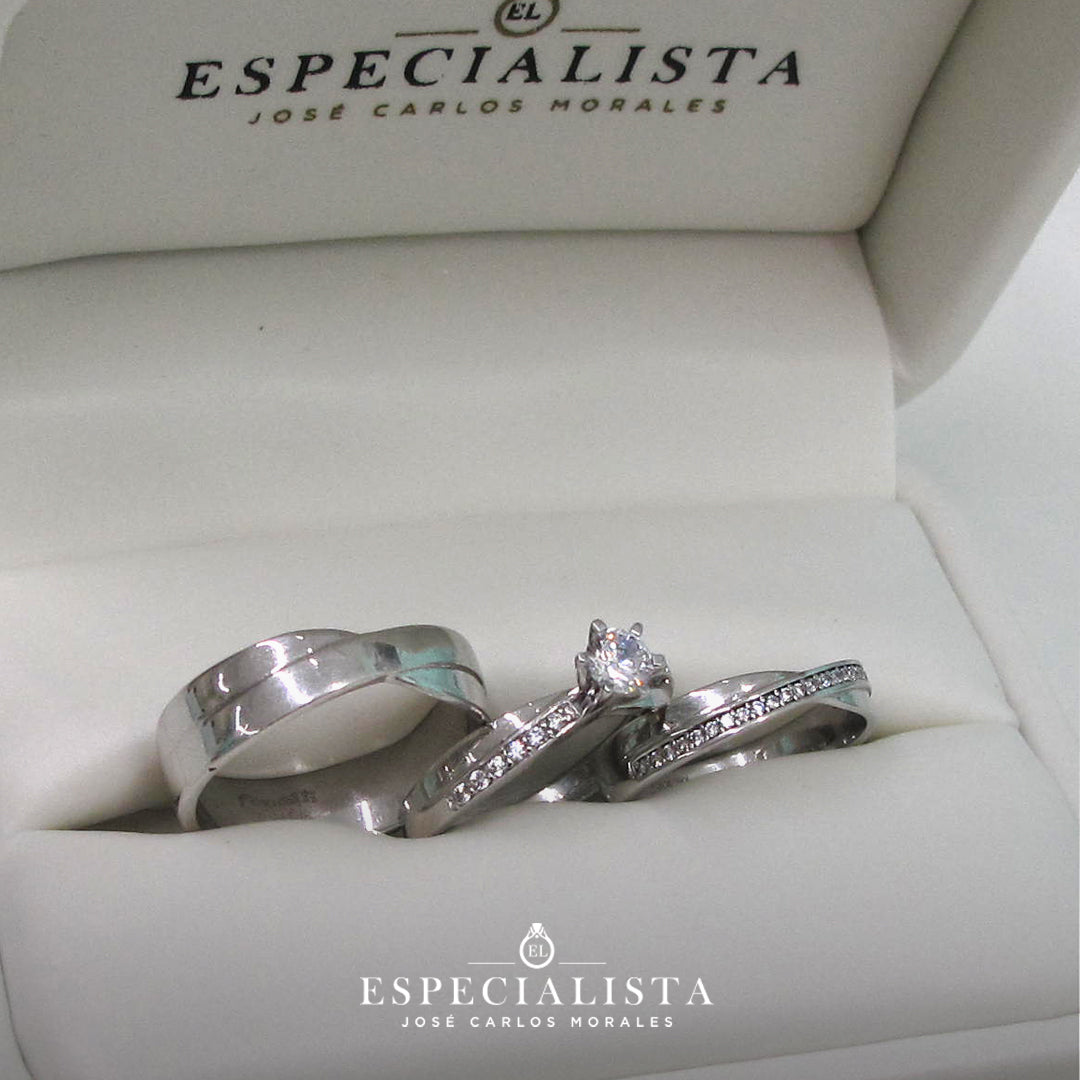 Argolla de matrimonio en oro blanco de 14 kilates, churumbela con piedras circonias y anillo de compromiso en oro blanco de 14 kilates con circonias importada de alta calidad.