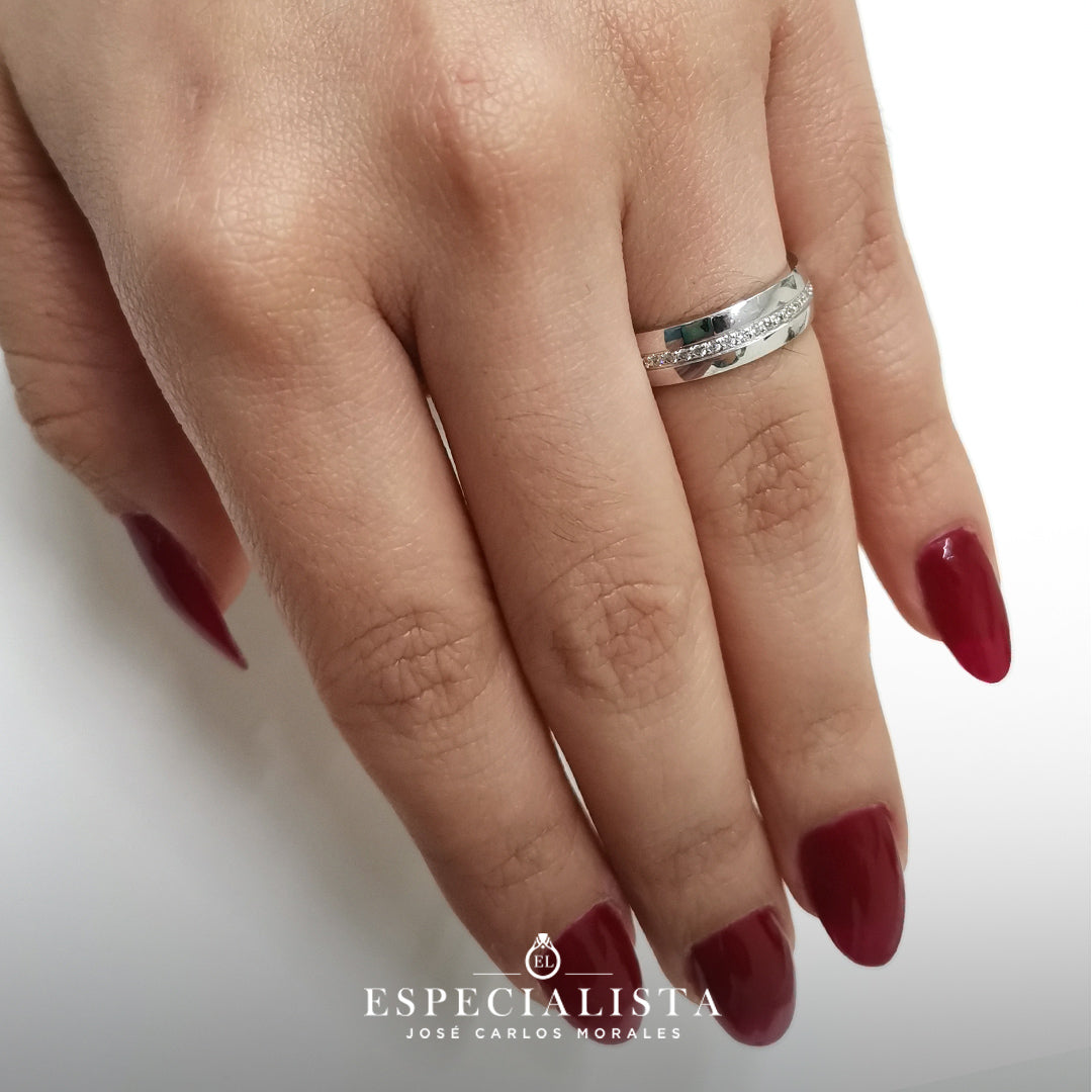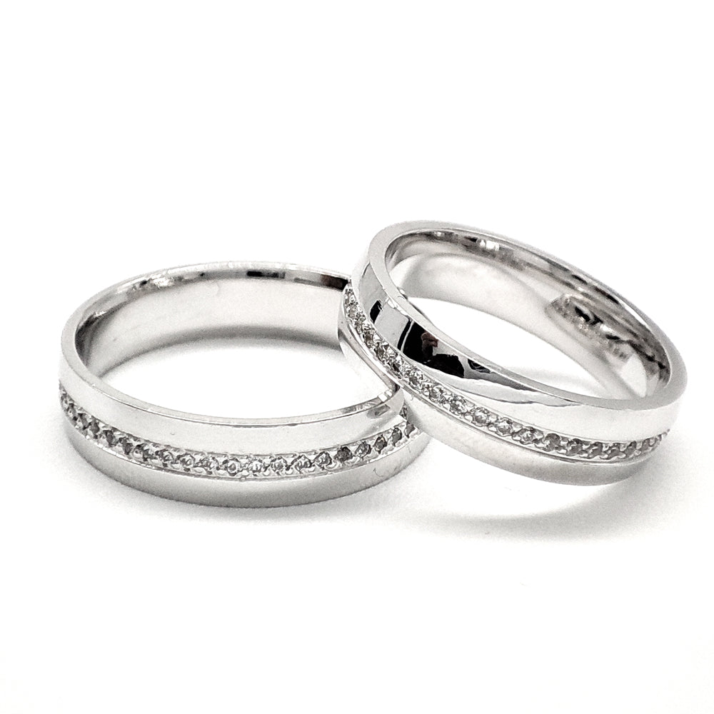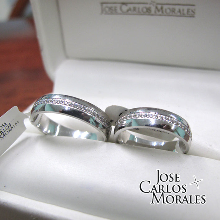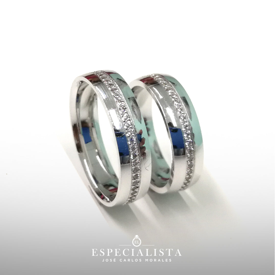 Argollas de matrimonio en oro blanco, fabricadas en 6 mm, con circonias alrededor de la pieza.
