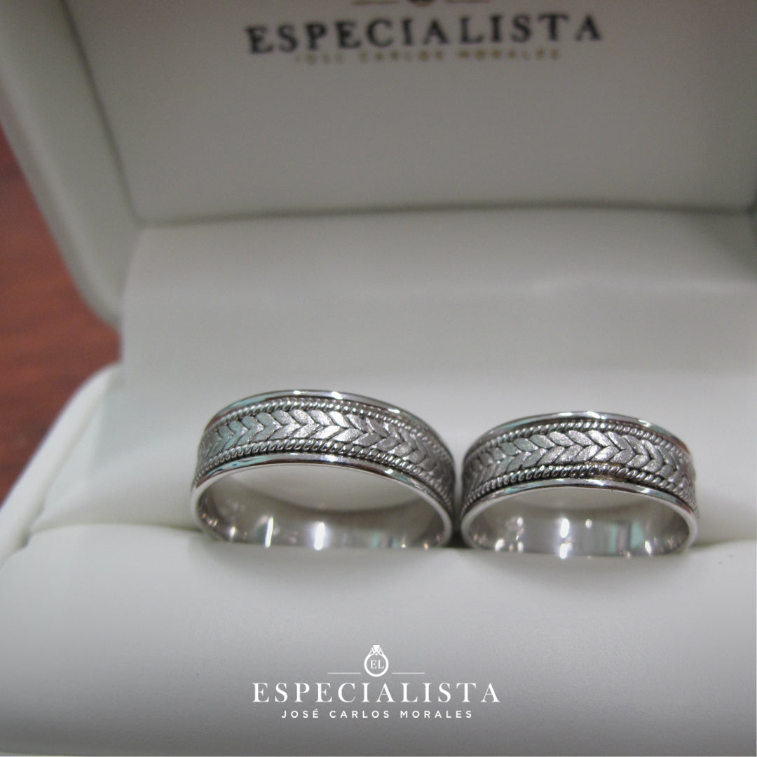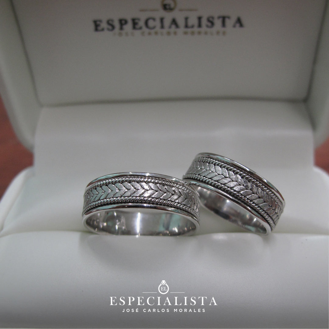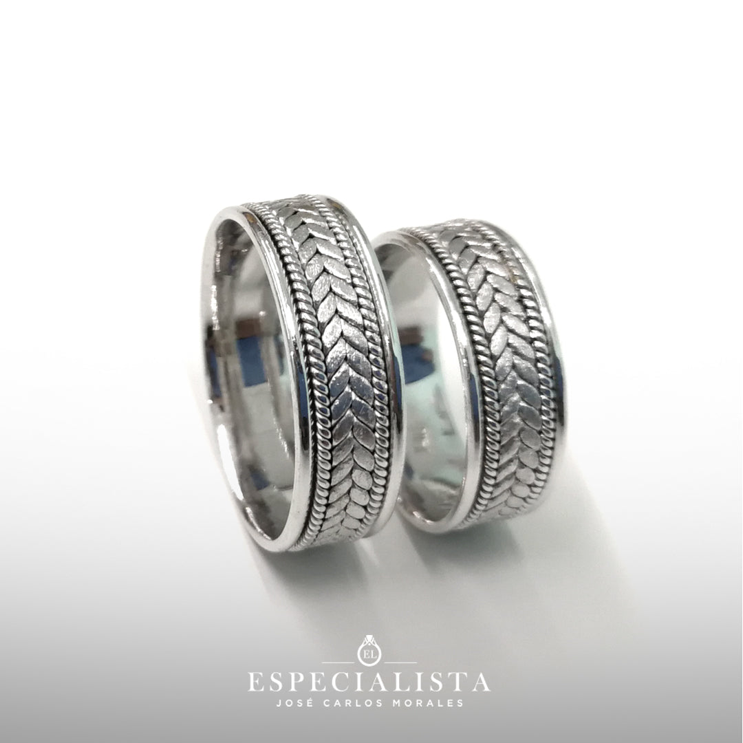 Par de argollas de matrimonio trenzadas, hechas a mano en oro blanco de 14 Kilates.
