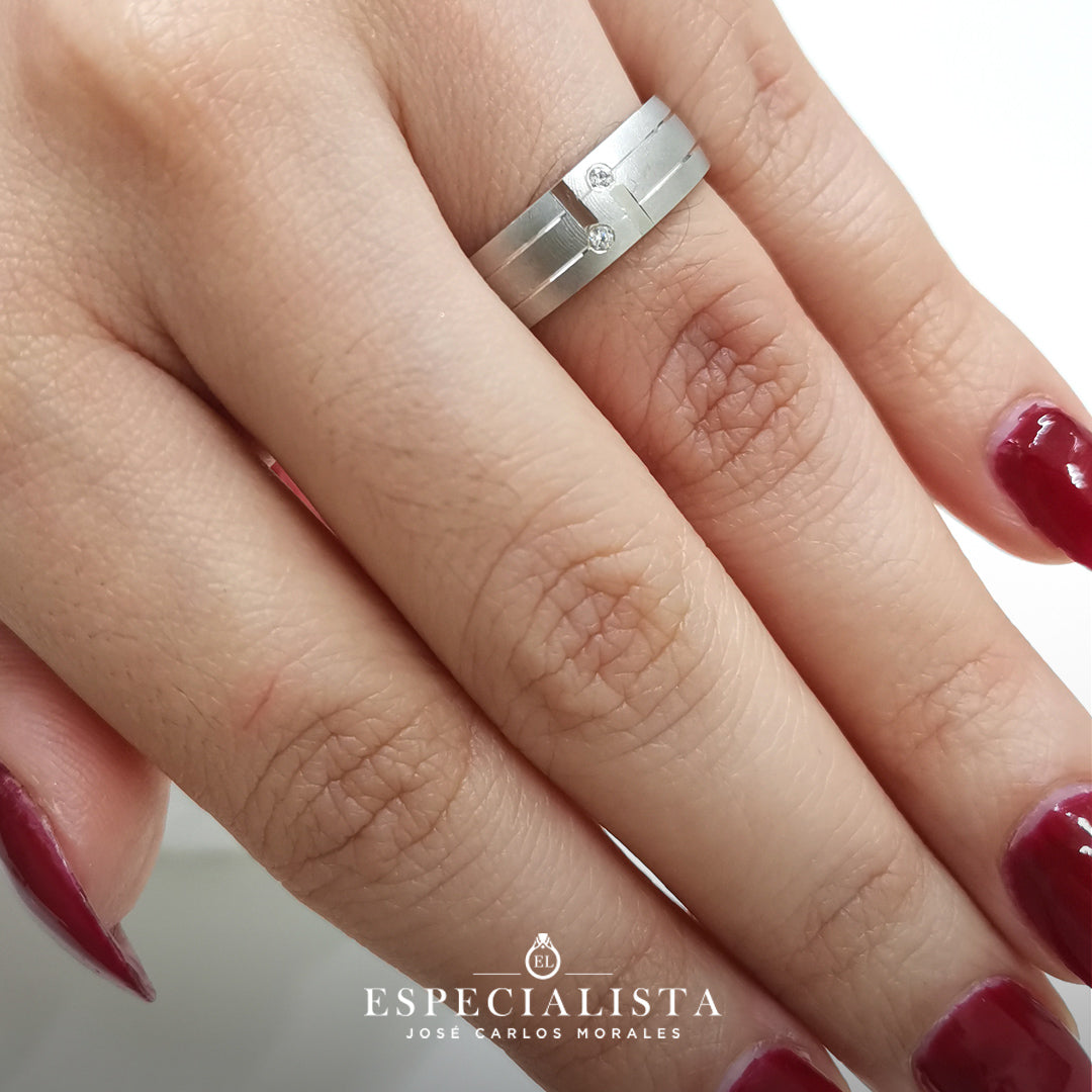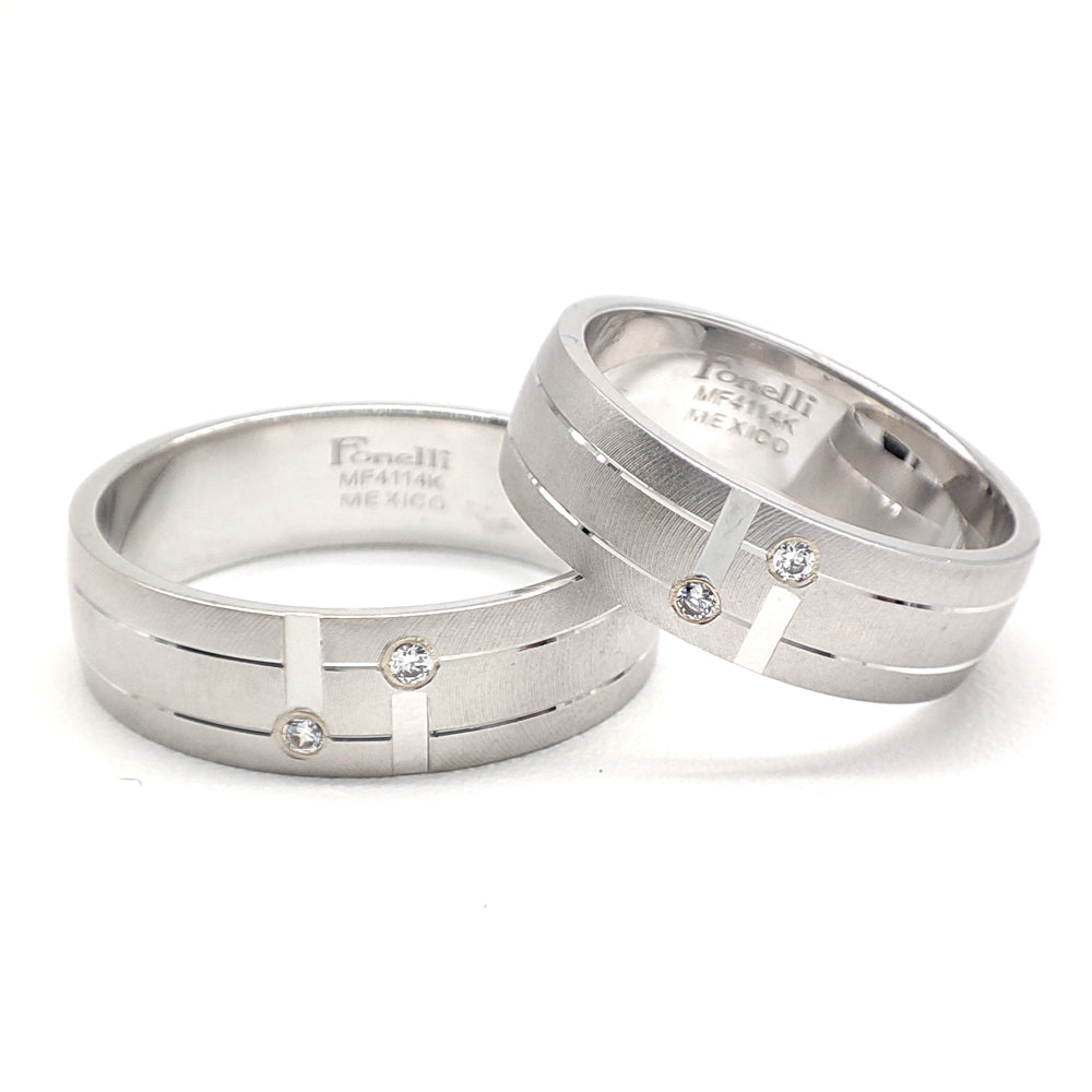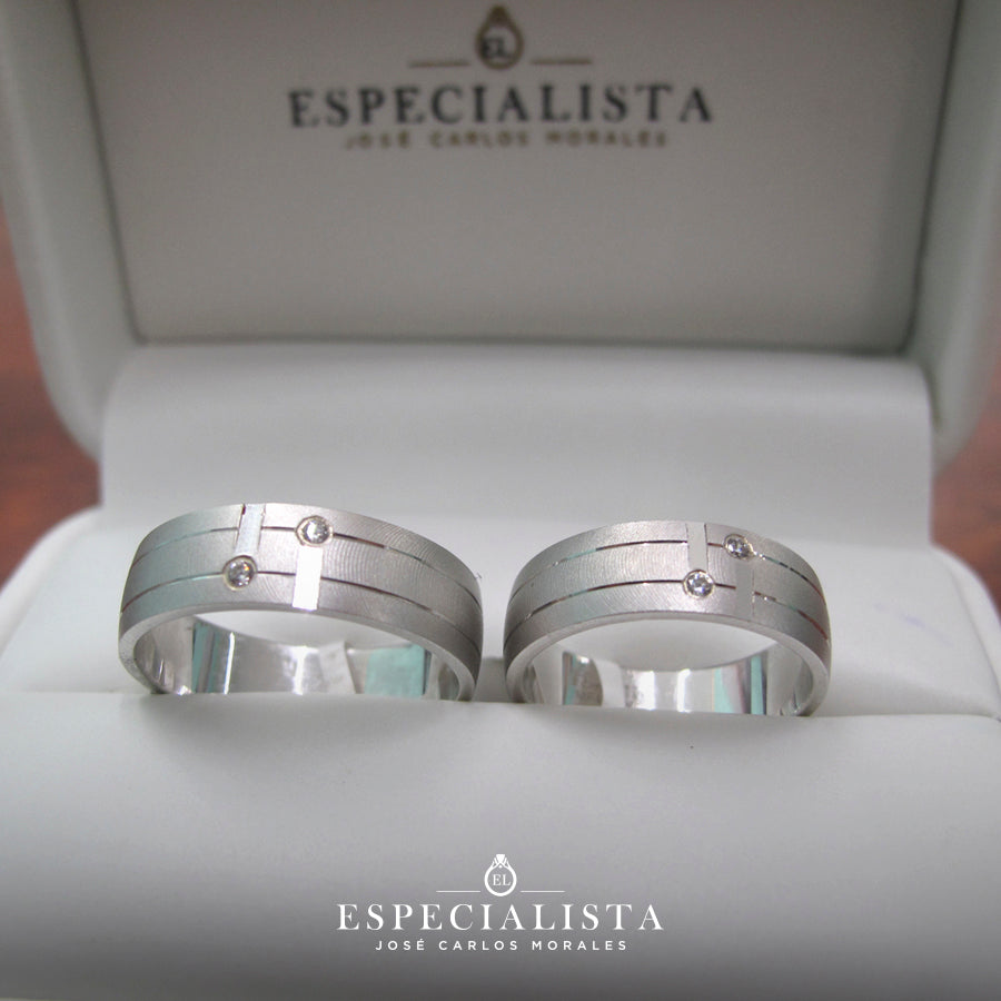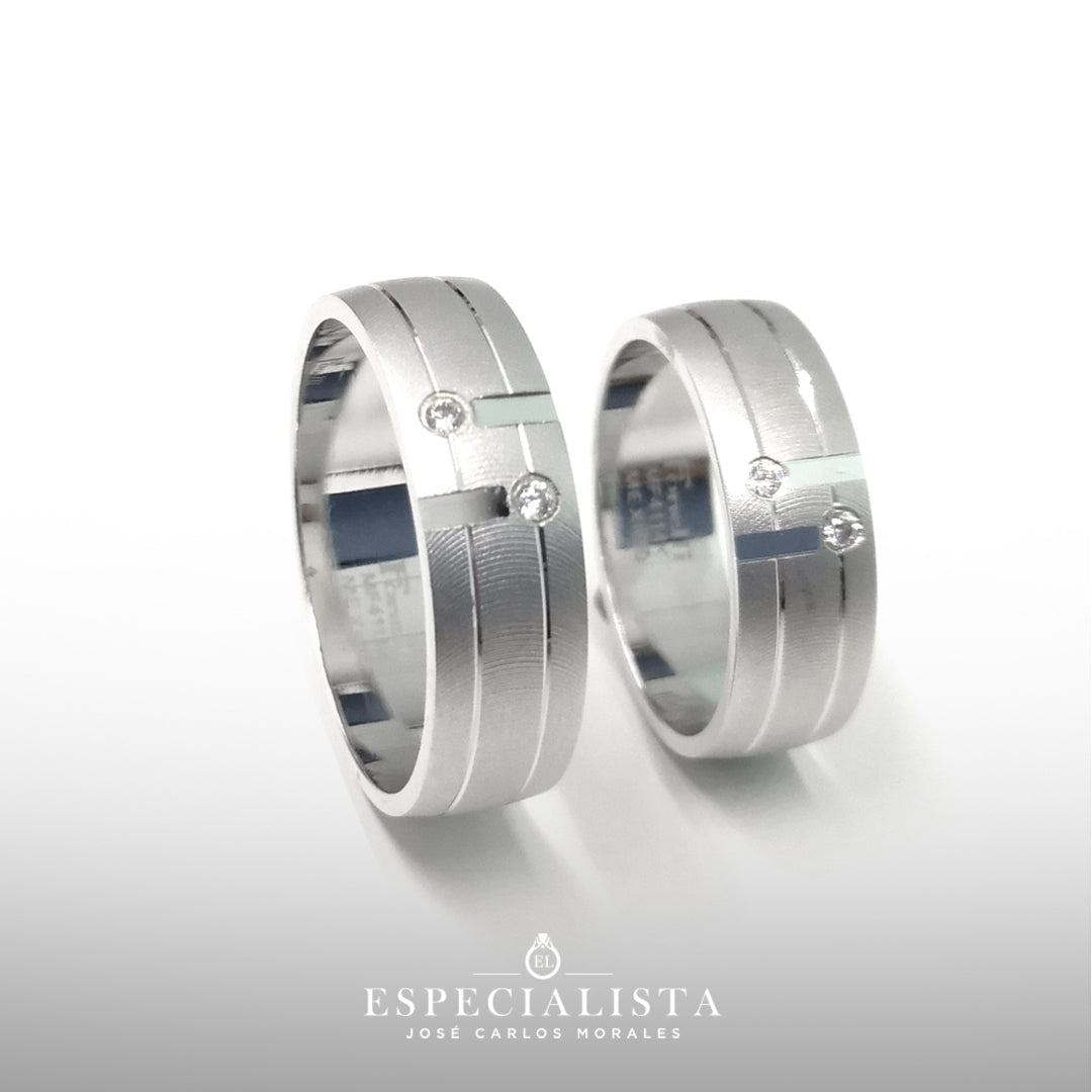 Par de argollas de matrimonio en oro blanco con dos piedras en circonia en cada argolla.
