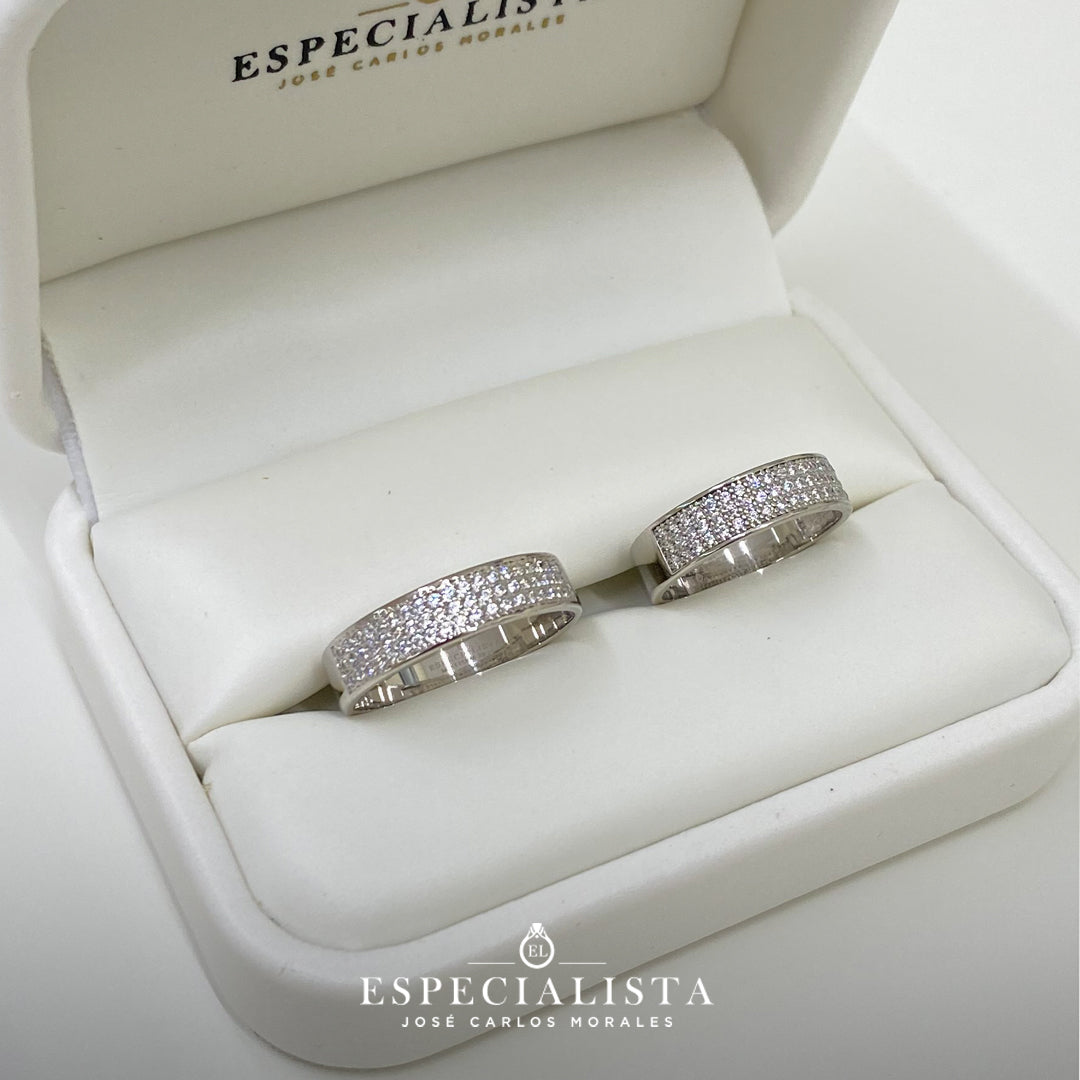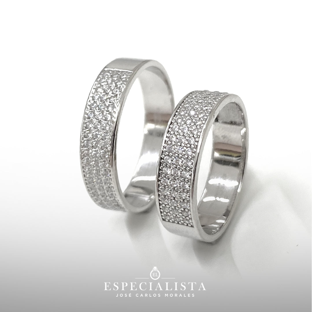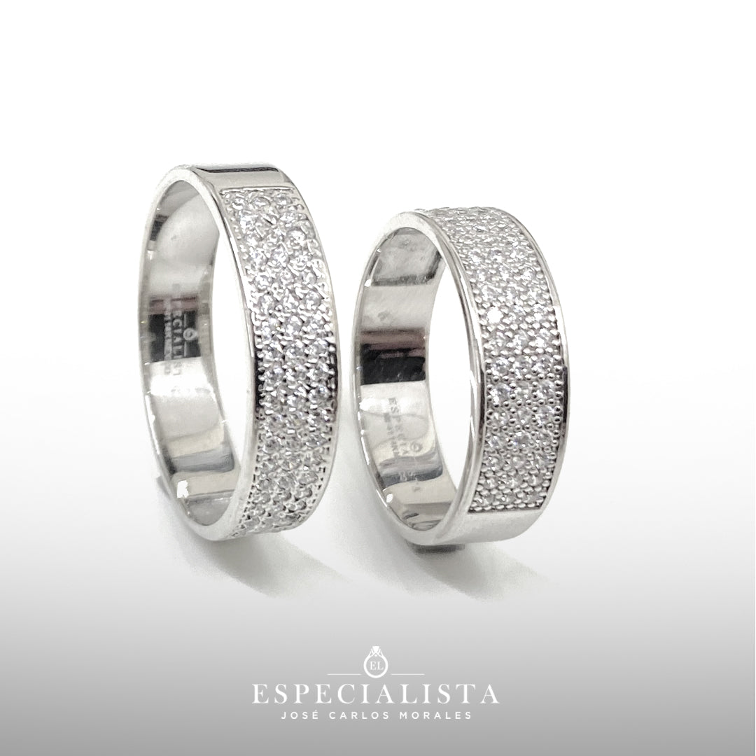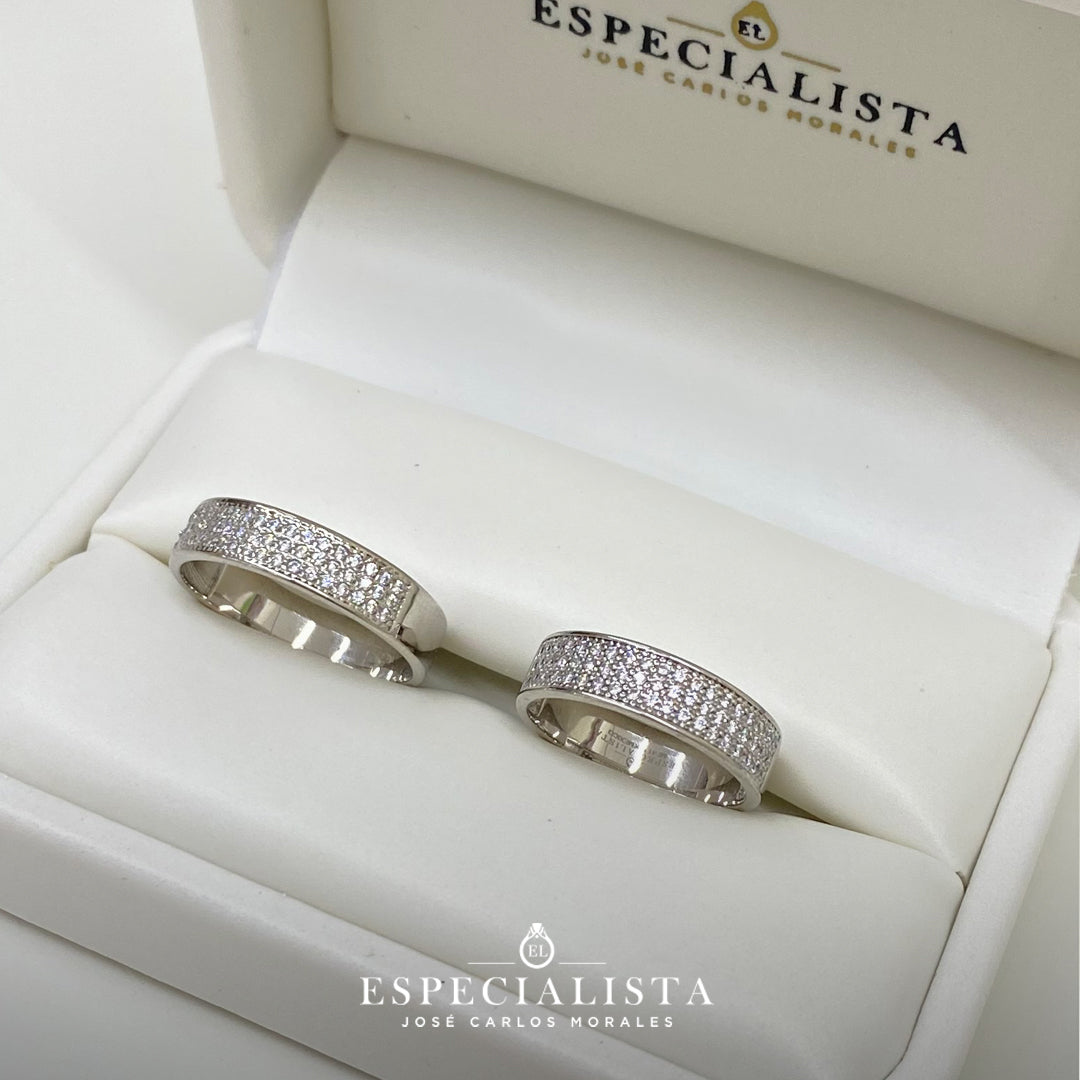 Par de anillos para boda en oro blanco de 14 Kilates con circonias al frente.