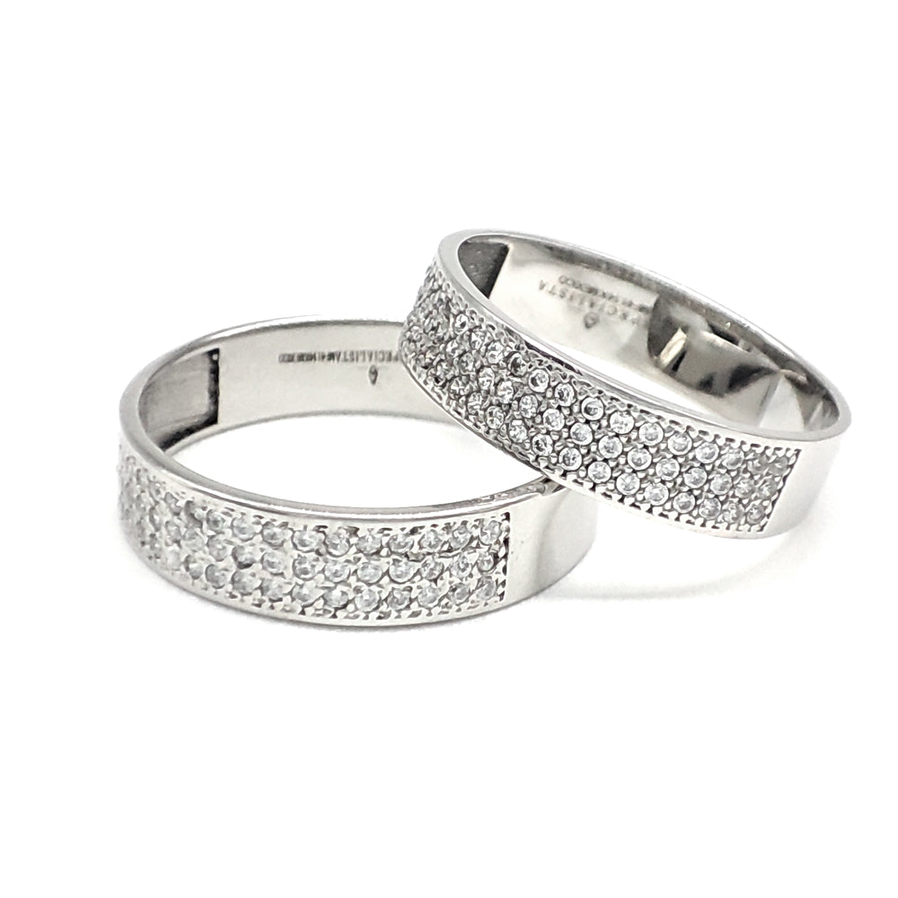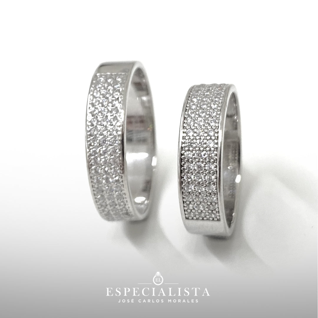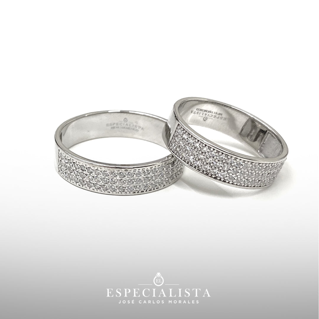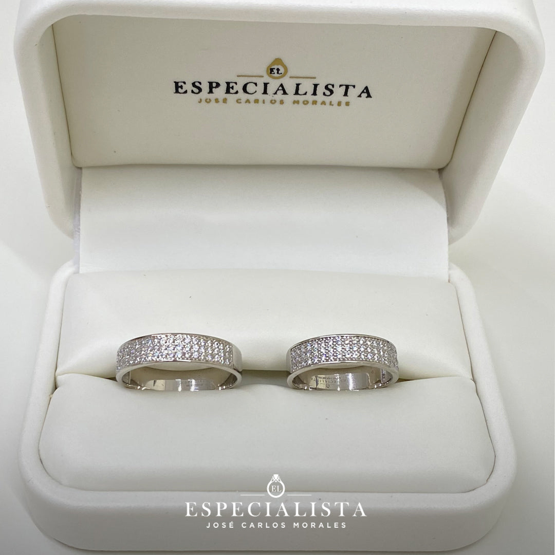 Par de anillos para boda en oro blanco de 14 Kilates con circonias al frente.