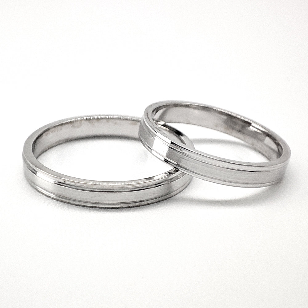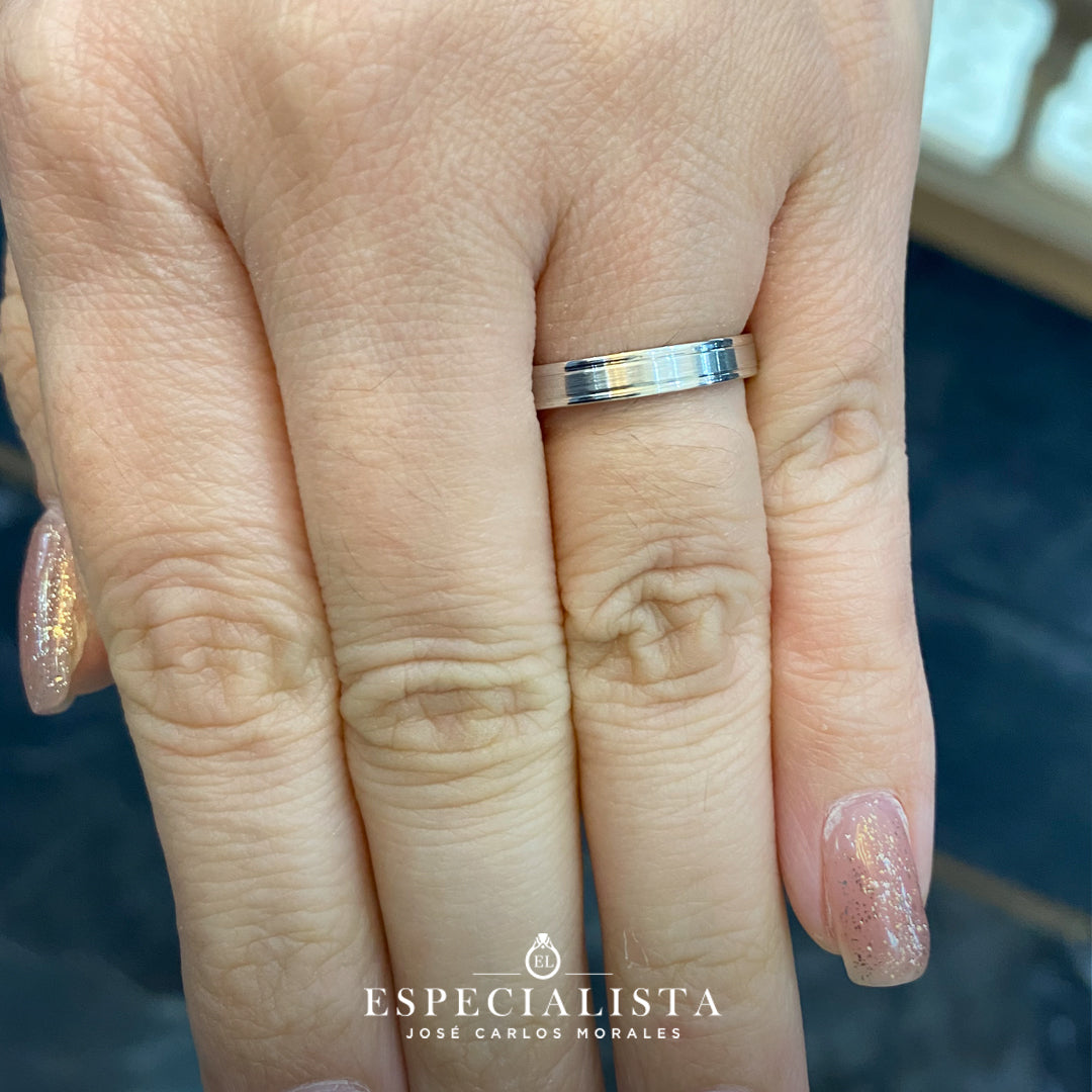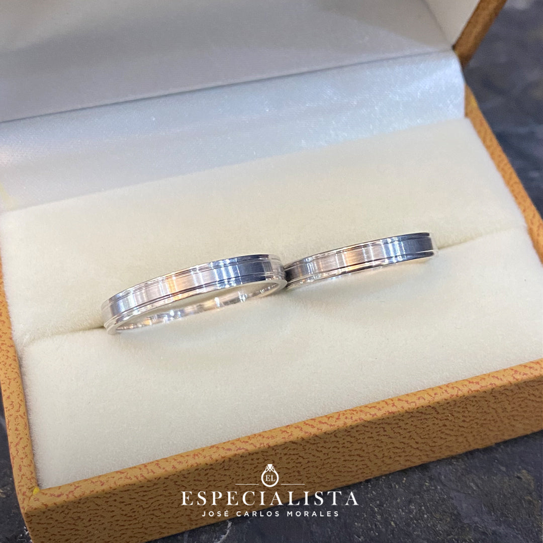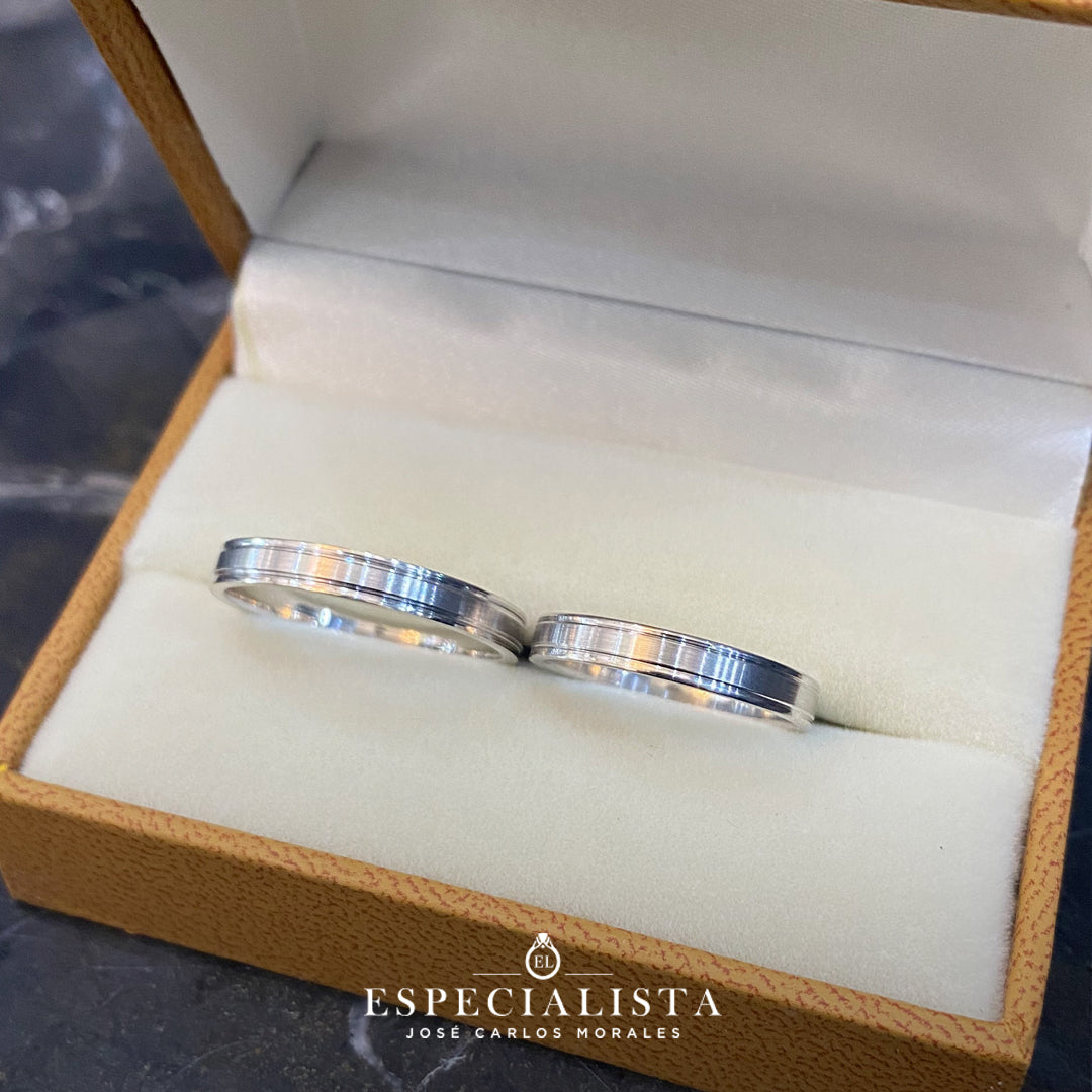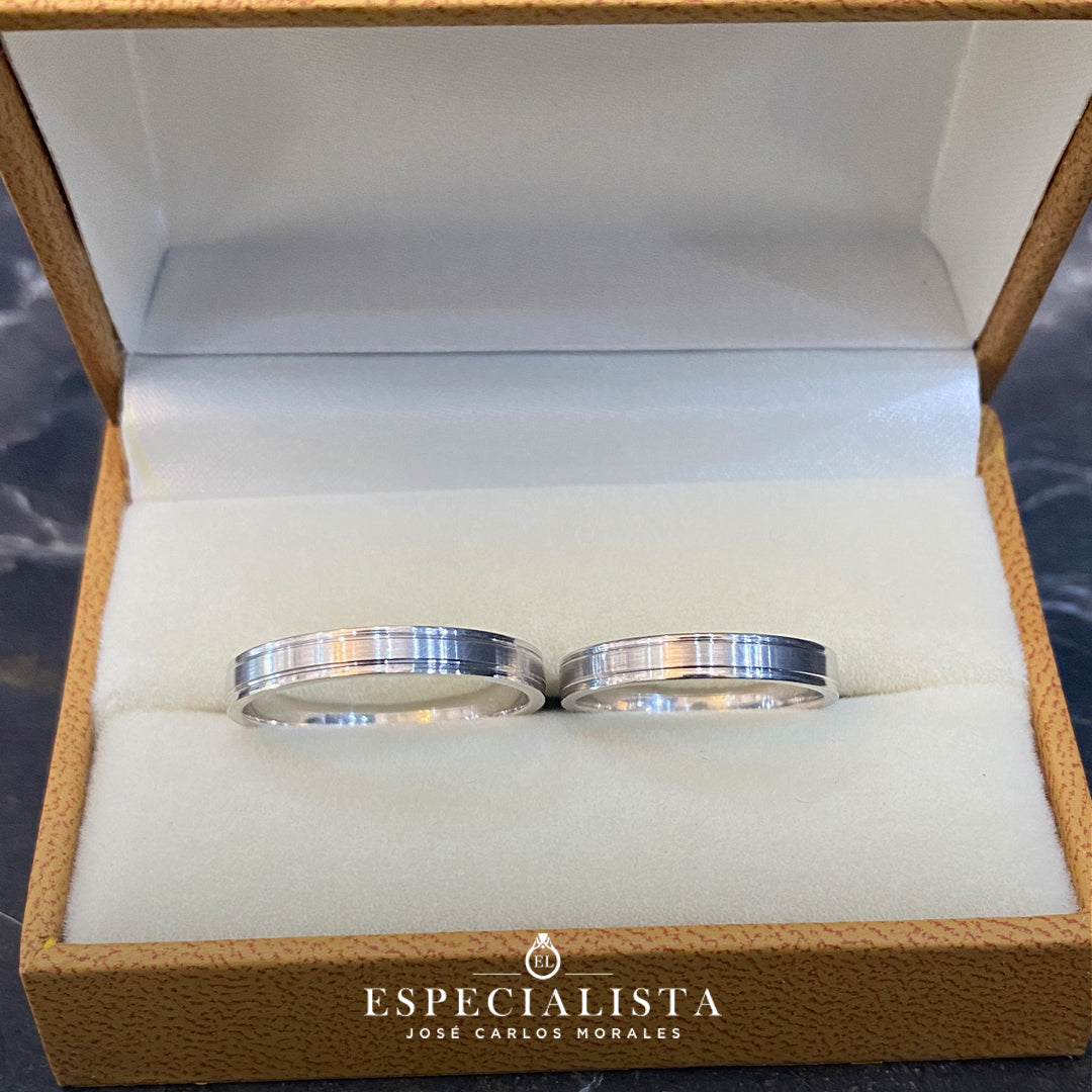 Argollas de matrimonio en oro blanco, diseño tradicional con biseles brillantes y centro matizado. Hechas en México por artesanos mexicanos.