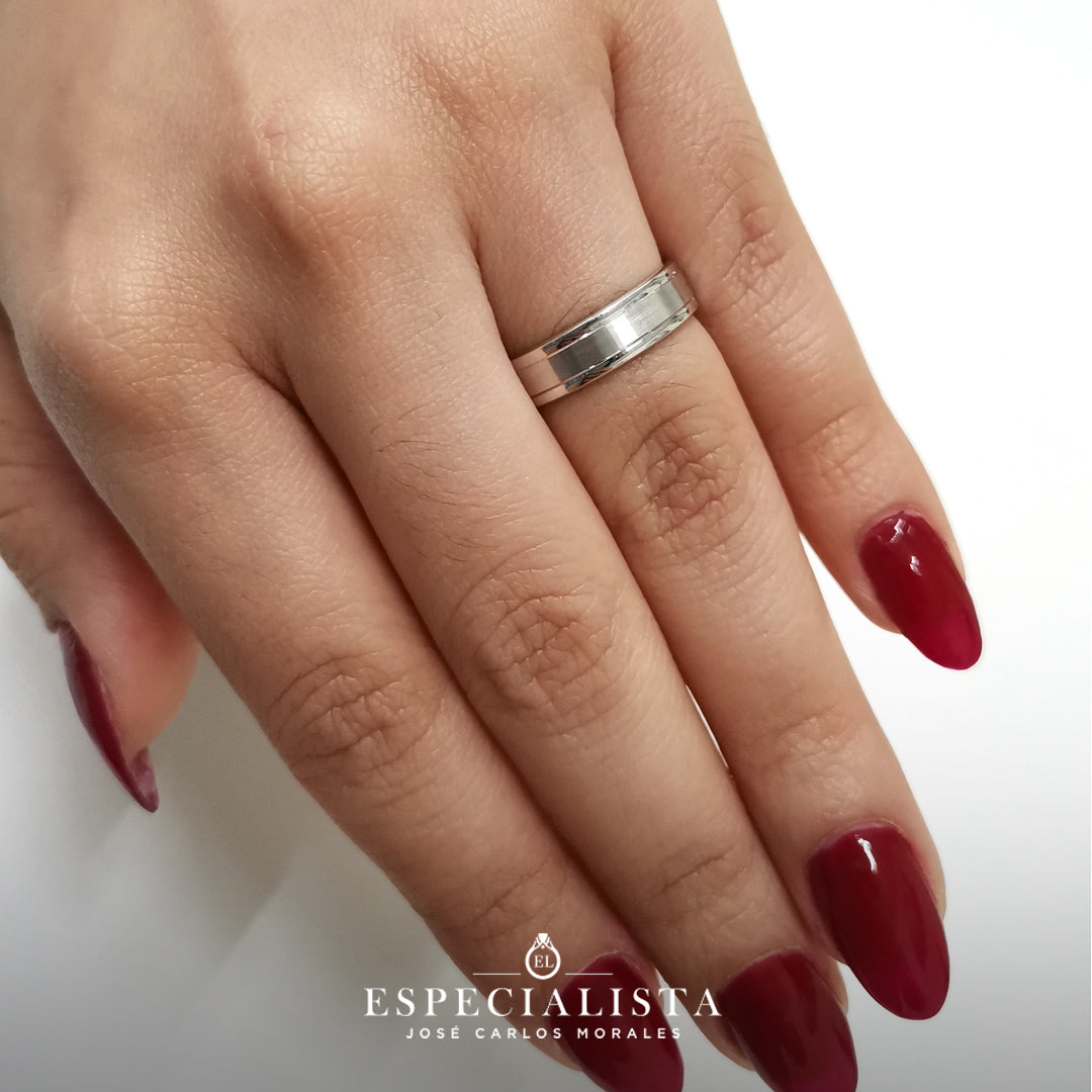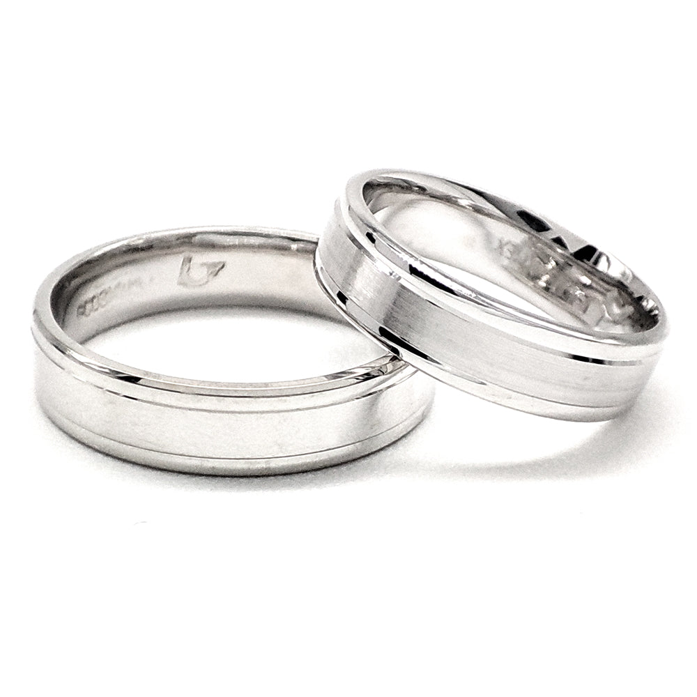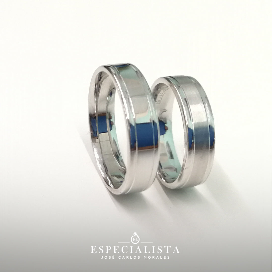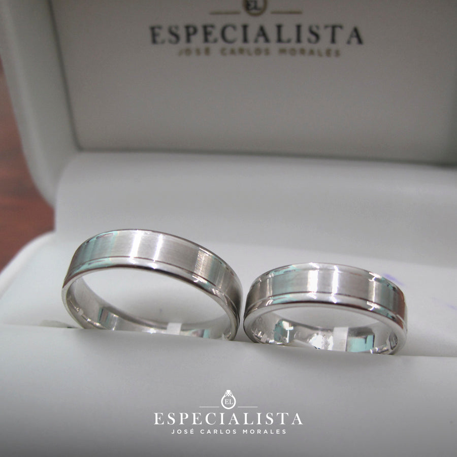 Par de Argollas de Matrimonio en oro blanco hechas con terminado mate lija al centro y con los biceles brillantes.