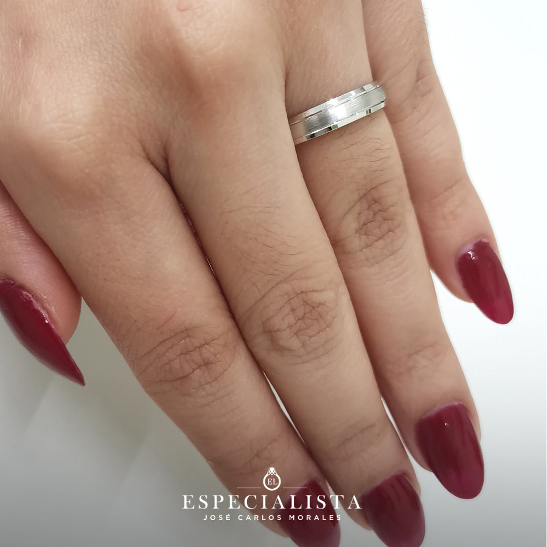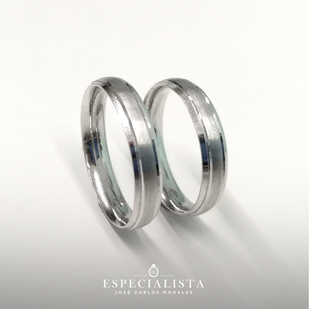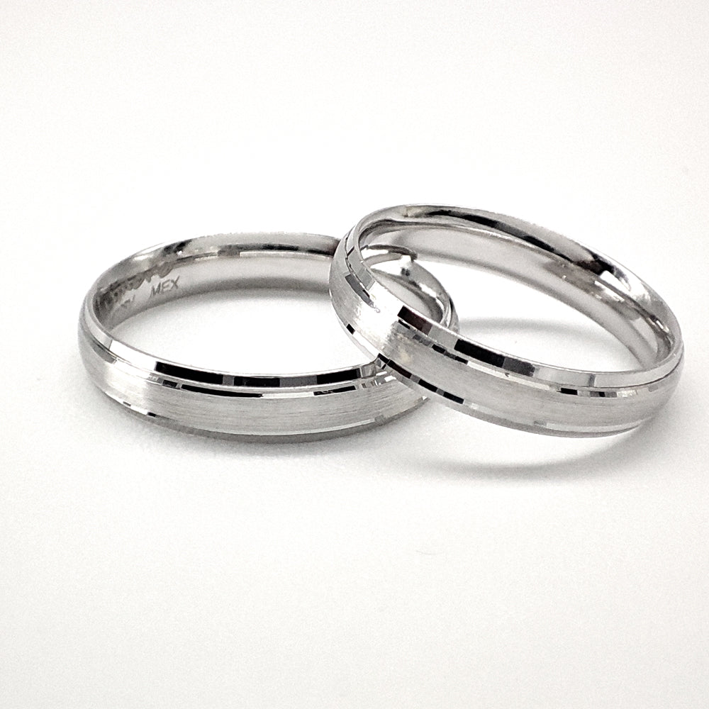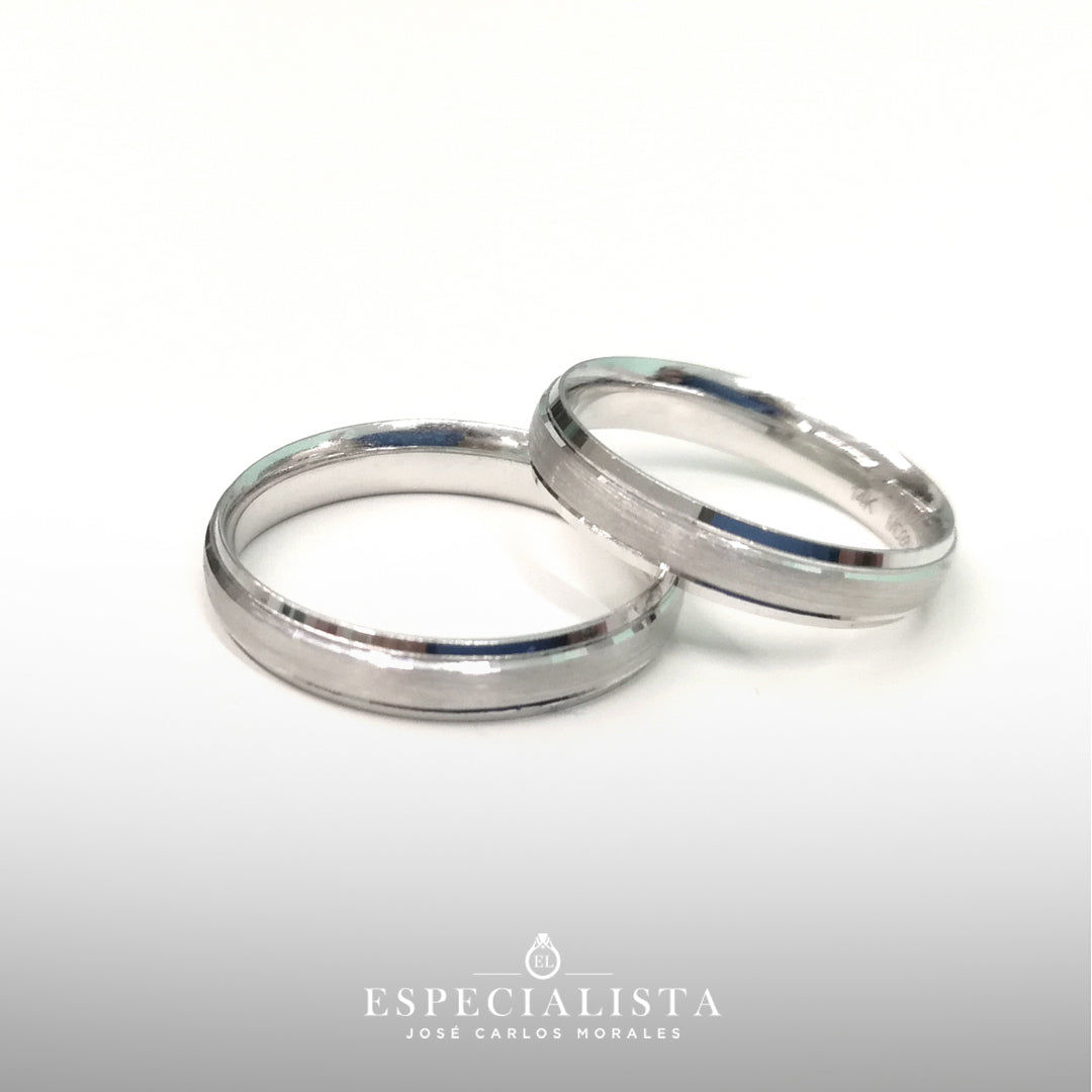 Par de argollas de matrimonio en oro blanco con biseles brillosos y centro matizado.
