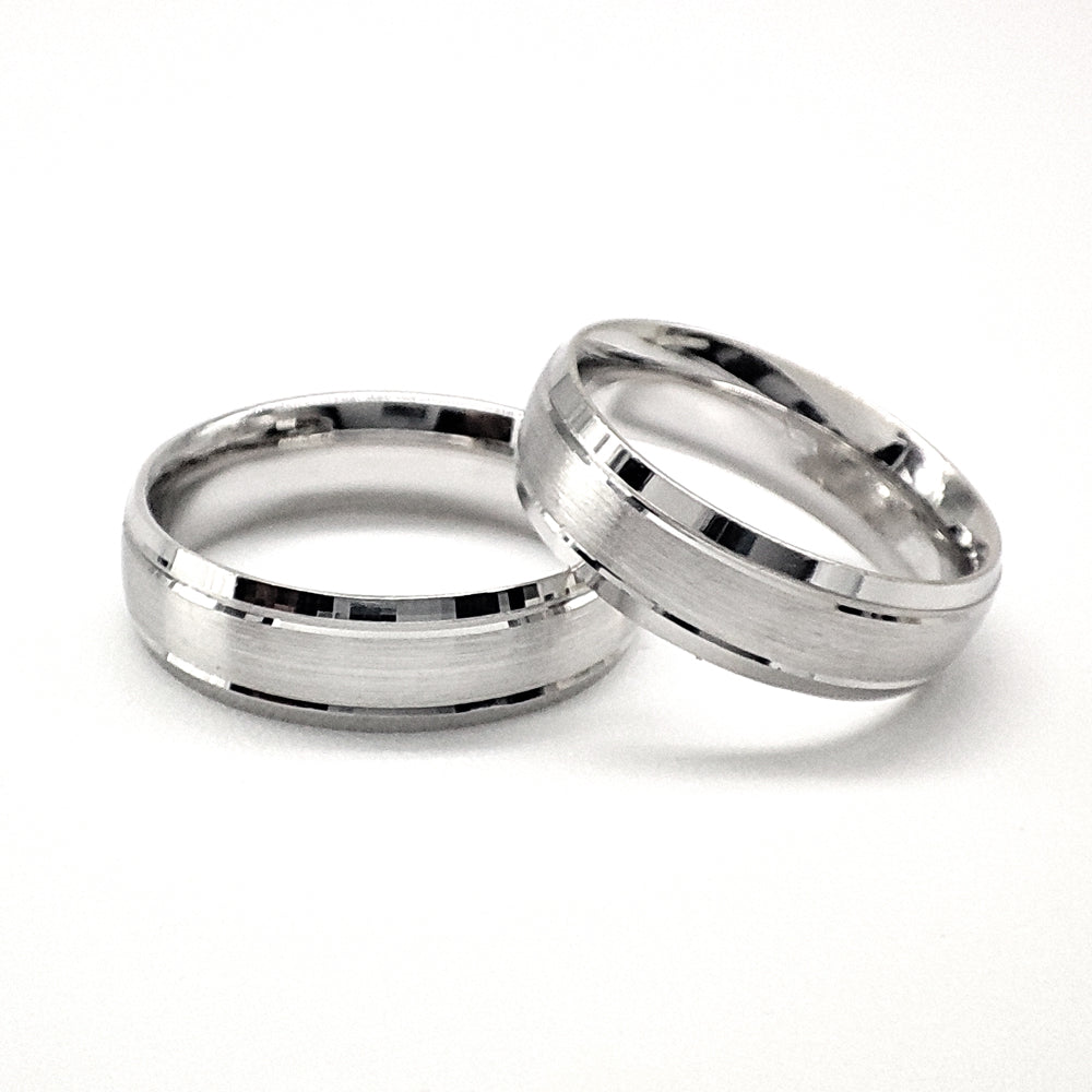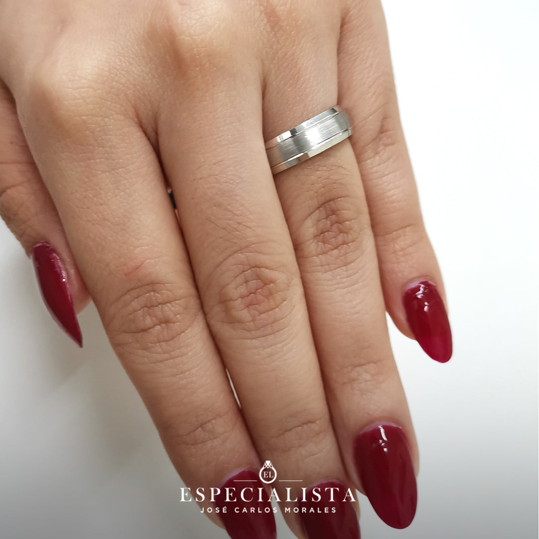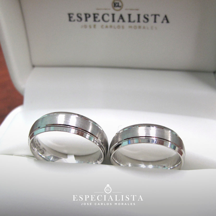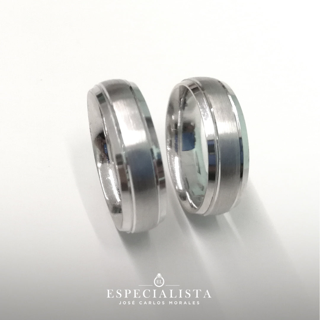 Par de Argollas de Matrimonio en oro Blanco diseño con línea mate al centro.