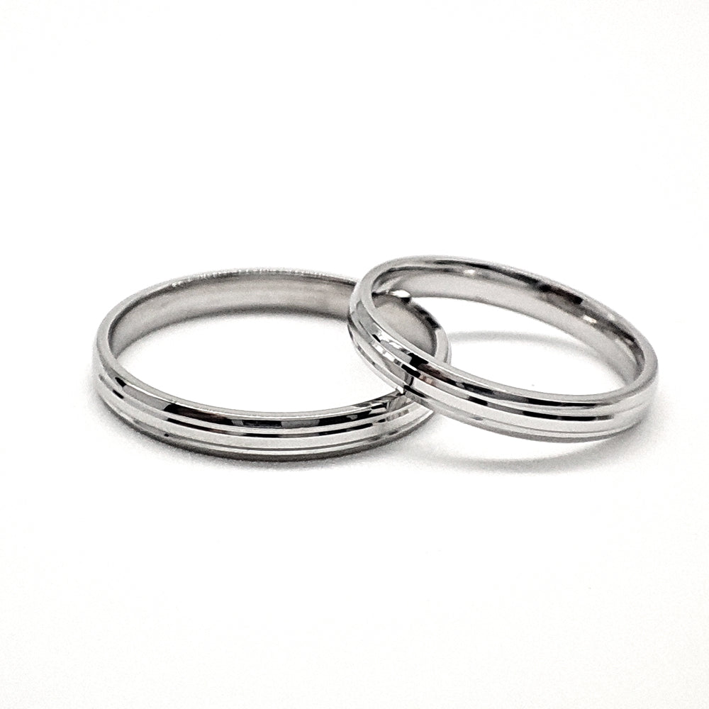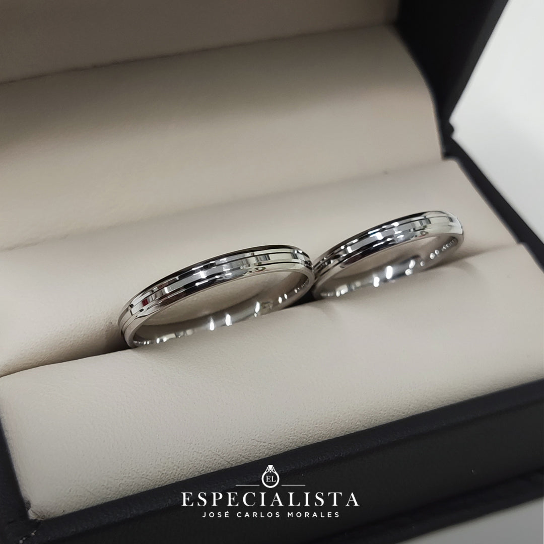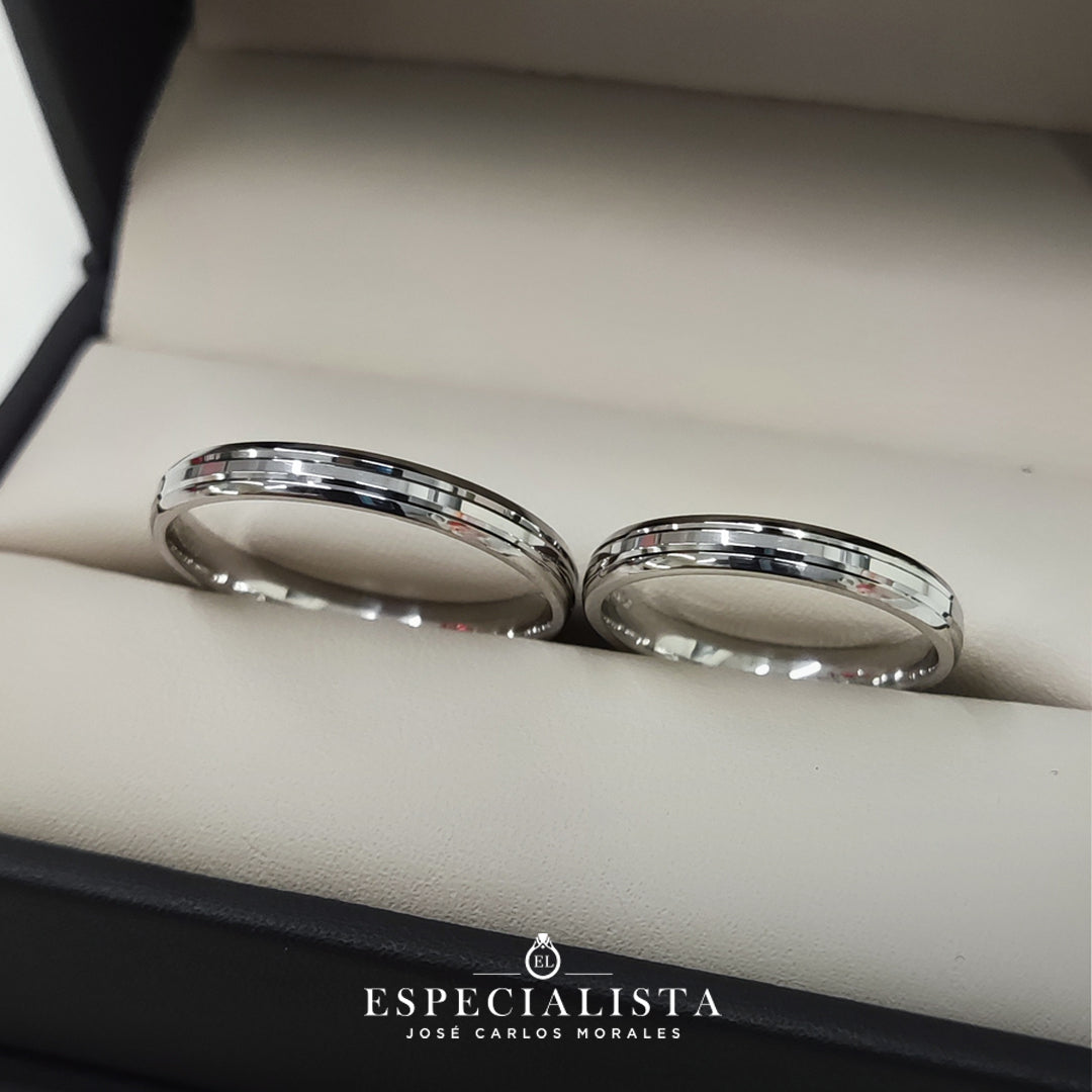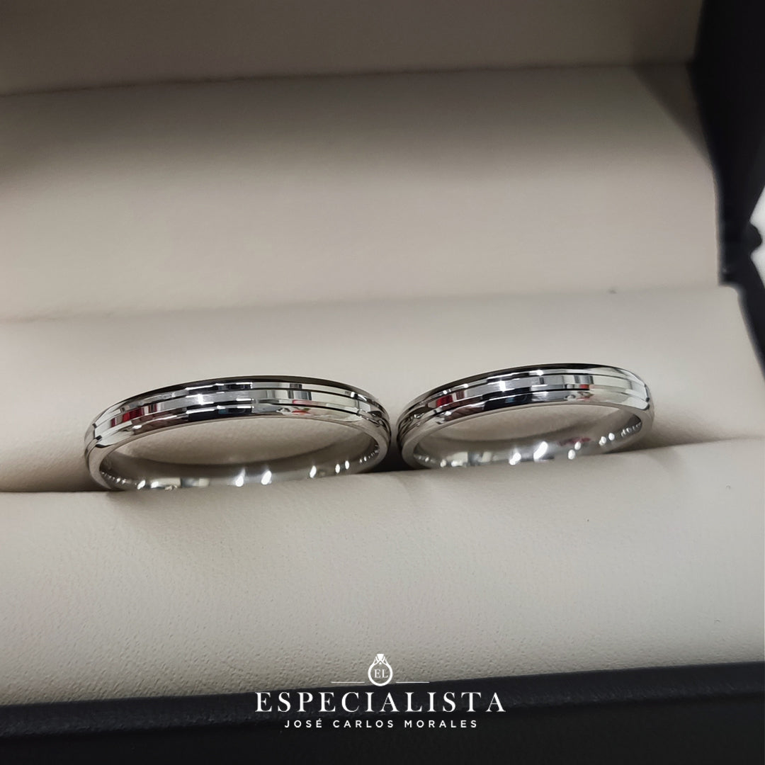 Par de argollas de matrimonio en oro blanco con dos canaletas brillosas.