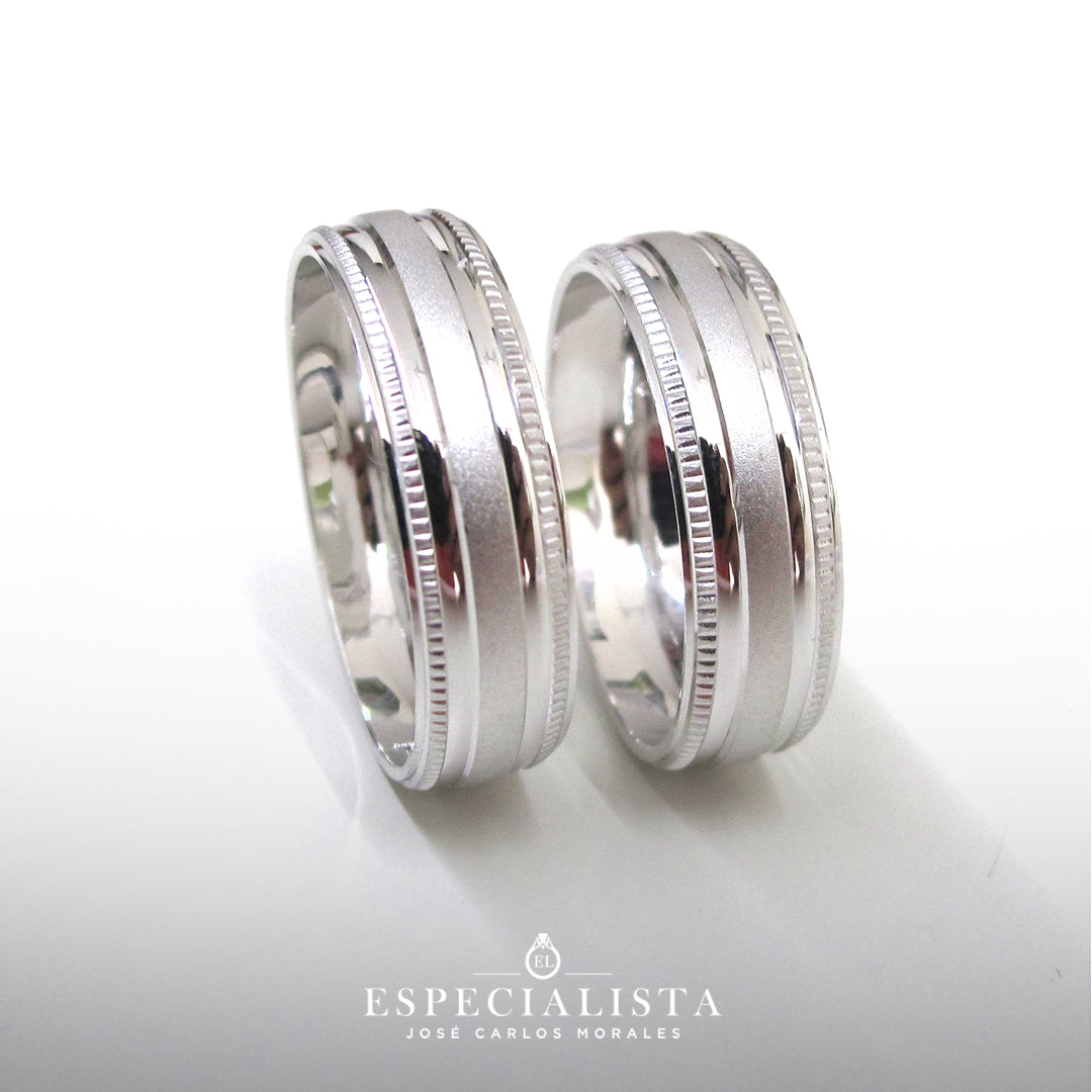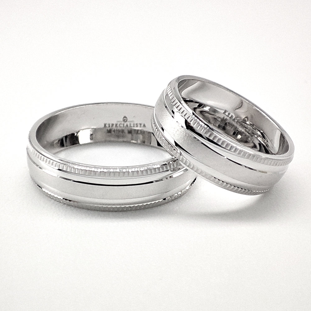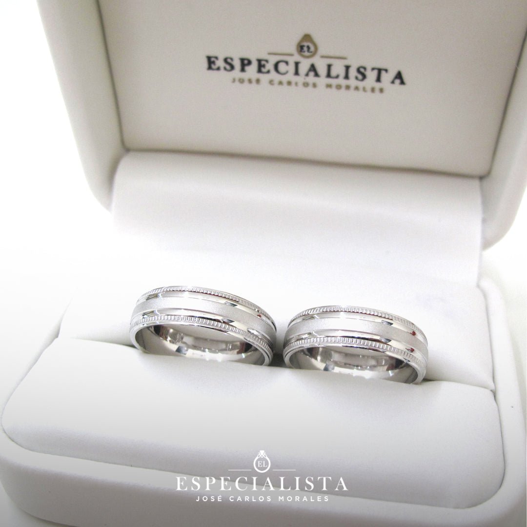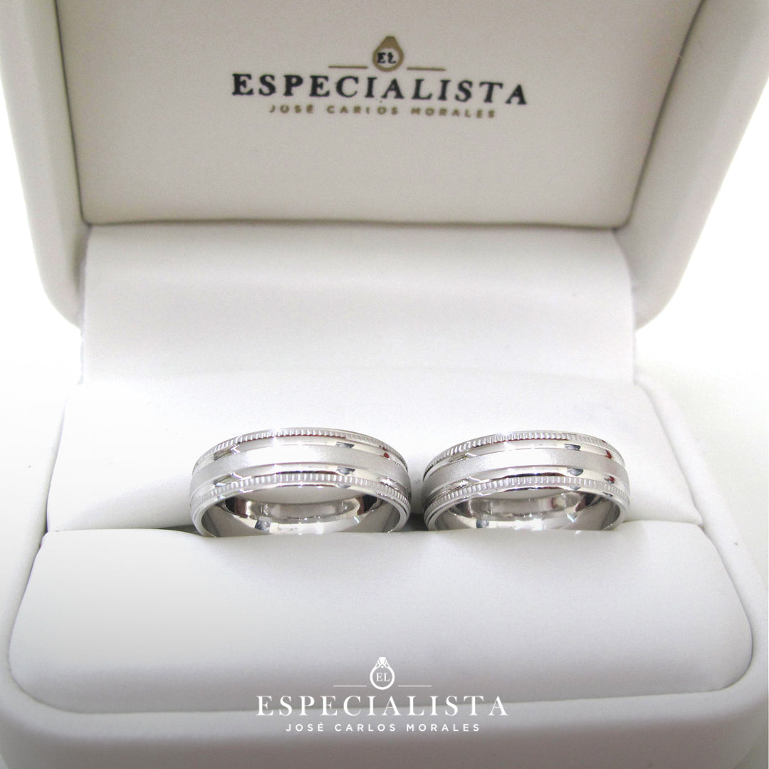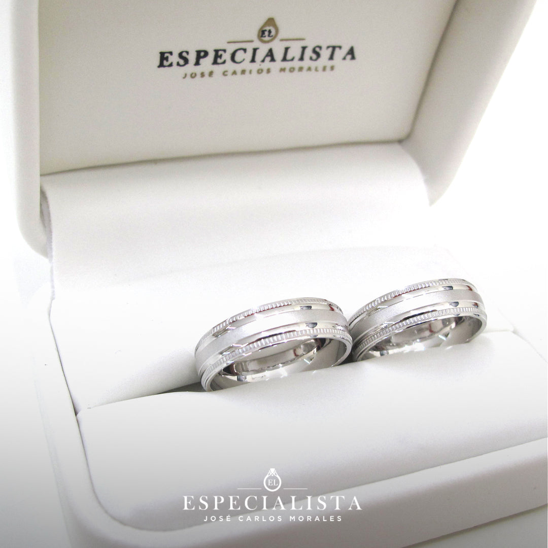 Par de Argollas de Matrimonio en oro Blanco, diseño en lineas delgadas mate.