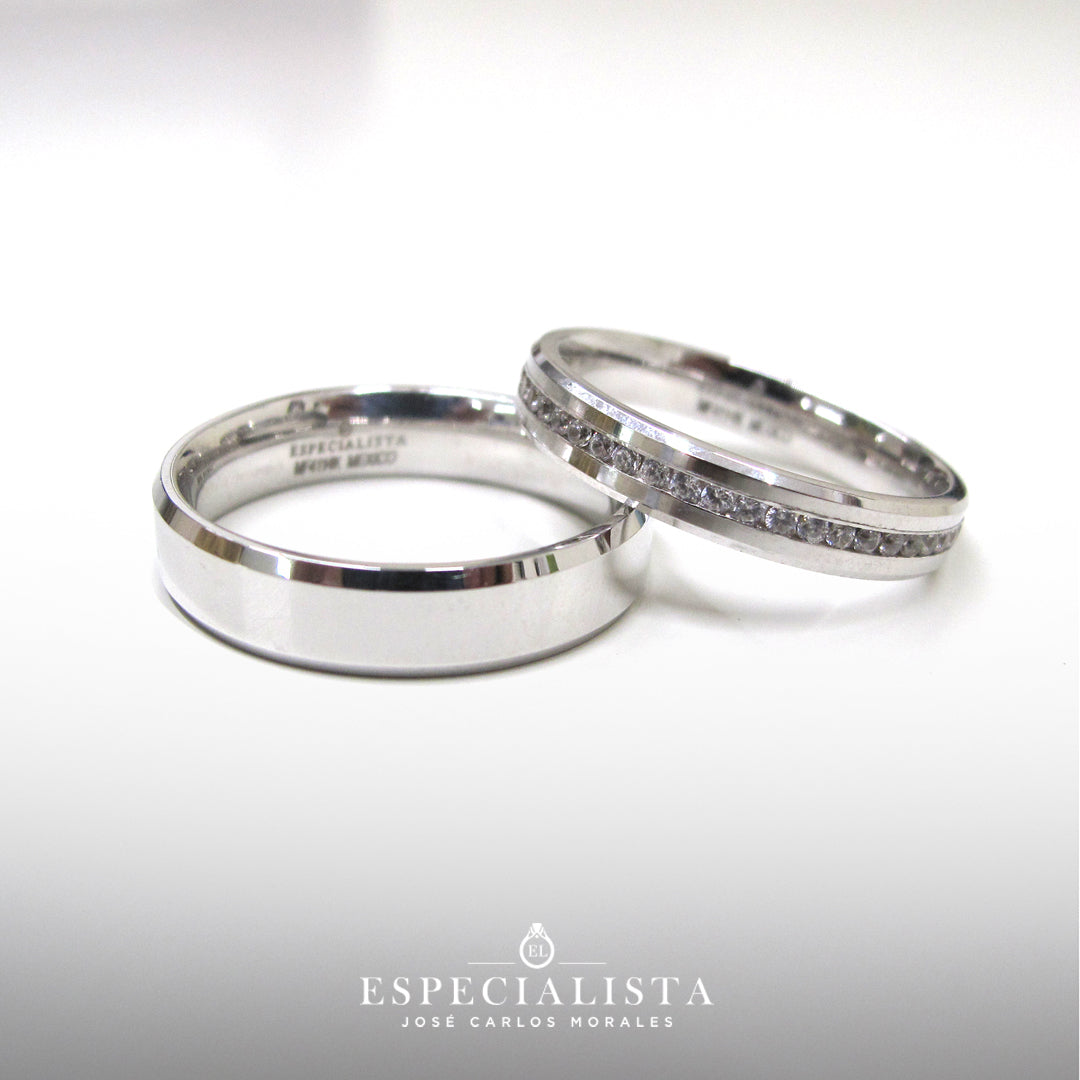 Par de argollas de matrimonio con biceles y circonias al centro en la argolla de dama.