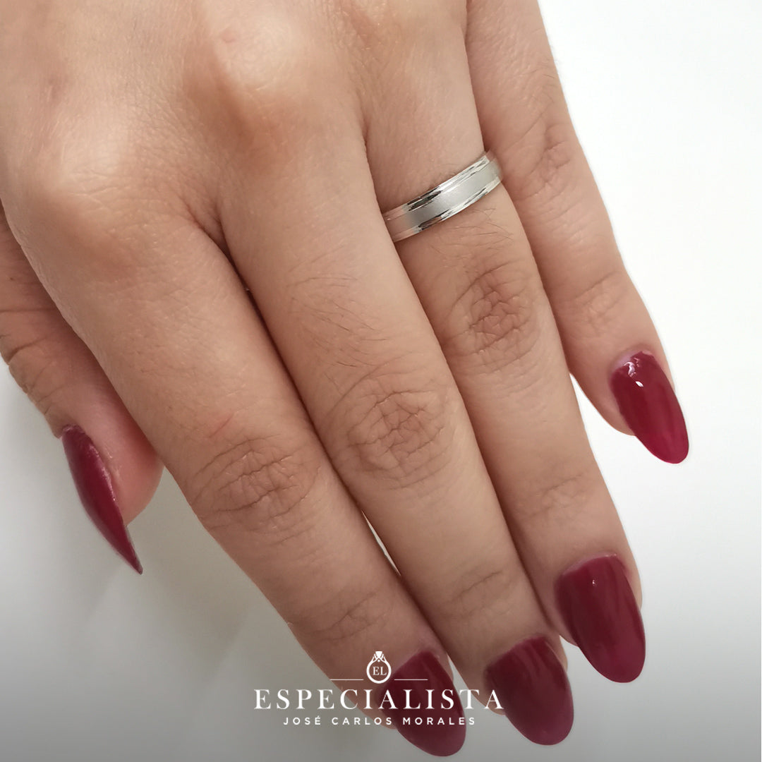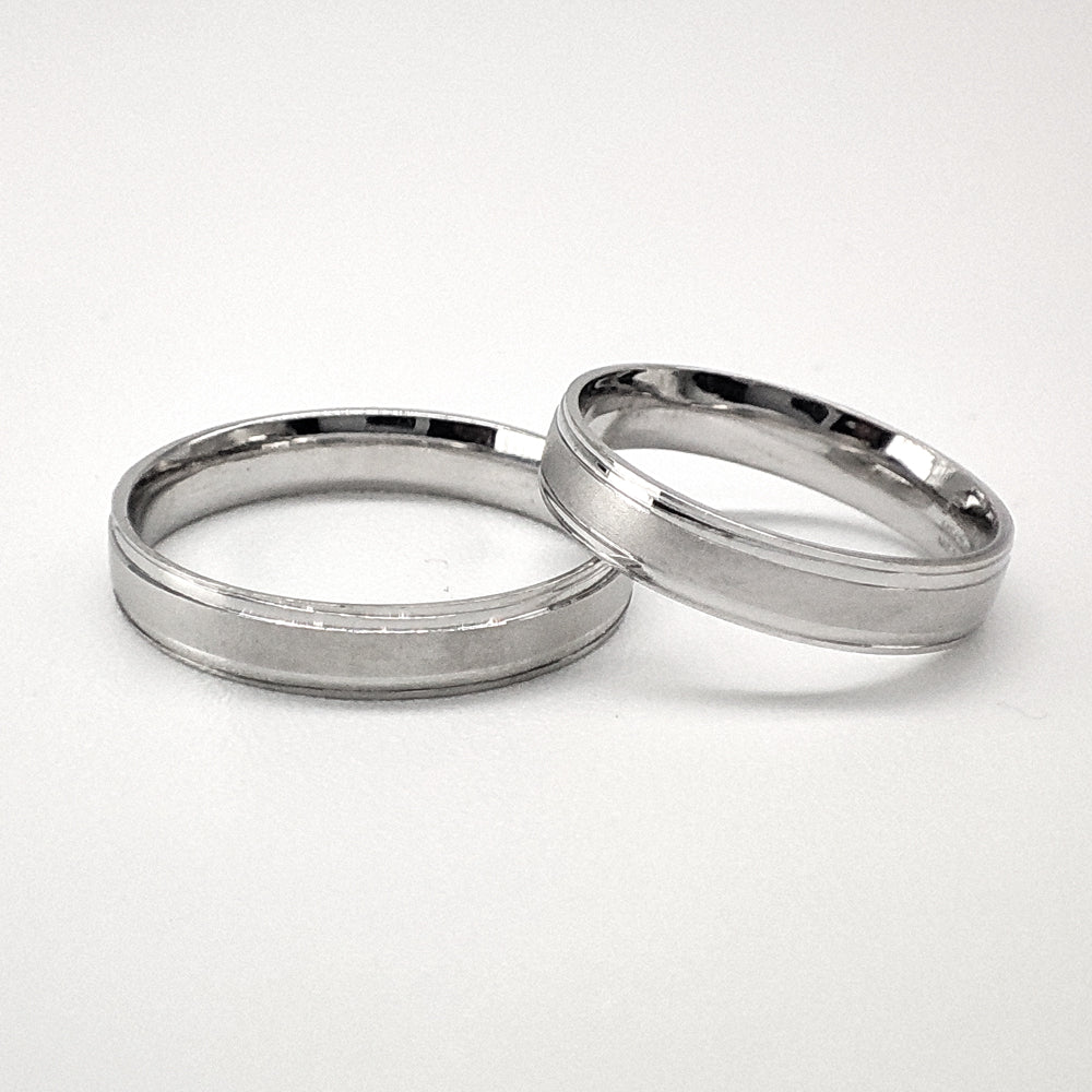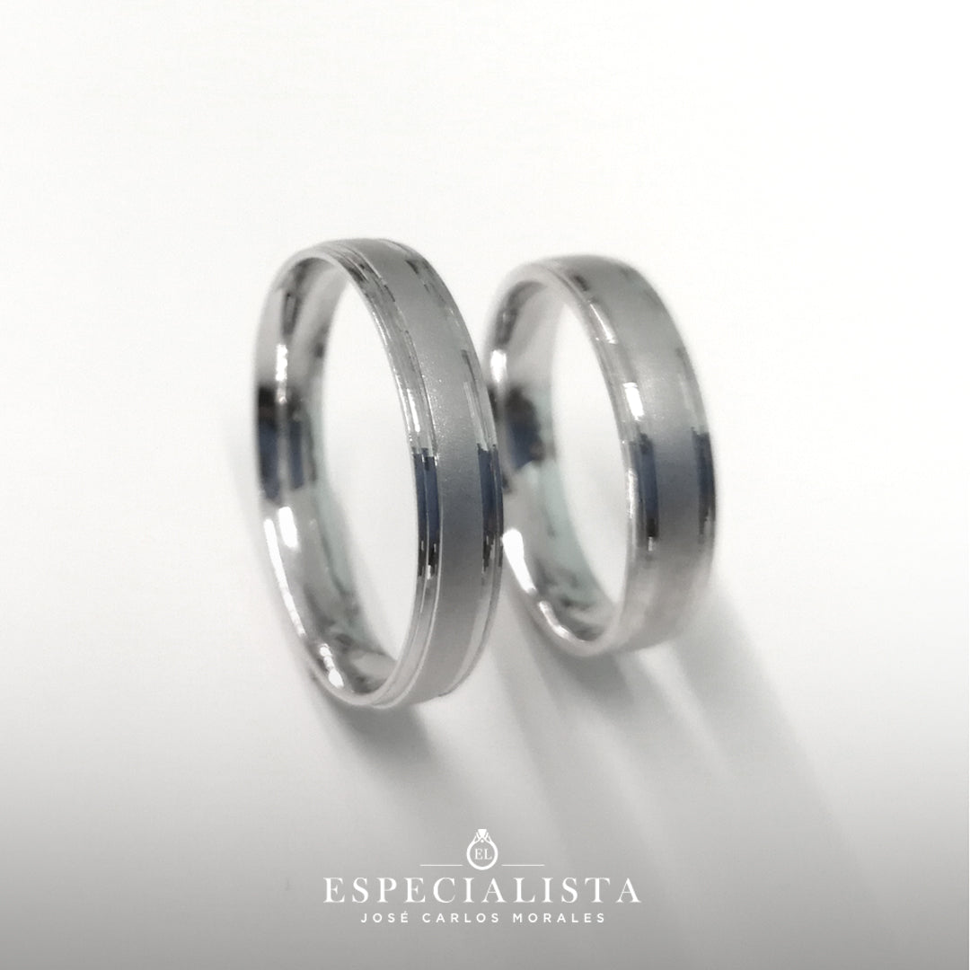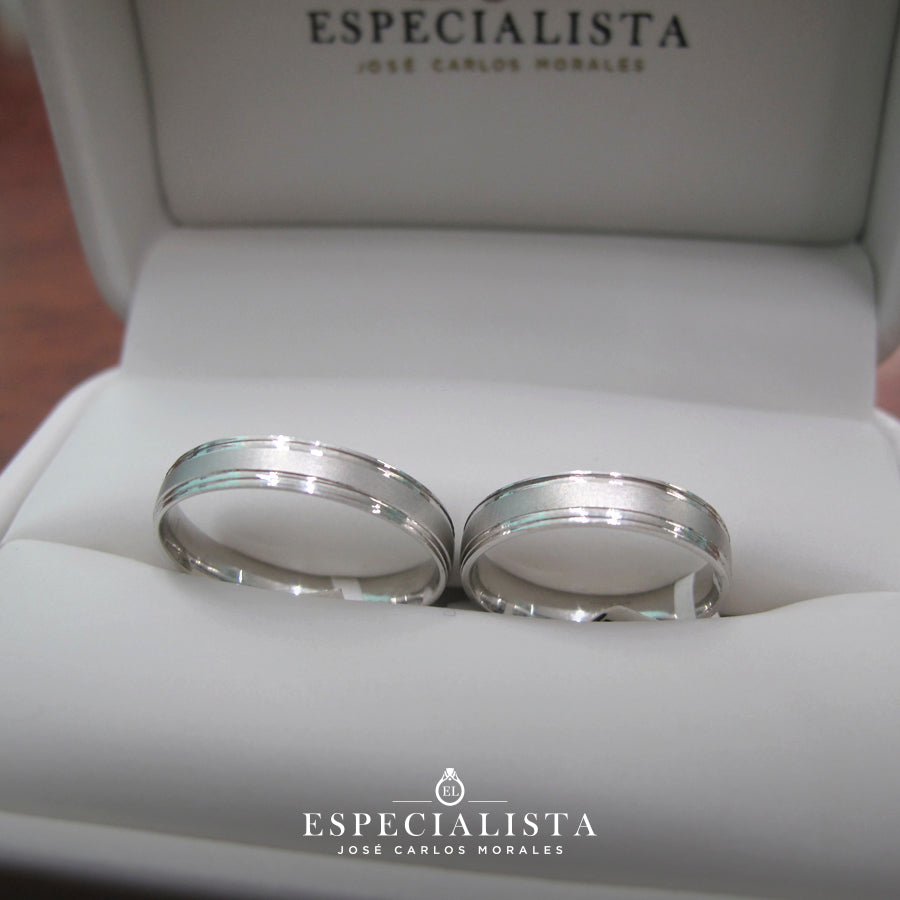 Par de argollas de matrimonio en oro blanco, diseño en línea delgada mate.