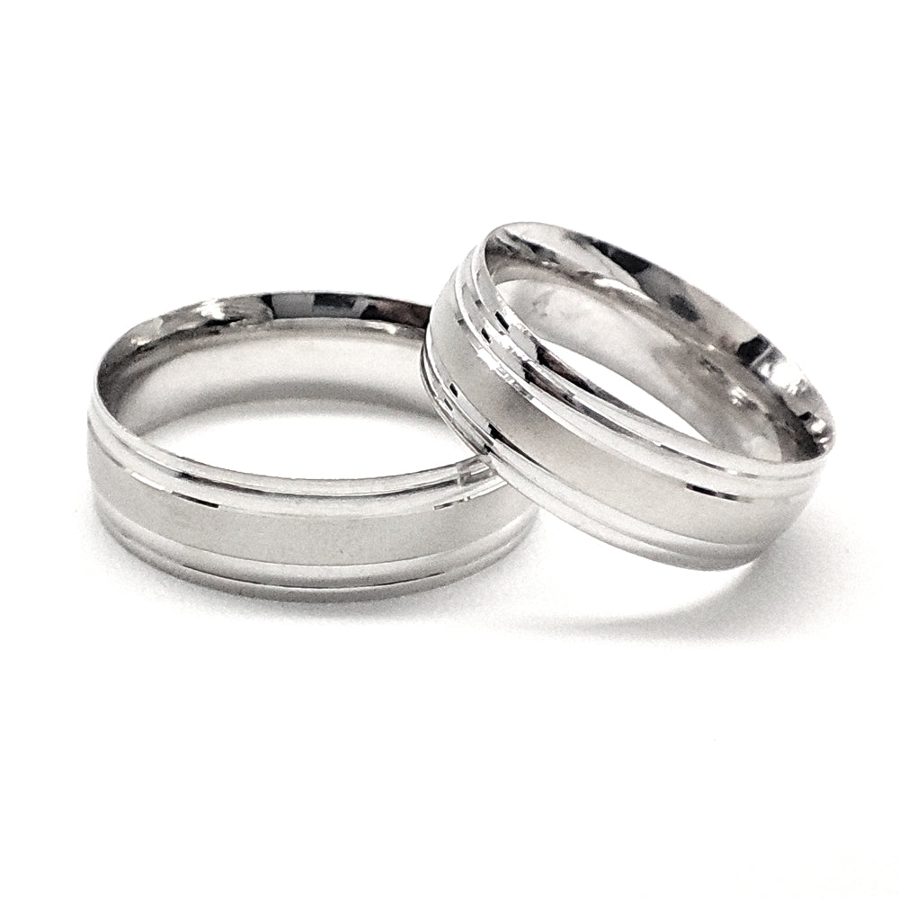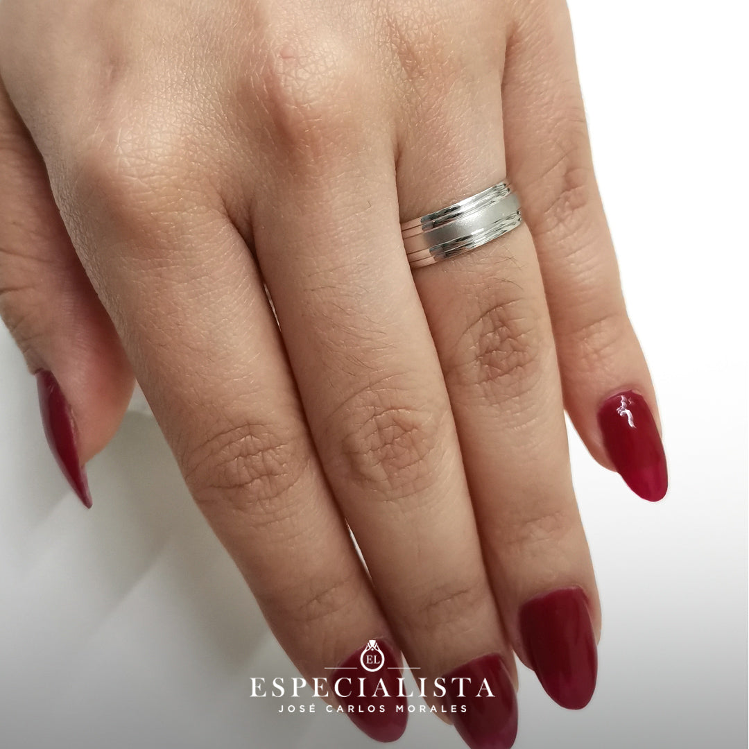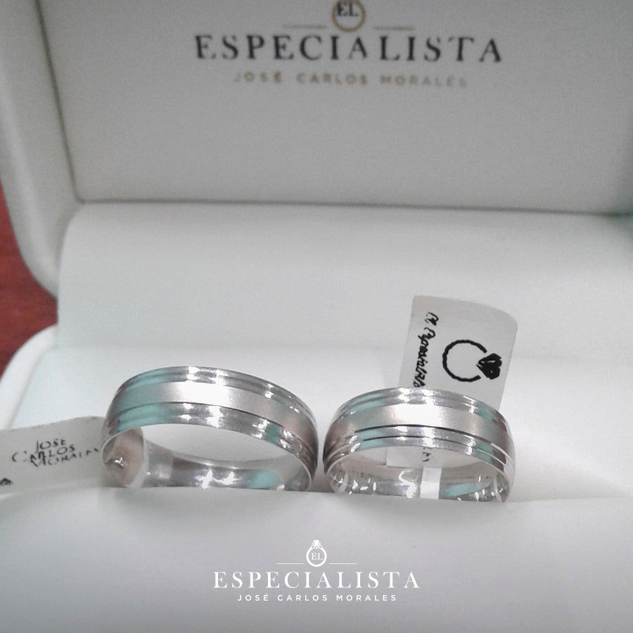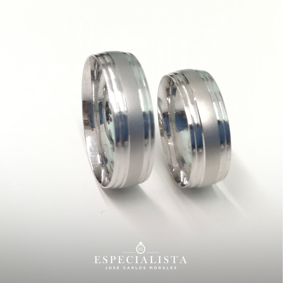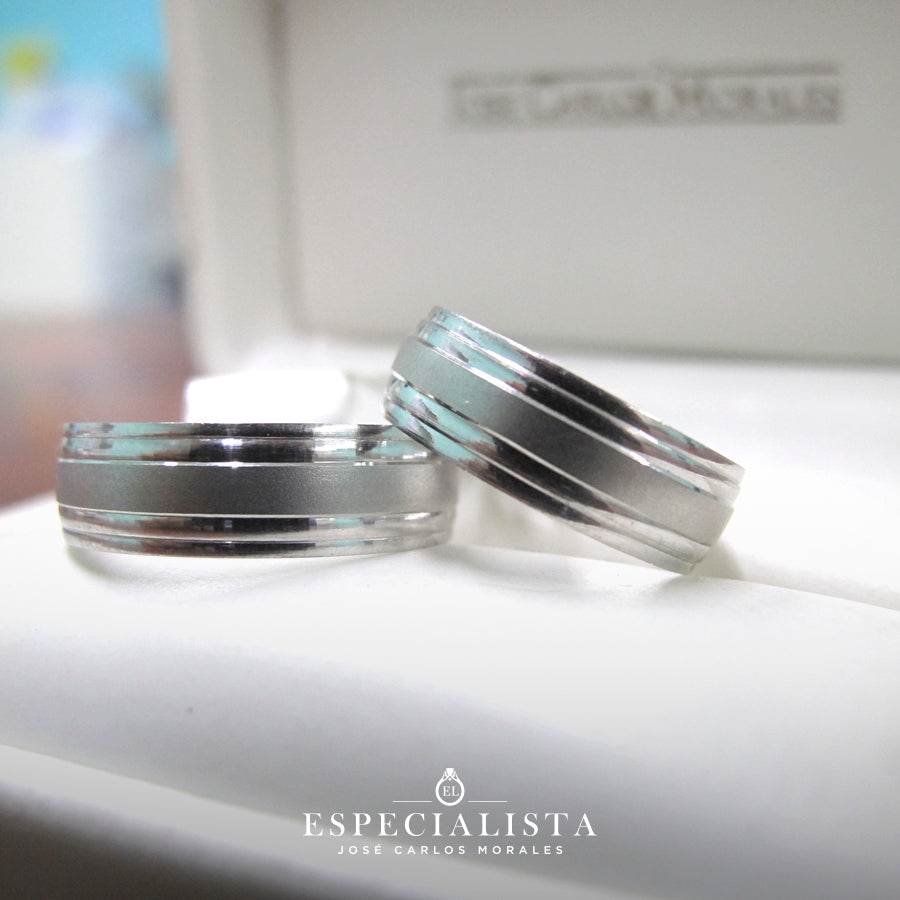 Par de argollas de matrimonio en oro blanco con centro matizado y dos lineas brillantes a cada costado.