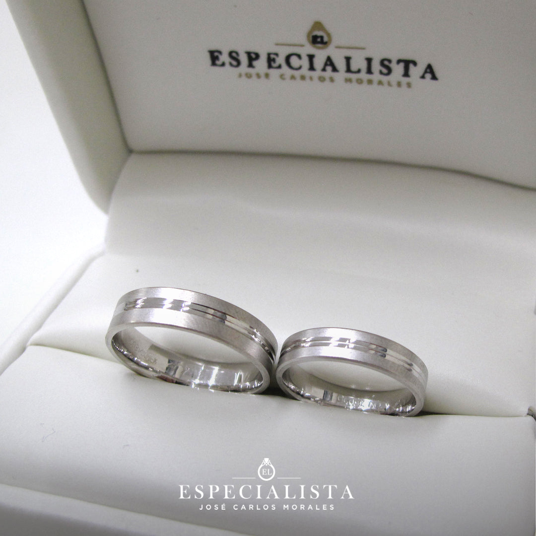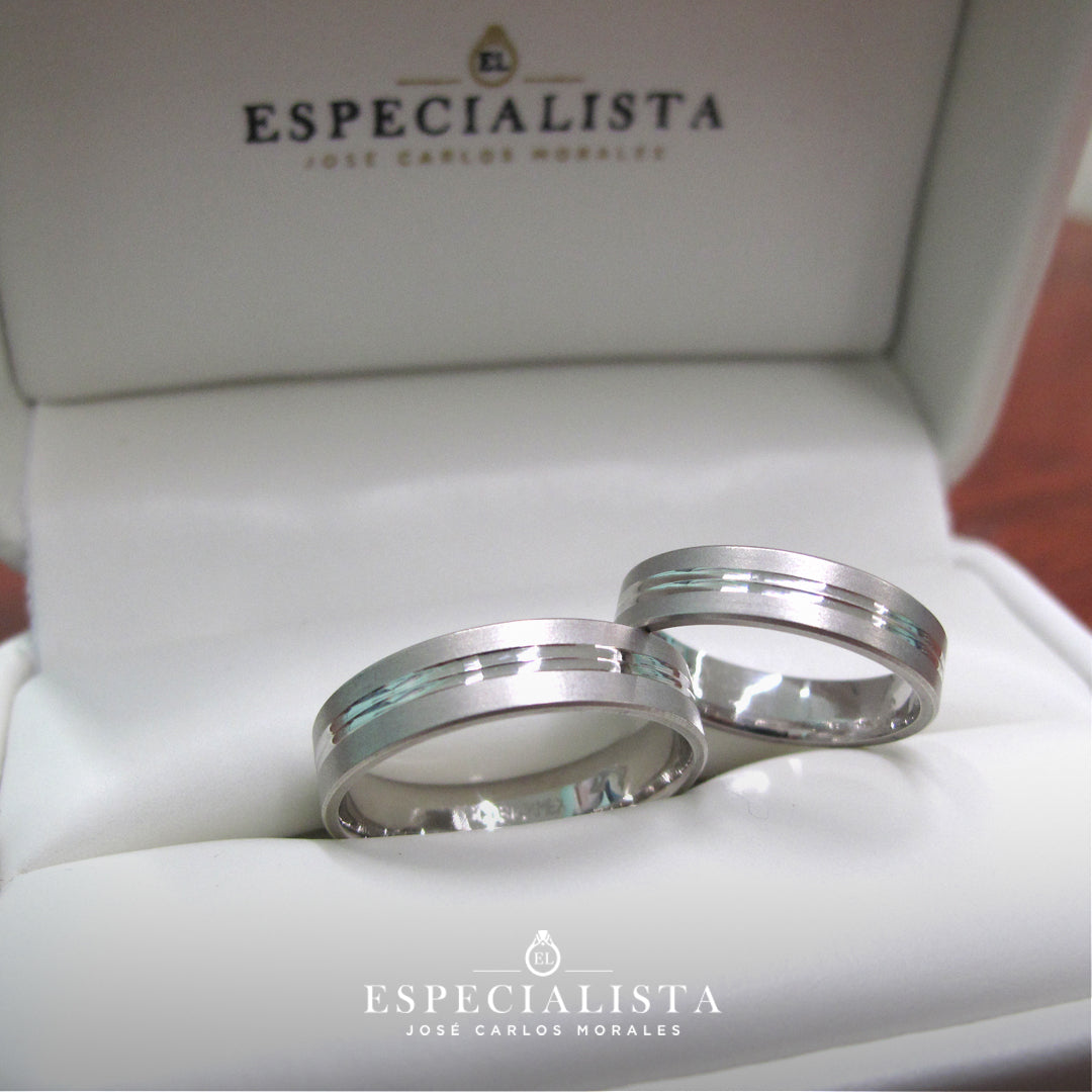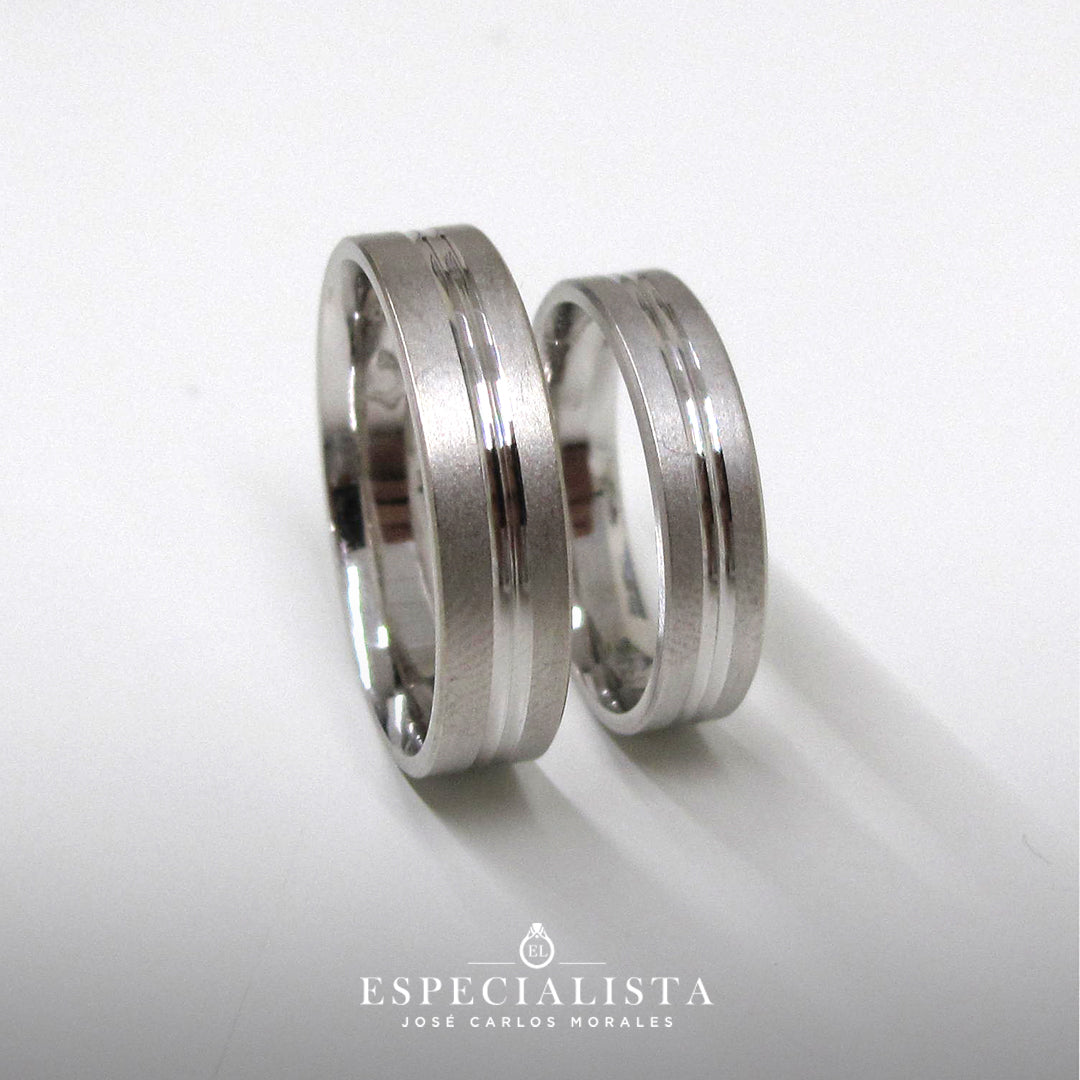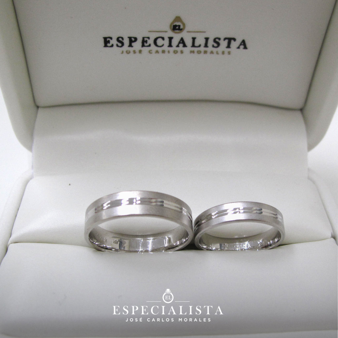 Par de Argollas de Matrimonio en oro blanco acabado central mate y dos finas líneas centrales.