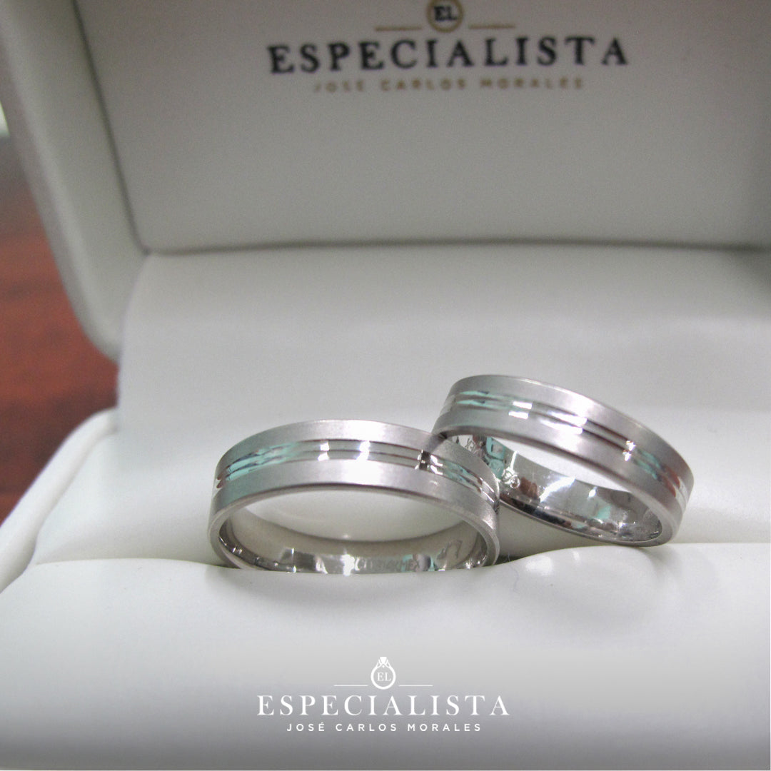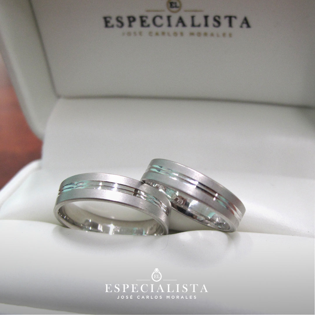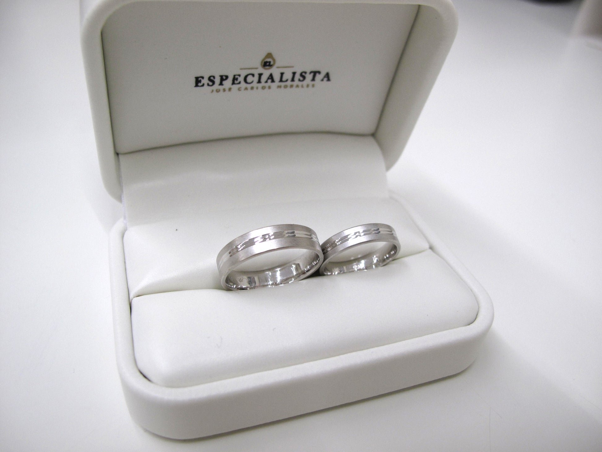 Par de Argollas de Matrimonio en oro blanco acabado central mate y dos finas líneas centrales.