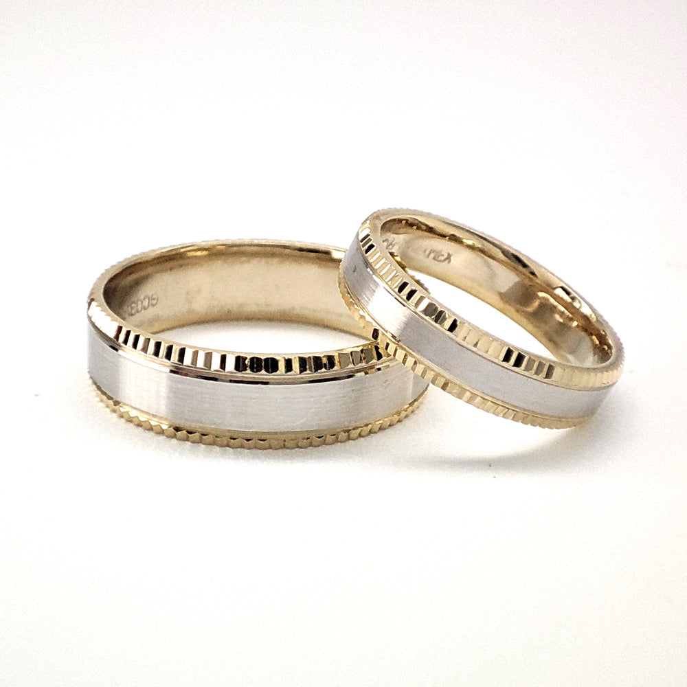 Argollas de matrimonio en oro combinado de 14 kilates con acabado central mate y biseles brillantes.