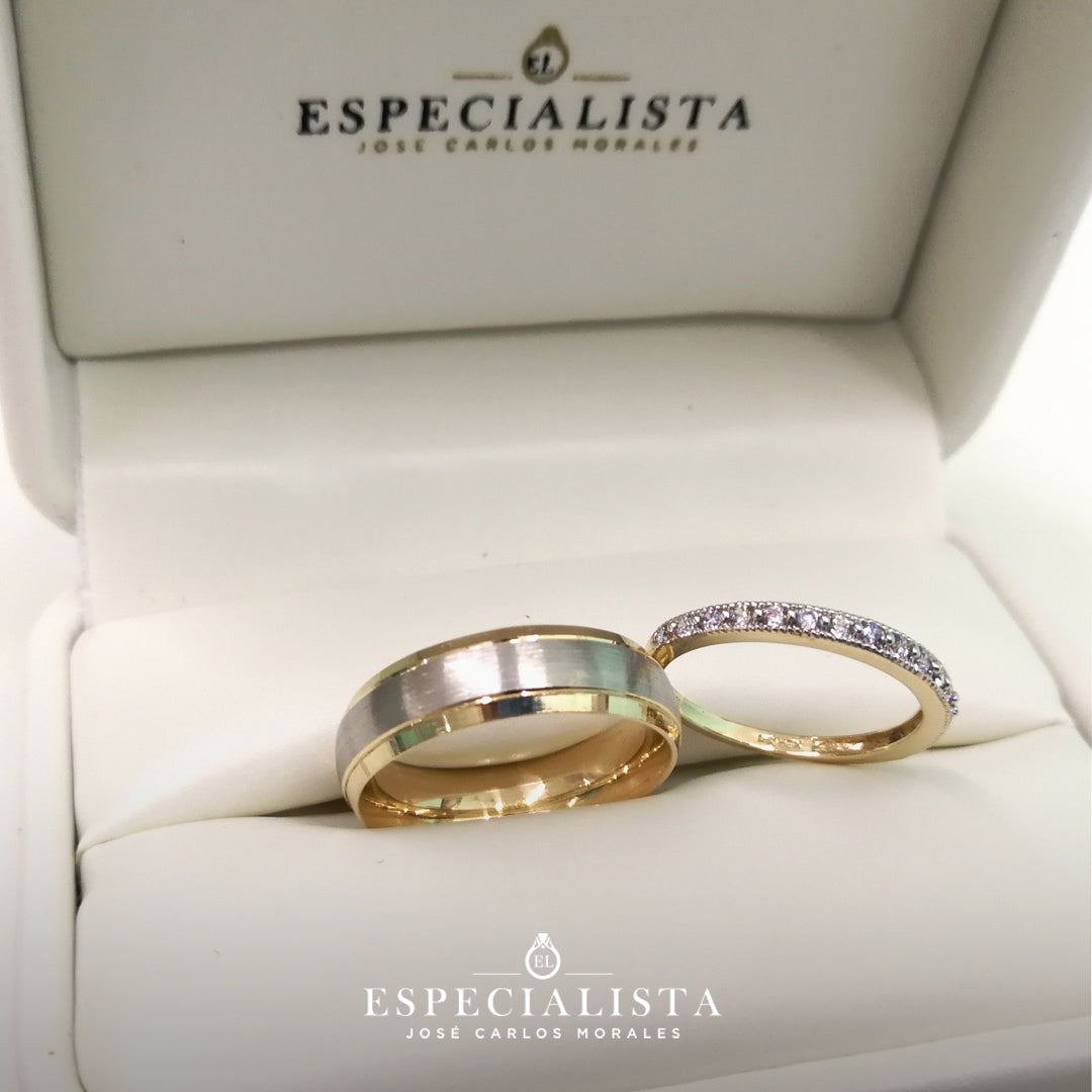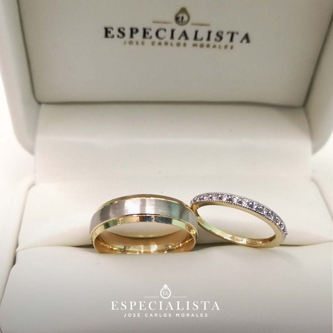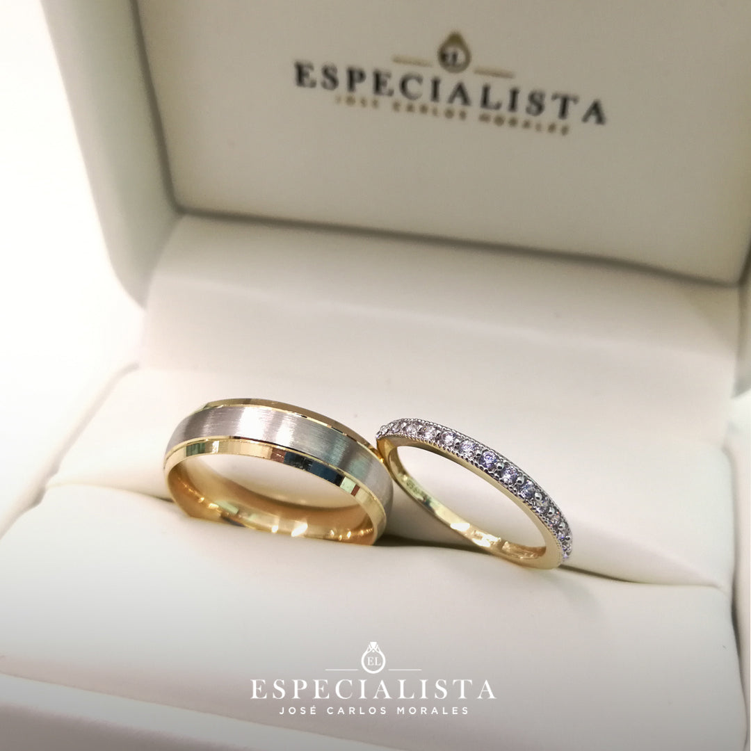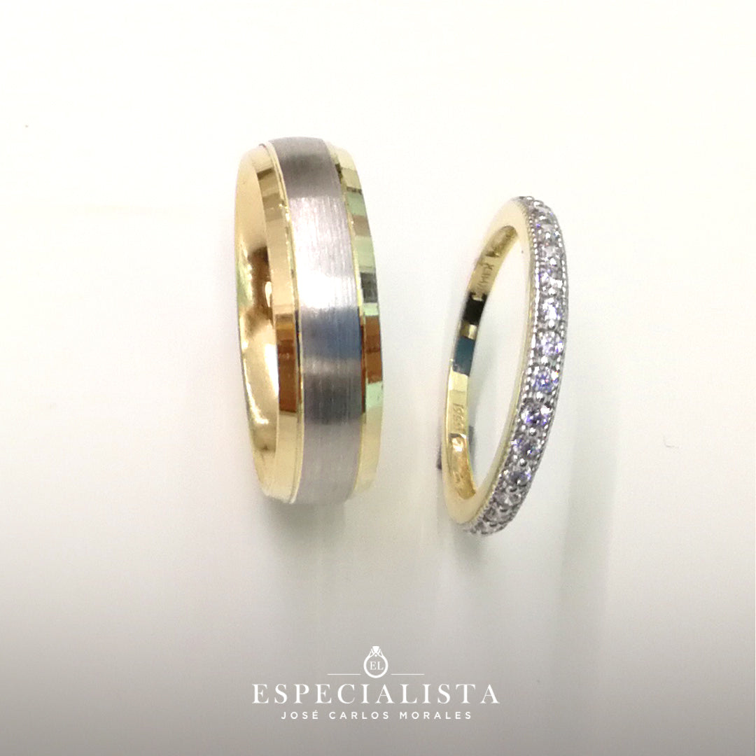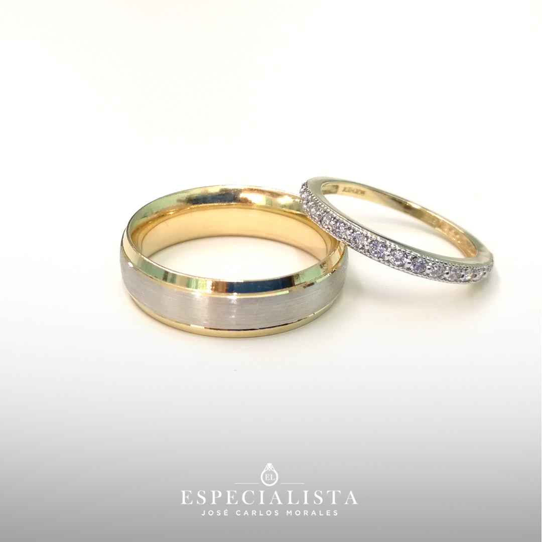 Argolla de matrimonio combinada en oro blanco de 14 Kilates y biseles en oro amarillo, junto con una hermosa y delicada churumbela en oro amarillo de 14 kilates con detalles blancos en la zona montada de circonias importadas de alta calidad.