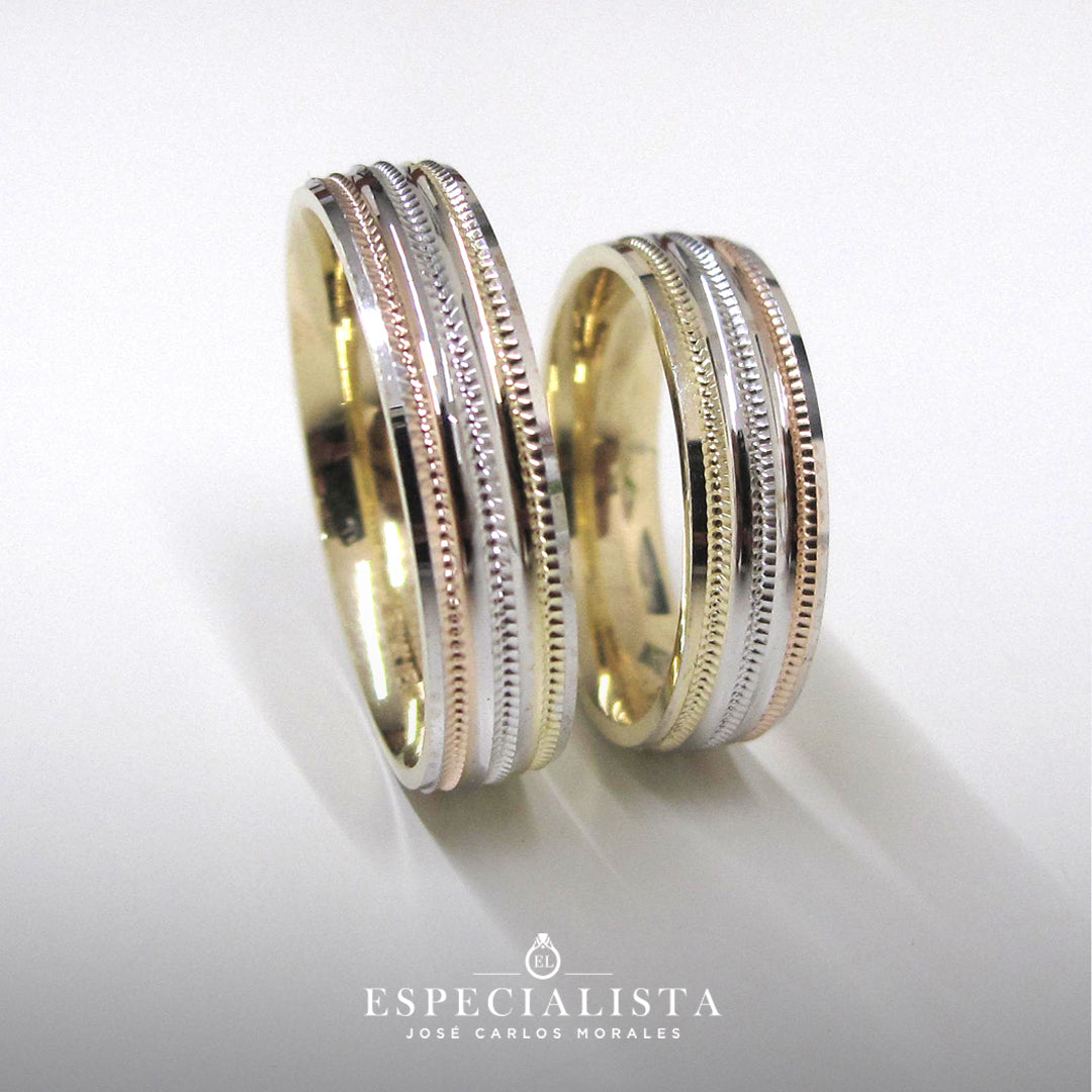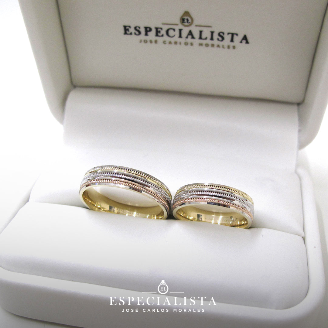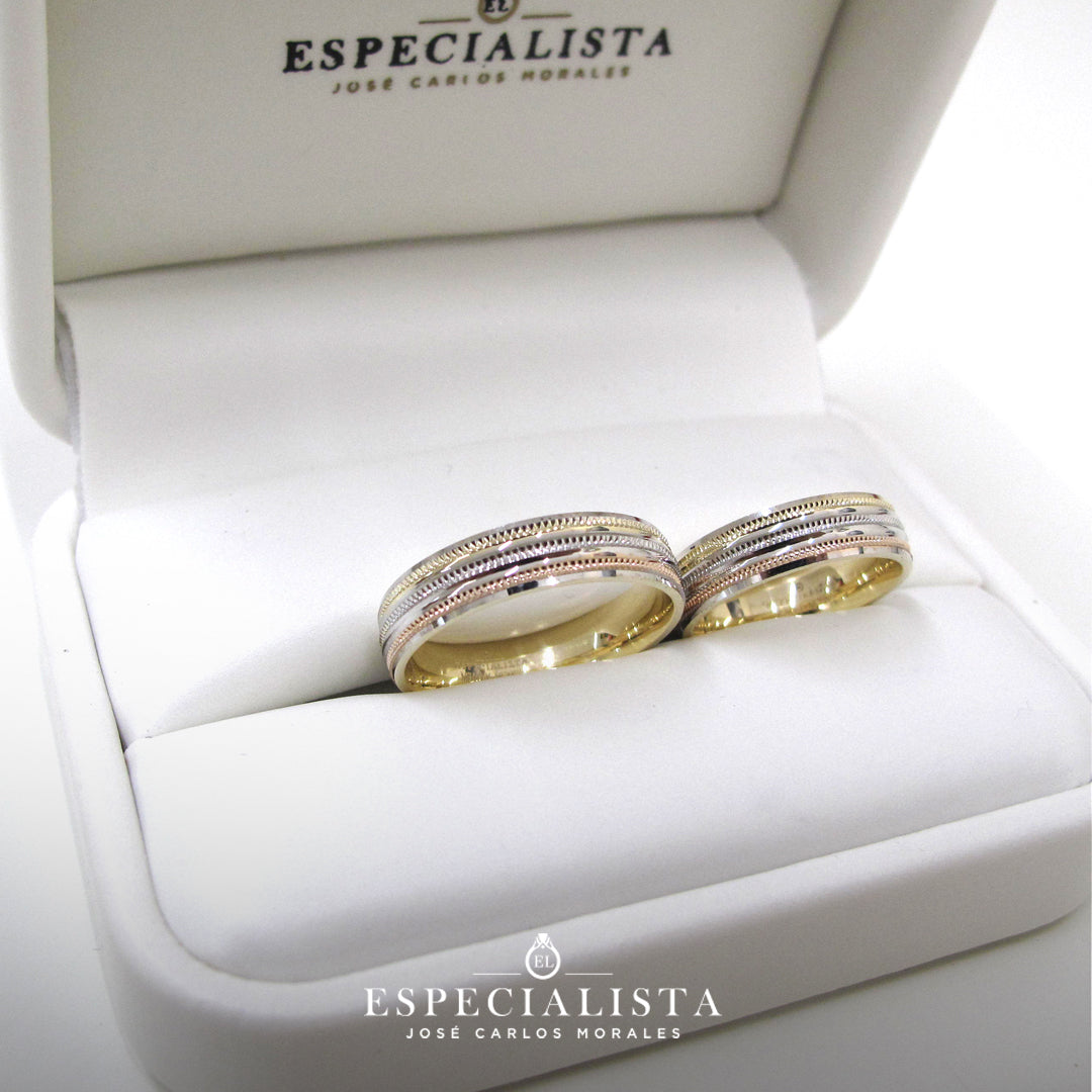 Par de Argollas de Matrimonio en oro combinado en blanco, amarillo y rosa.